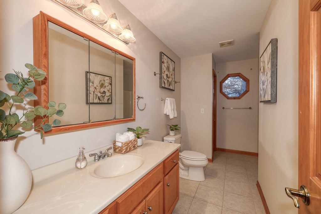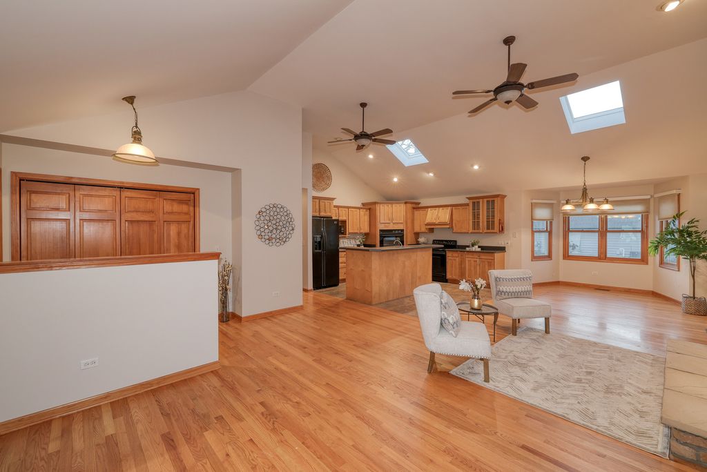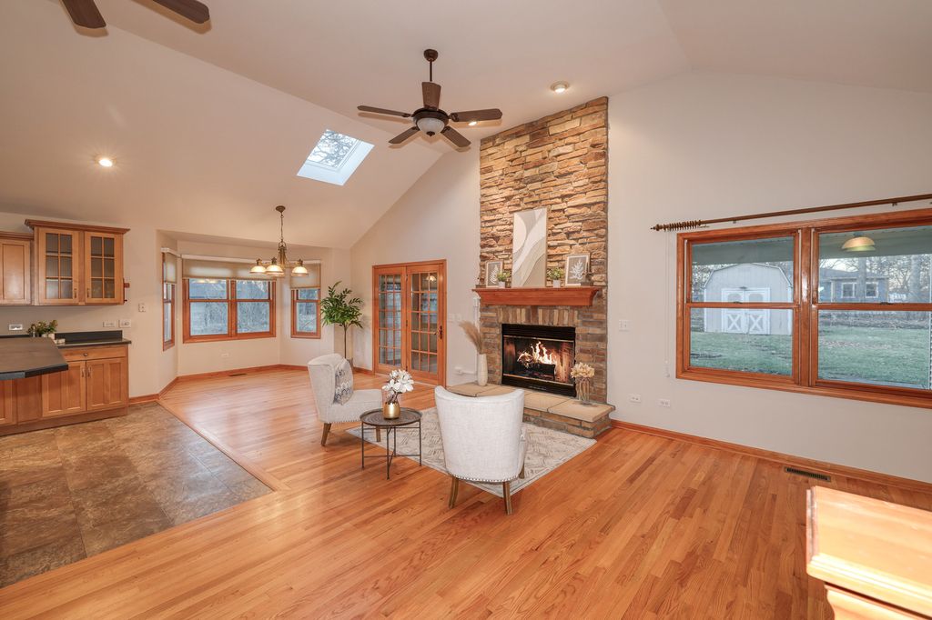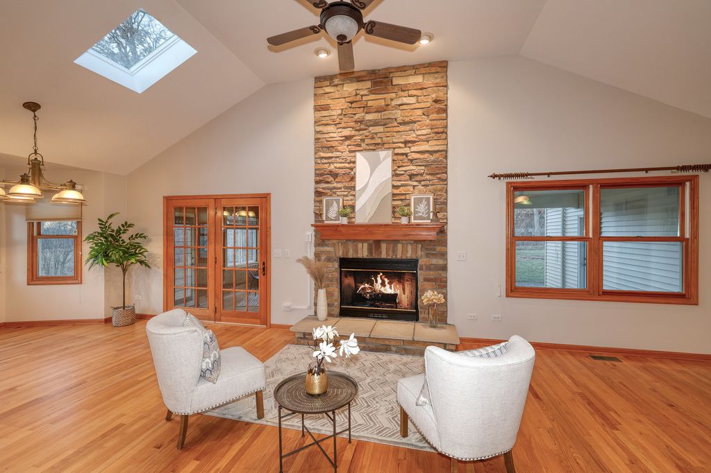Set on a generous .67-acre corner lot in a highly desirable location, this inviting ranch home is pure quality. It offers space, flexibility, comfort and privacy. The main level features an open floor plan with cathedral ceilings, skylights and hardwood floors. The living room boasts a cozy gas stone fireplace creating a warm and welcoming setting. The large kitchen is designed to impress with a large working island and plenty of eating space. With a spacious master suite and two additional bedrooms on the main level plus two full baths you have plenty of space for all your needs. Downstairs, the finished basement expands your living options with a generous family room, complete with a wet bar and plenty of space for gatherings, movie nights, or a comfortable setup for grandparents / grandkids or extended family. The lower level also includes an additional bedroom and full bathroom, along with lots of storage to keep everything organized.The screened-in porch-perfect for morning coffee, outdoor dining, or relaxing while overlooking the spacious yard. With four bedrooms total (three on the main level, one in the basement) and three full bathrooms, this home offers the ideal blend of function and flexibility. Roof, gutters and vinyl siding 2025. Water Heater 2022. Furnace and humidifier 2021, Freshly painted in 2026. AC is original.
