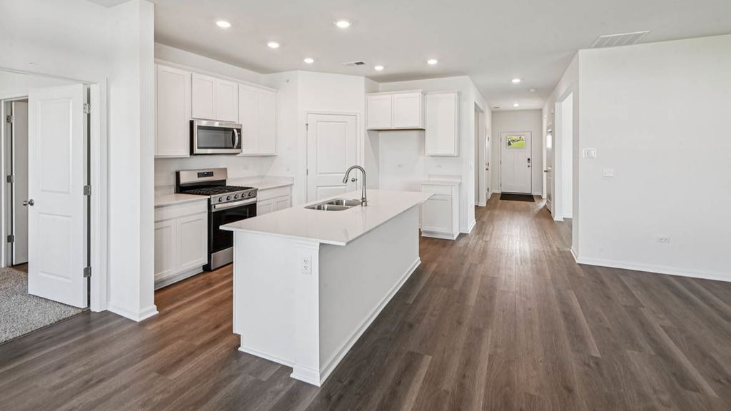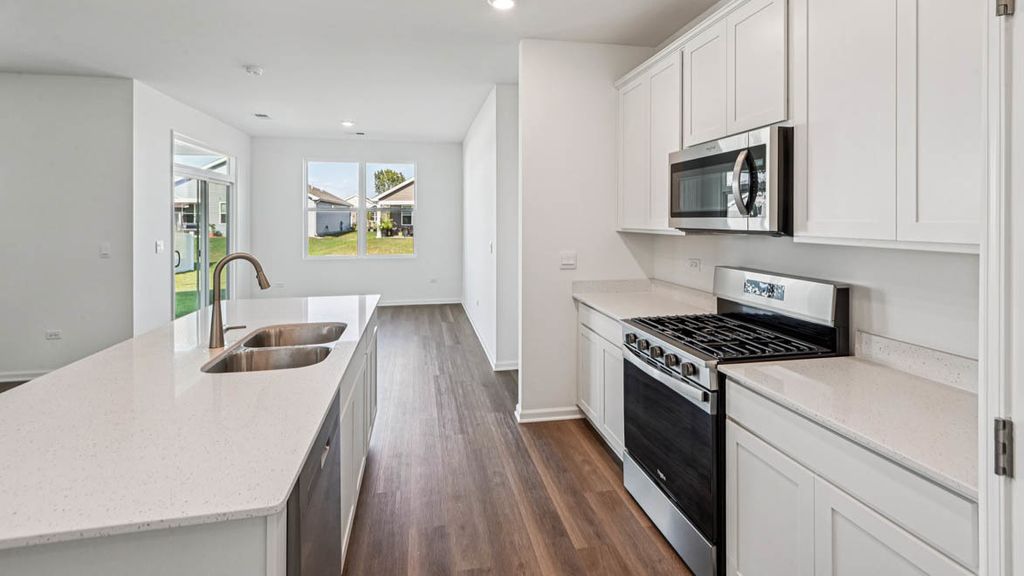 Envision yourself at 1228 Wild Tulip Circle in Bartlett, Illinois, a beautiful new home in The Grasslands community. This ranch home is move-in ready NOW! Scenic homesite includes a fully sodded yard and covered back patio. The Bristol floor plan offers 1,744 square feet of living space with a flex room,2 bedrooms, 2 baths, and 9-foot ceilings. When you first enter the home, there is a secondary bedroom, full bath, and flex room. Down the hall, you will walk into the open concept great room and kitchen. The kitchen layout includes a large island with an overhand for stool, 42-inch designer cabinetry with crown molding and soft close drawers. Additionally, the kitchen features a walk-in-pantry, modern stainless-steel appliances, quartz countertops, and easy-to-maintain luxury vinyl plank flooring. Enjoy your private get away with you spacious primary bedroom and en suite bathroom with a raised height dual sink, quartz top vanity, and walk in shower with clear glass shower doors. Future amenities include walking paths and bike paths. The Grasslands is centrally located between Interstates I-90 and I-88, just a short, 5-minute drive to the Metra, making commuting easy. This charming, historic town evokes a family atmosphere with countless options for shopping, dining and entertainment. All Chicago homes include our America's Smart Home Technology, featuring a smart video doorbell, smart Honeywell thermostat, smart door lock, Deako smart light switches and more. Exterior photo of actual home. Photos are of similar home and model home. Actual home built may vary.
