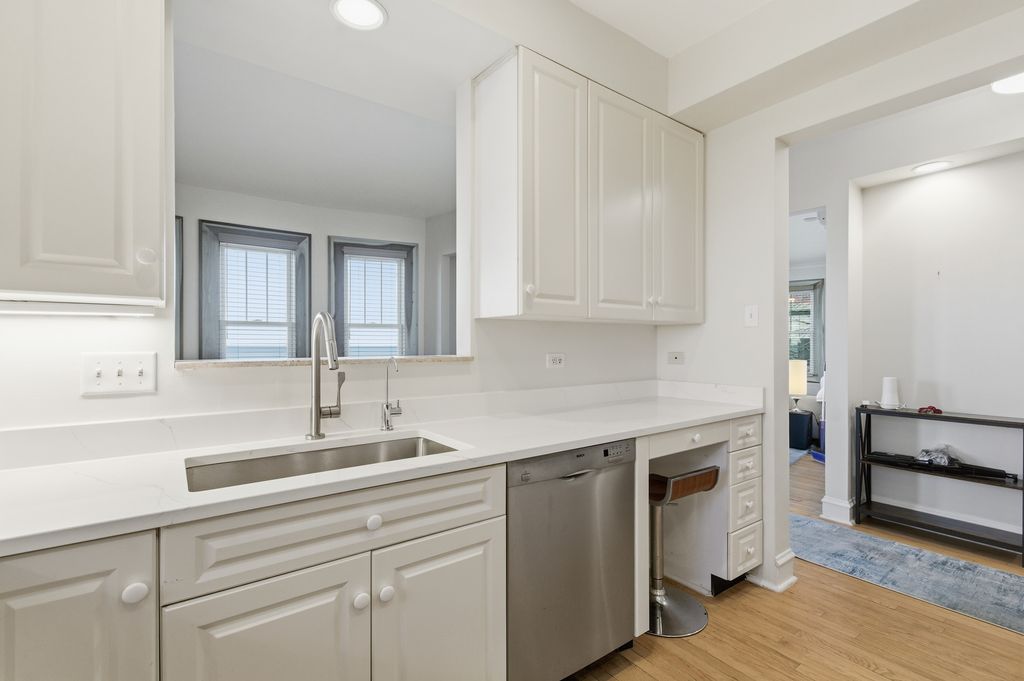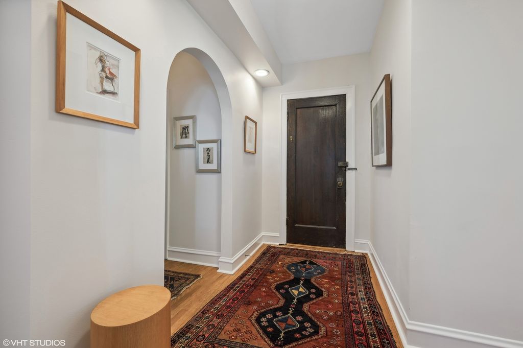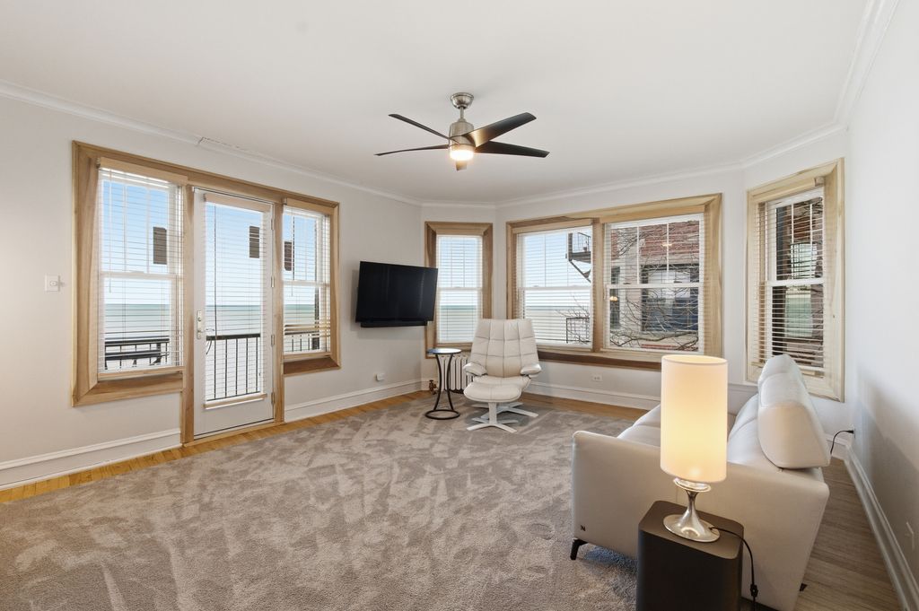 " Million dollar unobstructed lakefront views". Enjoy this 2nd floor corner unit facing north and east with tons of natural light and views of lake Michigan. This home is currently set up as a 1 bedroom with easy options to convert back to a 2 bedroom. Improvements; New custom Anderson windows with new trim and custom window treatments. Newly installed air conditioning with mini splits. All radiators have been rebuilt. Updated kitchen with new quarry counter tops. New patio doors. Refinished hardwood floors. In unit Laundry. 2 outdoor spaces. 1 private balcony overlooking lake, and a deck off back that views park and tennis courts. Also has access to private beach and interior garden courtyard. PLUS heated deeded garage parking next door for an additional cost . Assessments Include, Heat, water, landscaping, cable, internet, private pier, bike room, workout room, kayak and storage room. Investor rental friendly. Pet friendly. This is a rear find!