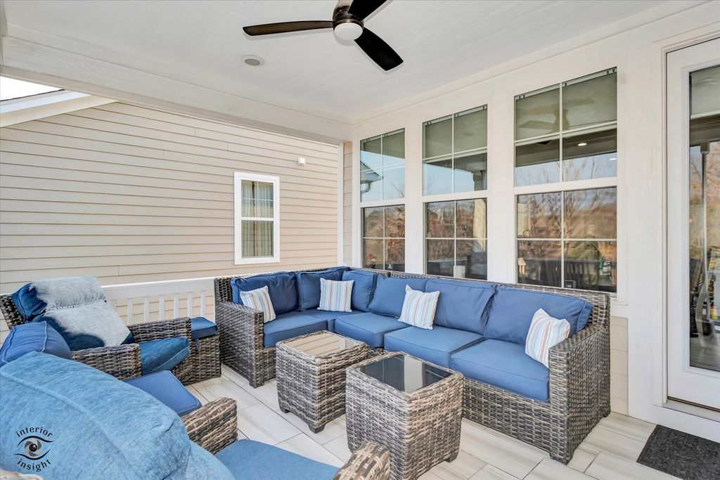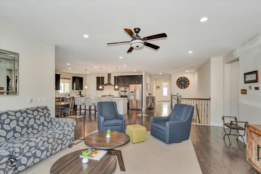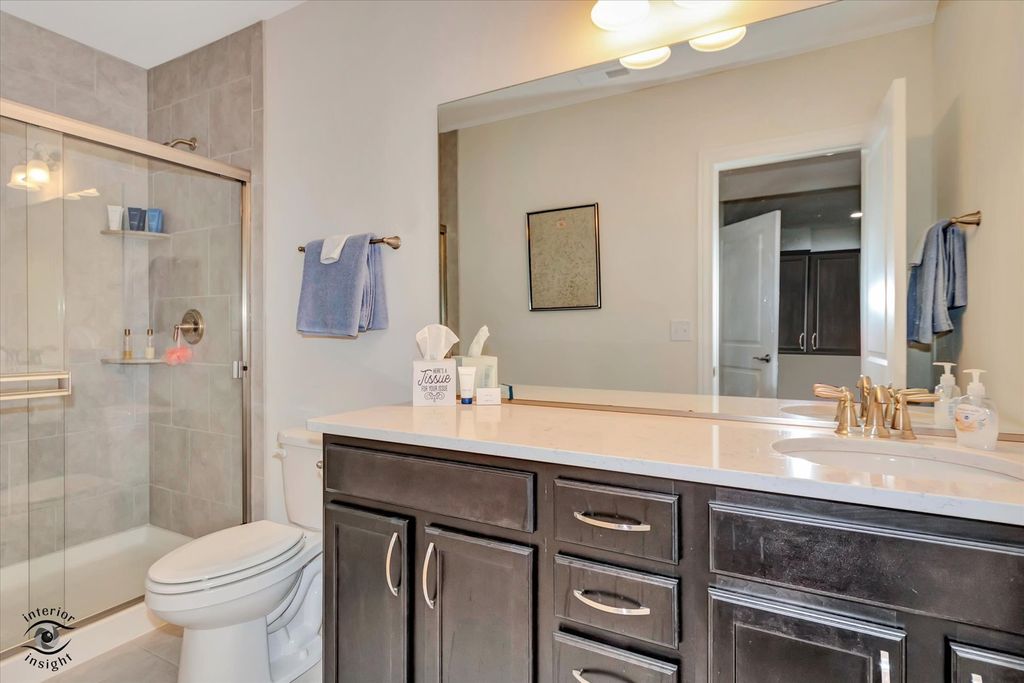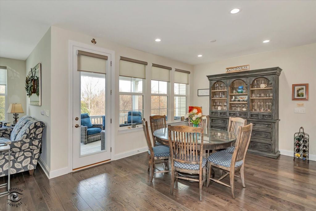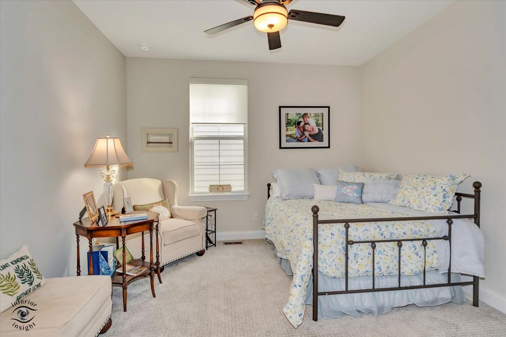 Located on a quiet interior cul-de-sac in the desirable Carrington Club subdivision, this elegant home sits on a premium lot and offers a thoughtfully designed floor plan for today's maintenance-free lifestyle. The first floor features beautiful wood flooring throughout and blends modern style with exceptional functionality. The inviting living room features abundant natural light and a stunning gas fireplace. The gourmet kitchen boasts high-end stainless steel appliances, quartz countertops, gas cooktop with electric convection oven, oversized island with breakfast bar seating, and a walk-in pantry. A sunlit dining area opens to a covered screened-in porch, perfect for entertaining. The sought-after first-floor primary suite offers a spa-like walk-in shower and spacious walk-in closet. Additional main-level highlights include a private office/flex room with French doors, custom professionally installed closet organization systems, and a well-appointed laundry room with generous cabinetry & quartz countertops. The finished 9' basement includes a huge beautiful family room with luxury vinyl plank flooring, a bedroom, full bath, bonus space, exercise room/additional bedroom, and large mechanical/storage area with graphite epoxy flooring. An attached two-car garage features insulated doors, a 240V/50-amp circuit, and graphite epoxy flooring. This sun-drenched gorgeous home is an absolute must-see and will not disappoint!