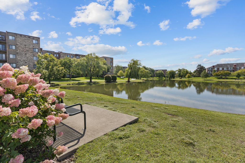 1!Wake up to panoramic lake views every day! Expansive living area in this fourth floor corner unit. Kitchen was remodeled with granite counters and additional cabinet space. Primary bedroom has lots of closets and includes a private bath with walk in shower and it is remodeled. Second bedroom has a Murphy bed. Association fee covers gas heat, central air, water, hot water, trash, basic cable & internet, lawn care, snow removal, parking & more! Easy budgeting and easy life style! Perfect way to start the New Year! The large immaculate laundry room is just down the hall and so is the oversized storage area (4W-01). Right by newly renovated Marshall Park. Neighborhood surrounded by Busse Woods. 2024 real estate taxes include senior $701.30 and freeze $1,891.59) Walk to shopping, library, movies, fitness center and more plus close to expressways.