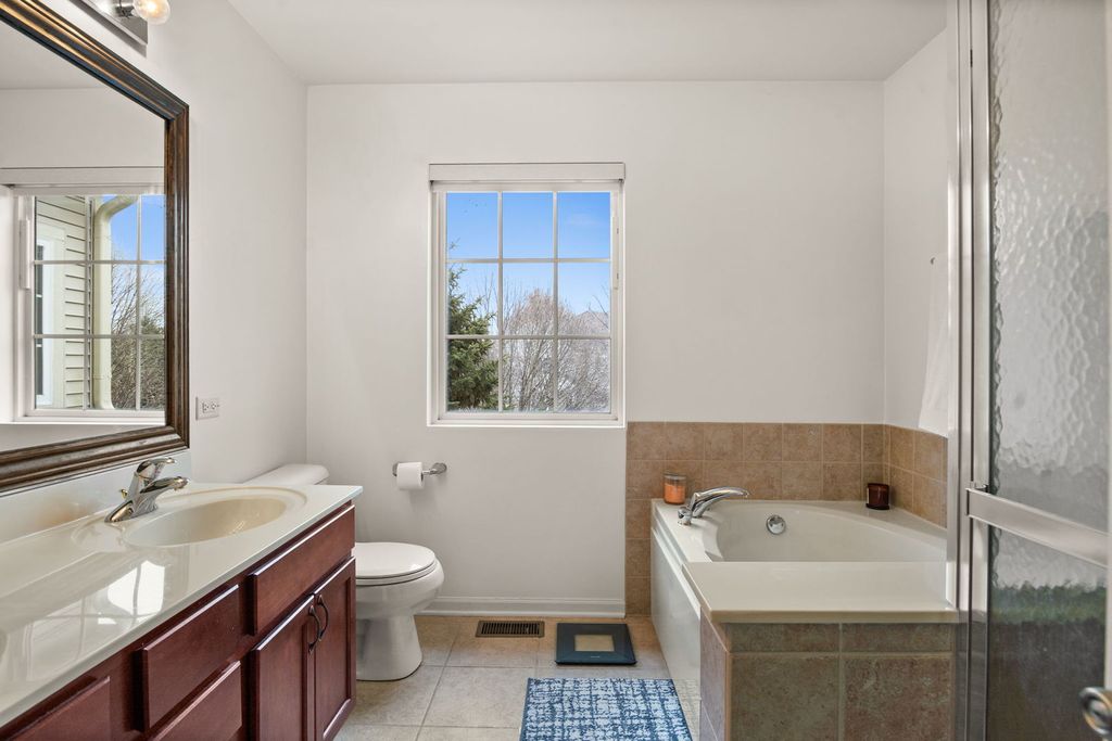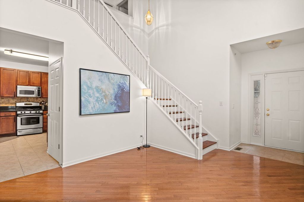 This bright and clean end unit is the Penrose model, the largest design in Canterbury Fields. Upon entering through the impressive two-story foyer, you are immediately greeted by a spacious and light-filled open area. The home features hardwood floors throughout and a beautifully updated kitchen, complete with 42" custom cherrywood cabinets, granite countertops, stainless steel appliances, a breakfast bar, and two pantry closets. Adjacent to the kitchen is a separate dining area that opens to a private, maintenance-free TREX deck. Stepping onto the deck, you'll discover vibrant plantings from the previous owner, including rose bushes, hydrangeas, and tulips. The home is equipped with custom automated "smart" shades and a home system throughout. The primary bedroom features high-volume ceilings, a walk-in closet, and an en suite bath with dual vanities, an oversized soaking tub, and a separate shower. Additional features include a two-story living room, a second-floor loft area that can easily be converted into a third bedroom, a second-floor laundry room, and a partially finished full basement with ample storage space. The extended two-car garage offers even more storage. Easy Walk to school and park, and close to major transportation routes