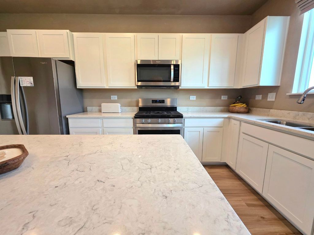 Built in 2021, this well-maintained home is located in the sought-after Sanctuary of Bull Valley community. The property features 3 bedrooms, 2.1bathrooms, and a 2-car attached garage, offering a modern and comfortable layout just minutes from Woodstock Square. The main floor includes anopen living area and kitchen with a walk-in pantry featuring custom shelving. Upstairs, the primary suite offers a private bath and a large walk-incloset, convenient access to the second-floor laundry, along with two additional bedrooms and a bath, and a loft. Outdoor features include aprofessionally landscaped yard with no direct rear neighbors and open views. Recent updates include a freshly seal-coated driveway. Some shelvesin the kitchen are made of reclaimed oak, the stairs are made of white oak, the laminate is Mohawk, and the interior walls feature lime wash paint.HOA is $220 semiannually. This home is move-in ready and located in a quiet, well-kept neighborhood.