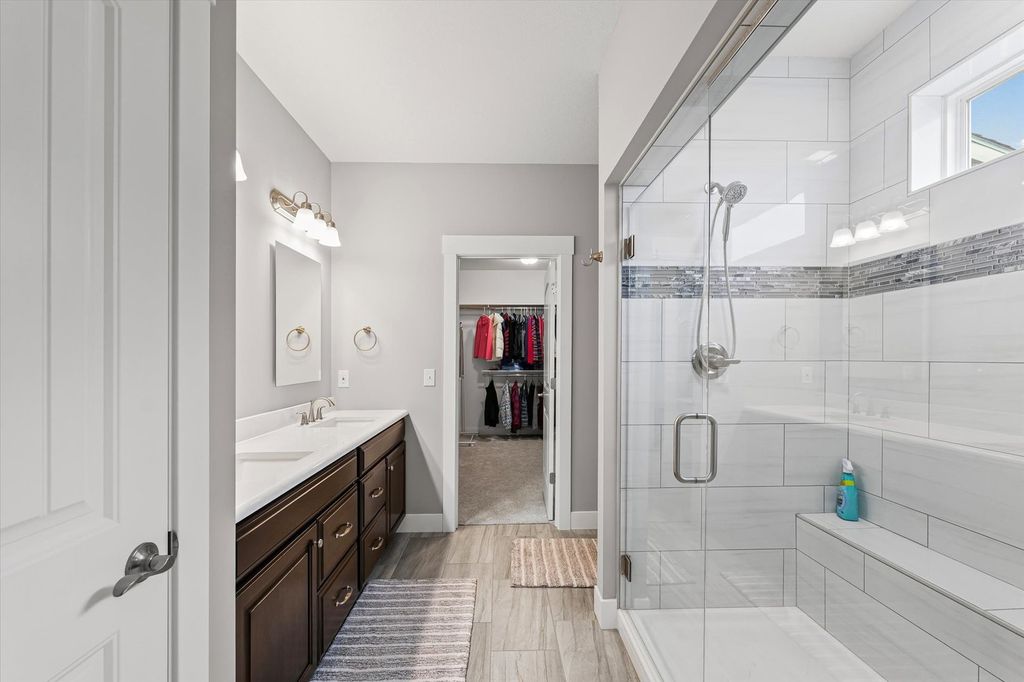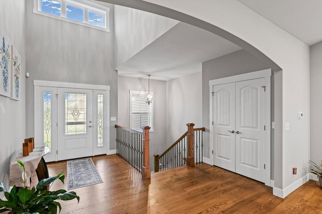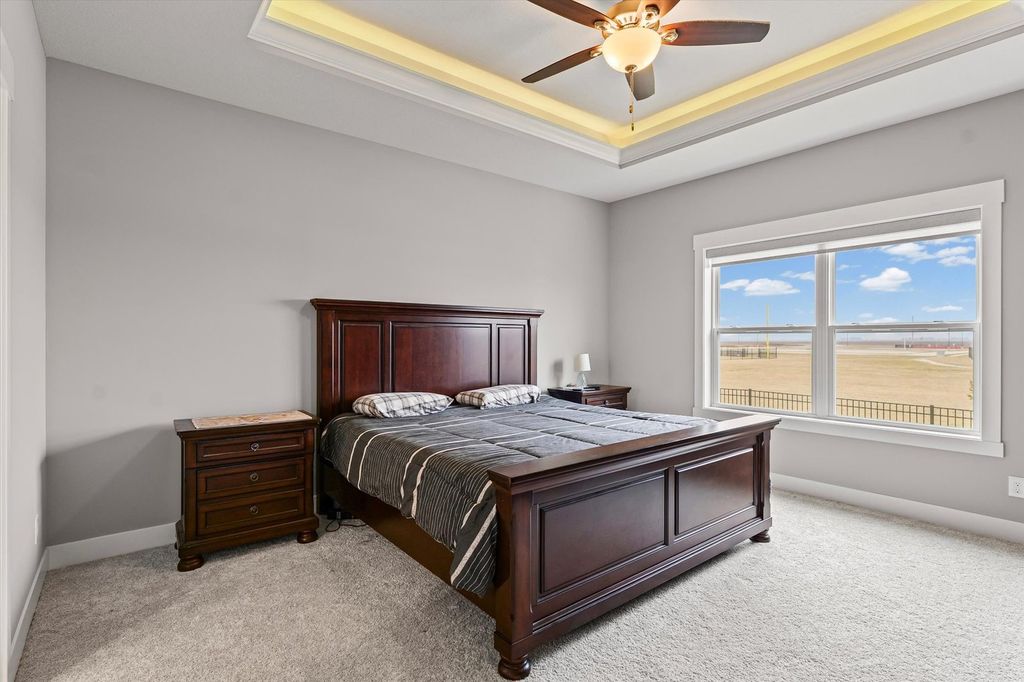 Enjoy this nearly new 4-bedroom, 3-full bath ranch in the highly sought-after Trails at Abbey Fields subdivision. A welcoming two-story entry leads you into the perfect space for gathering and entertaining. Hardwood flooring flows throughout the main living areas, while the living room impresses with cathedral ceilings, a cozy fireplace, and transom windows that flood the space with natural light. The eat-in kitchen features a functional island, custom cabinetry, tile backsplash, walk-in pantry, and plenty of room for everyday living or hosting. Sliding doors off the kitchen lead to the covered patio and feature remote-controlled blinds, as do several windows throughout the living room and entry. You'll love the split-bedroom floor plan, offering privacy and comfort. The primary suite showcases a lighted tray ceiling and an ensuite bath with double sinks, a tiled shower, and a spacious walk-in closet. A pocket door connects the closet directly to the laundry room, making everyday routines effortless. The laundry room includes a washer and dryer on pedestals, additional cabinetry, and a utility sink. The finished basement expands your living space with an office, fourth bedroom, full bathroom, a sprawling family/rec room, and a wet bar. It's also equipped with home-theater surround sound, creating an ideal space for movie nights or game days. Additional highlights include a designated drop zone off the three-car garage, plus a bump-out ideal for extra storage or a workshop. App-driven Sonos speakers are installed on the patio and in the garage, as well as through the living room TV speaker system, making it easy to enjoy music or entertainment throughout the home. Dual zone HVAC adds comfort and efficiency year-round. Outside, enjoy a fully fenced backyard, a large covered patio, a dedicated hot tub area, and additional space for grilling with a built-in gas line. This custom home is packed with upgrades and is truly move-in ready for its next owner.