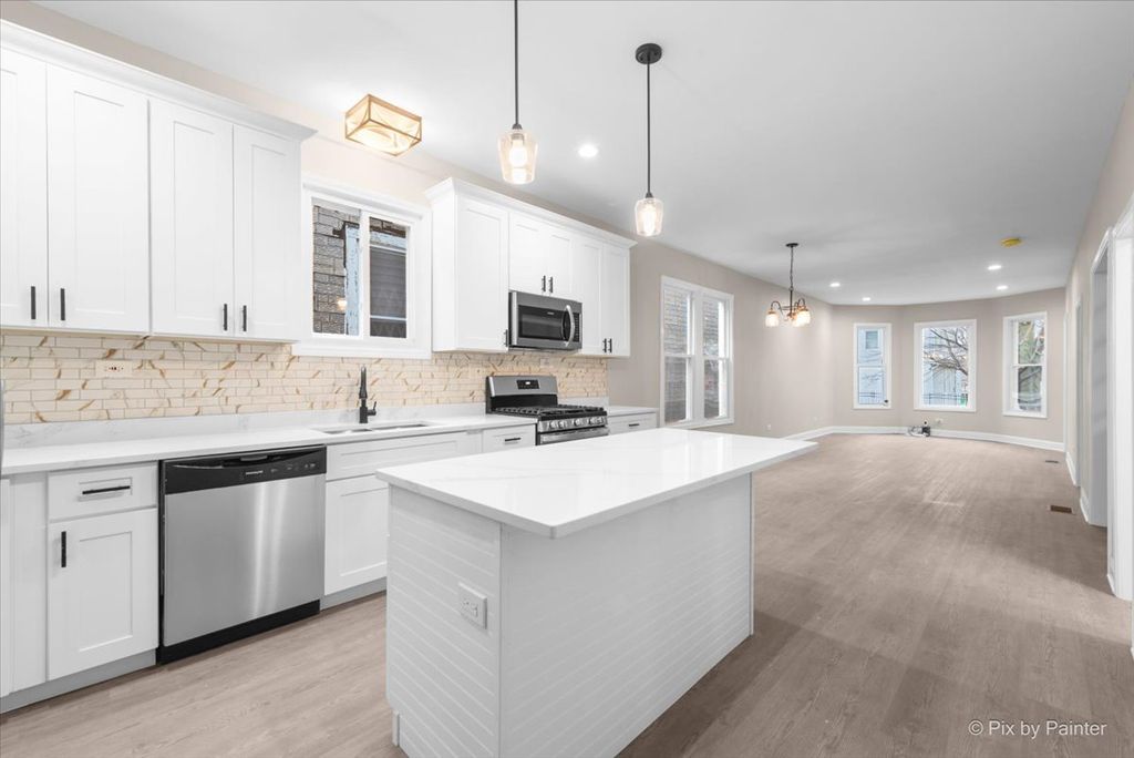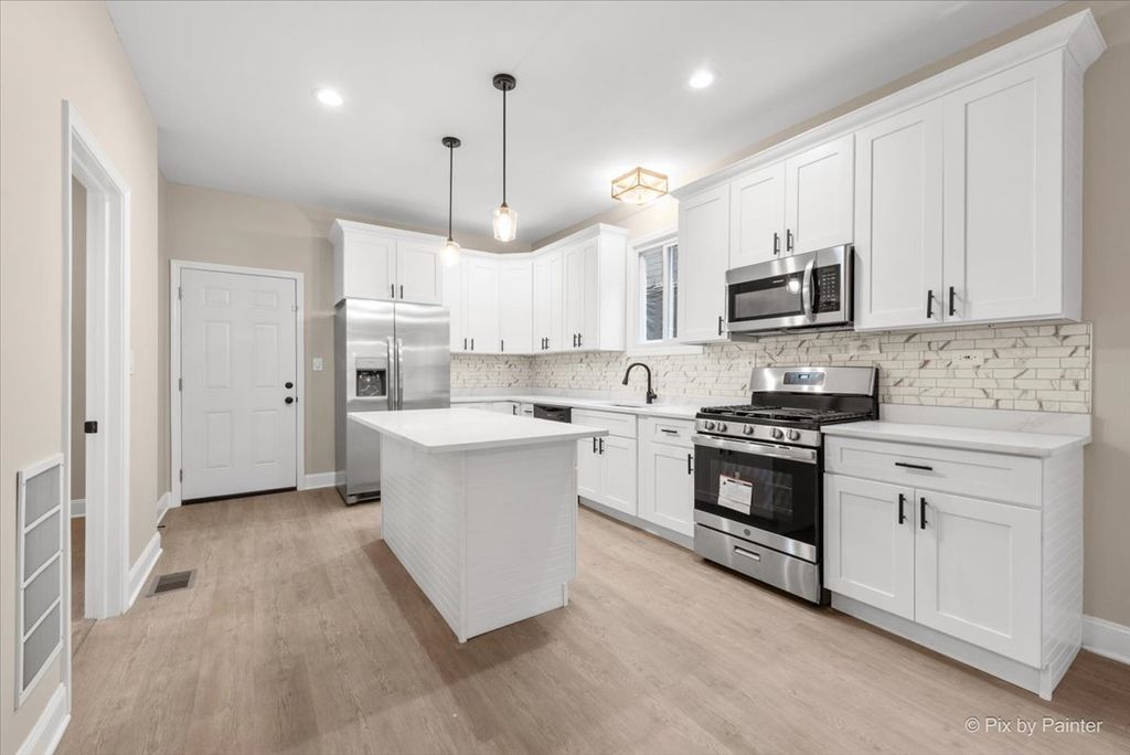 Charming and fully rehabbed 6-bedroom, 2-bath Cape Cod in vibrant Englewood! This stunning home offers a fantastic open-concept layout featuring a gorgeous eat-in kitchen with new cabinetry, stainless steel appliances, quartz countertops, custom tiled backsplash, large island, and beautiful LVP flooring that flows throughout the home. The adjacent dining room and spacious living room with bayed windows create a bright and inviting space, perfect for both intimate gatherings and larger family events. Enjoy easy indoor-outdoor entertaining with access to the private, fully fenced yard and patio. The flexible floor plan includes two main-level bedrooms, a beautifully remodeled full bath, and an enclosed back porch. Upstairs you'll find two oversized bedrooms with walk-in closets plus additional flex space ideal for a playroom, office, or den. The fully finished lower level expands the living space with a large family room, two additional bedrooms, another updated full bathroom with a walk-in shower, and a laundry/storage area with convenient walk-out access to the yard. Enjoy peace of mind with extensive updates throughout, including a new roof, siding, windows, concrete steps and walkways, HVAC, hot water heater, updated electrical and plumbing, cabinetry, vanities, flooring, lighting, and fresh paint-providing years of low-maintenance living.