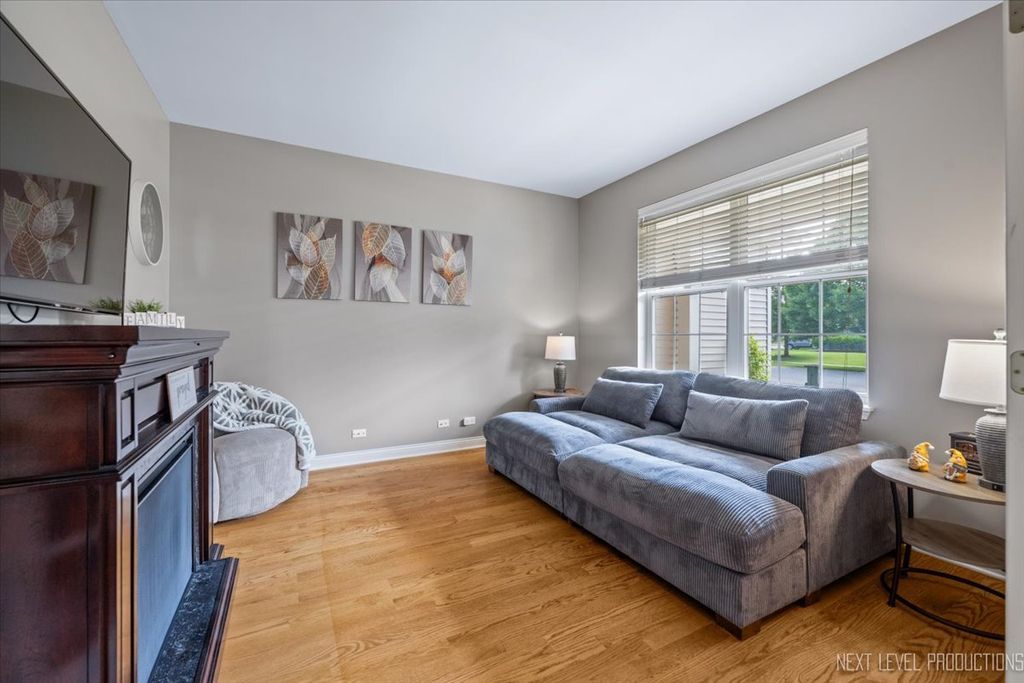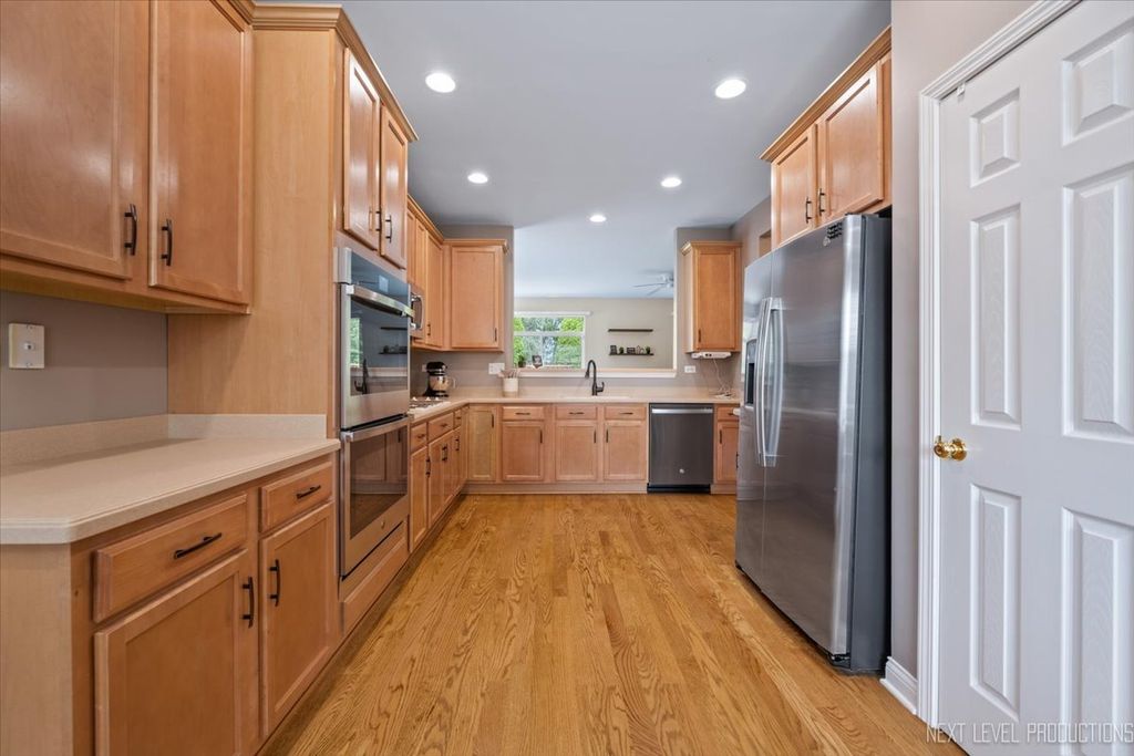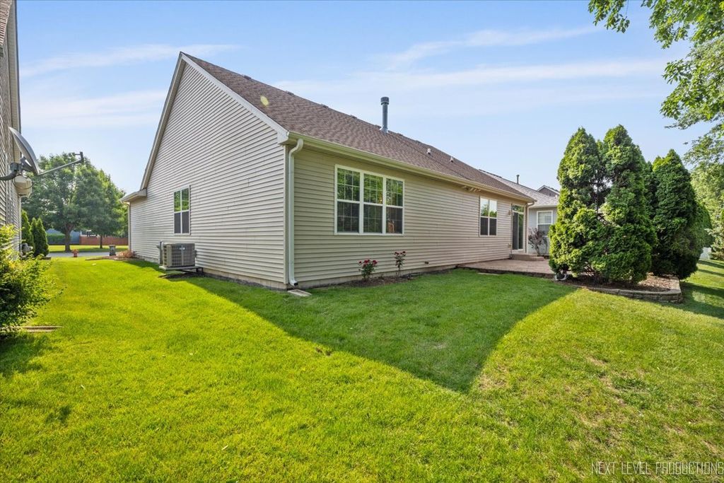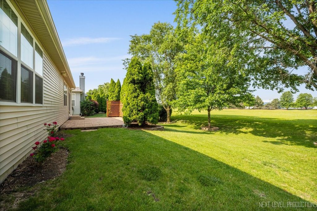 Nothing to do here but move in and enjoy! Gorgeous east-facing ranch home with so many updates. Stainless appliances (2025), oak hardwood flooring (2021), roof (2020), siding on back of home (2020), HVAC (2020), new front door handle set with keyless entry (2025), blinds on every window, and neutral paint throughout. This home is so warm and inviting. It includes an eat-in kitchen with maple cabinets, recessed lighting, double oven, and Corian counters. For more casual mealtimes, there is additional bar-height seating between the kitchen and family room. Cozy up in the family room and enjoy the gas fireplace and take in the backyard views through the sliding glass doors. Towards the front of the home sits a den which can be used as a sitting or reading room or repurposed as a bedroom if needed. The master bedroom includes a walk-in closet and an ensuite bathroom with walk-in shower. The back patio includes a stone patio with mature trees and lattice privacy fence. Garage is heated, includes epoxy flooring and shelving for storage. Steeplechase of Oswego is a 55+ community that offers a community pool, clubhouse & fitness center with low monthly association dues. The community is located just minutes from shopping, dining, and downtown Naperville, Aurora, Oswego, and Plainfield. A Trader Joe's is being built within walking distance! This is the one you've been waiting for! ADT system (equipment cost covered by seller) will be transferred to buyer if interested. Two freestanding fireplaces and three flat screens + mounting brackets convey with the sale. Home is in excellent condition, but seller is offering a 1 YR HOME WARRANTY to buyer as well.
