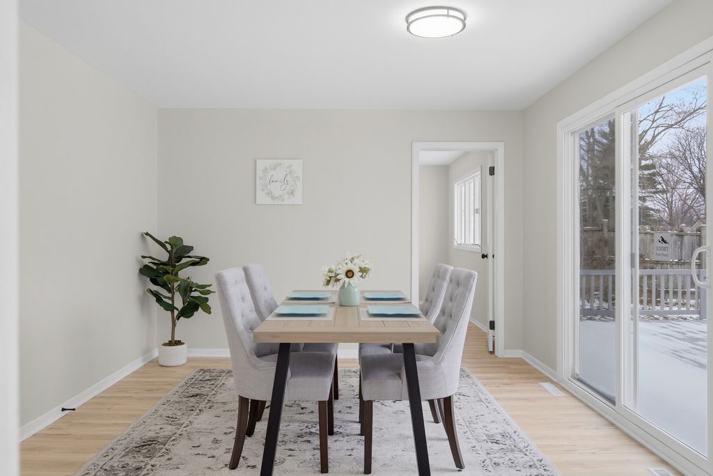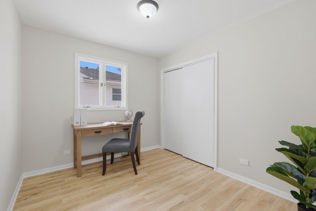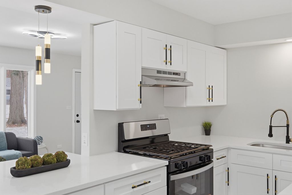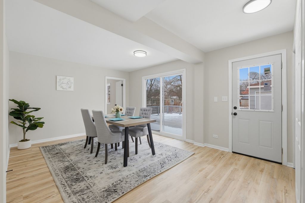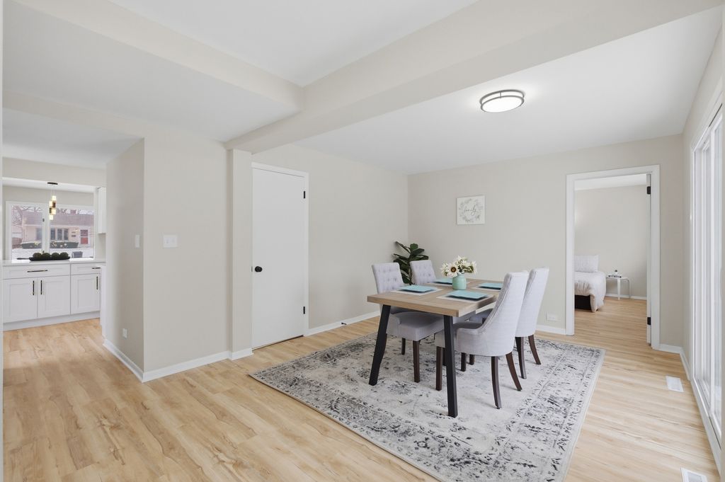 Charming 3 bedroom, 2 full bathrooms ranch home in the heart of Rolling Meadows, walking distance from Kimball Hill Park and nearby amenities. This beautifully updated residence welcomes you with a bright, open floor plan, neutral finishes, and abundant natural light throughout. The brand new kitchen features new cabinetry, quartz countertops, stainless steel appliances, and a functional layout that flows seamlessly into the living and dining areas. An additional dining space offers flexibility for use as a family room or extended entertaining area. Both bathrooms have been fully updated with new tile, modern vanities, and updated mirrors. Interior highlights include fresh paint throughout, brand new vinyl flooring, and updated LED lighting throughout the home. Step outside to a large rear deck overlooking a fully fenced backyard. A detached two-car garage and extended driveway provide ample parking. Conveniently located near parks, shopping, major transportation routes and 1.5 miles away from downtown Arlington Heights.