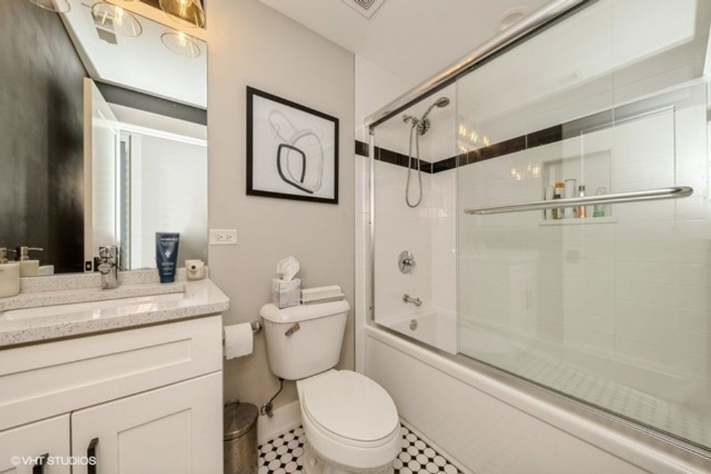 Experience modern luxury in this stunning 3-bed, 2-bath split-level penthouse. Flooded with natural light, the open layout features premium hardwood floors, 42" cabinetry, quartz countertops, an oversized island, and Energy Star stainless steel appliances. High ceilings, crown molding, custom designer lighting, and a high-efficiency HVAC system elevate every detail. The primary suite offers a spa-like en-suite with dual vanities, shaker cabinets, a glass-enclosed shower, and a generous walk-in closet. Stay connected and secure with Ring cameras, video intercom, Sonos ceiling speakers, high-speed internet, and cable pre-wiring. Enjoy a private patio, shared rooftop, and garage parking. Ideally located just minutes from the lake, the Green Line, Lakeshore Drive, the University of Chicago, and downtown. Luxury and convenience-perfectly combined.