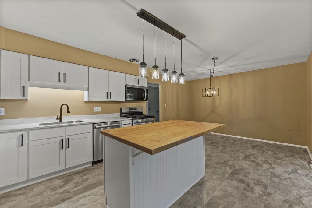This newly updated 3 bedroom ranch home is move-in ready with refinished oak hardwood flooring and a freshly painted interior. The spacious eat-in kitchen is all brand new with stainless appliances including a 5-burner gas range and Bosch dishwasher. Shaker style soft-close plywood cabinets and an island/breakfast bar with butcher block top. New hardware and lighting throughout give the home a contemporary feel. The main floor bathroom has also been freshly updated. There is an additional bathroom with shower, plus a newer washer and dryer in the full basement. The oversized garage has a spare refrigerator/freezer. Step out through the sliding glass door to the huge fenced yard with mature trees that provide plenty of shade. There is a swing set, firepit and a big shed with electric and a workbench. Come check out this well-built ranch home in a great neighborhood that is sure to impress.