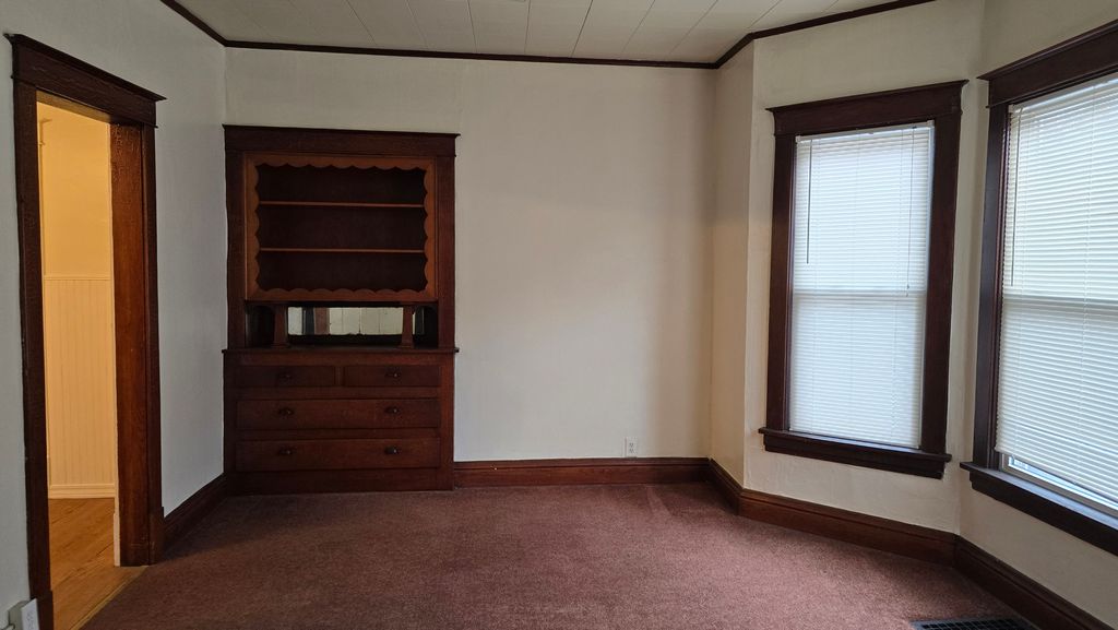 Charming 3-bedroom, 1.5-bath, featuring a 1-car detached garage. Each bedroom includes a walk-in closet, offering ample storage space. The large eat-in kitchen is perfect for family meals, while the separate dining room with a built-in hutch adds a touch of elegance. Enjoy the enclosed front porch for relaxation and the enclosed rear porch/mudroom for added convenience. This home has great potential and is ready for your personal touch to bring it back to its full charm. Hardwood floors are likely under carpet on first floor.