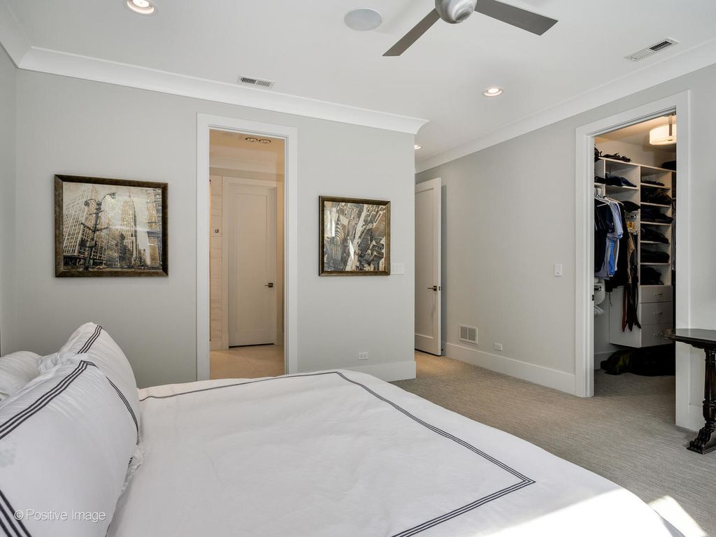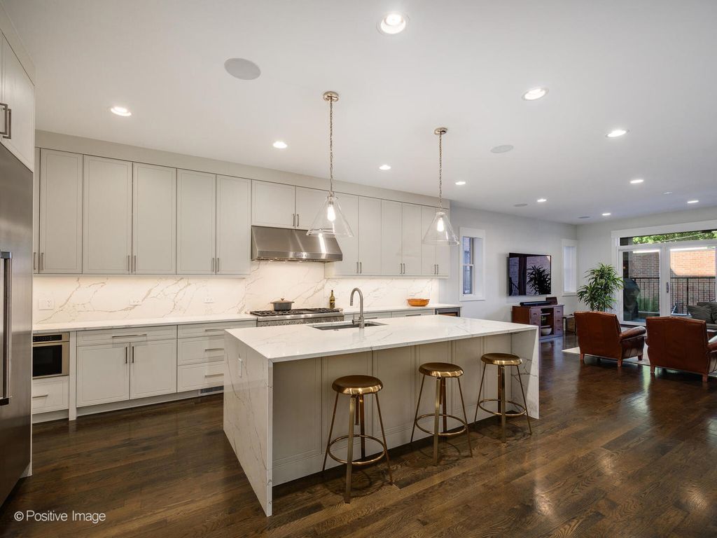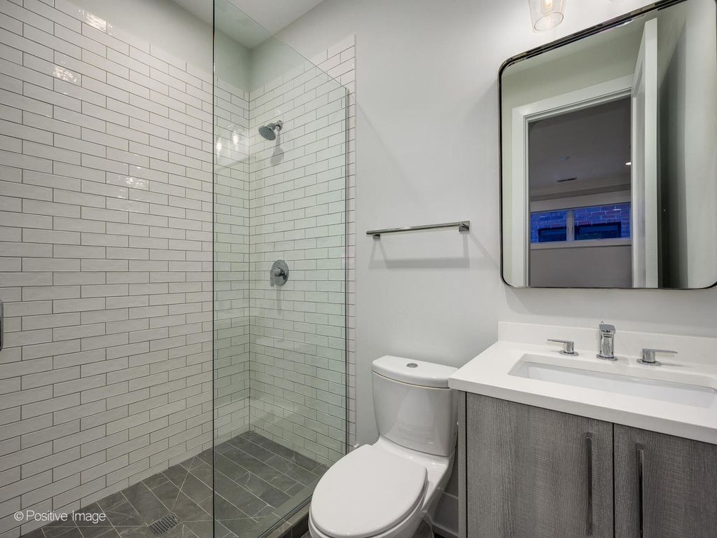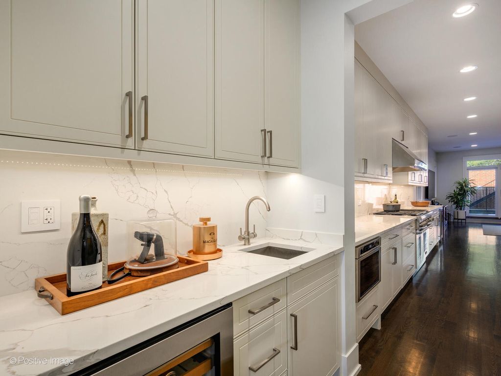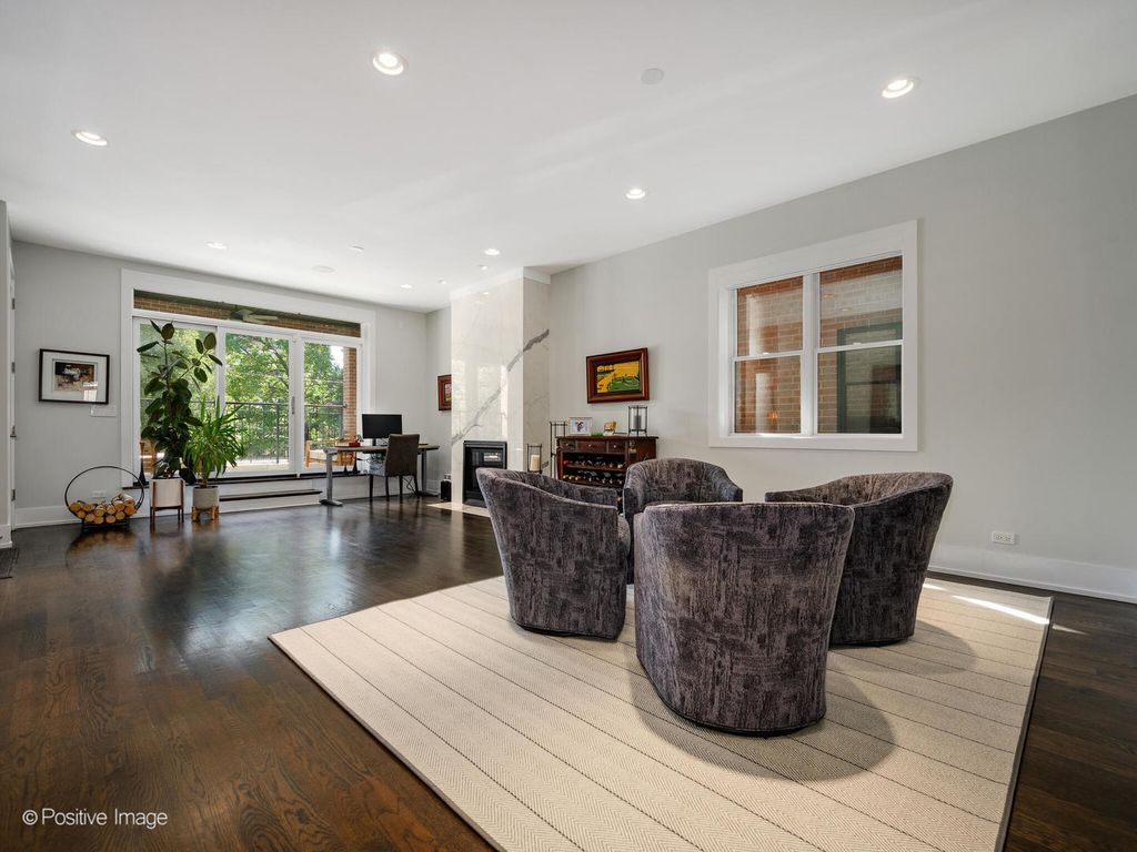 Stunning Wicker Park newer construction offering the space and privacy of a single-family home with 4 bedrooms, 3.1 baths, and an exceptional duplex-down layout. Built on an oversized lot, this sun-drenched south-facing residence features a private backyard, two terraces, a roof deck, and a 2-car garage-a rare find in the neighborhood. The professional-grade eat-in kitchen is designed for both daily living and elegant entertaining, with top-of-the-line Thermador appliances, quartz countertops with waterfall edges, a beverage fridge, and a butler's pantry offering abundant storage. The kitchen flows seamlessly into a spacious family room that opens to a covered terrace overlooking the lush backyard-perfect for indoor-outdoor living. The formal living and dining area features a front terrace and cozy fireplace, creating an ideal space for hosting. The lower level houses all four generously sized bedrooms and three full bathrooms. The luxurious primary suite is a true retreat with a walk-in closet and spa-like marble en-suite featuring a steam/rain shower, freestanding soaking tub, and double vanity with excellent storage. One of the back bedrooms also includes an en-suite bath. A full laundry room and extensive hallway storage complete this level. Recent updates elevate the home even further: custom closets throughout, automatic motorized window treatments, new sump pump, Trex decking on both terraces and the garage roof deck, and a professionally landscaped backyard with new turf and private fencing (2024). The garage includes an EV charger for added convenience. One storage closet is also included. Note: Fourth bedroom wall has been removed. Seller will either provide a credit or put the wall back up. This all-brick construction home is meticulously maintained and part of a well-run association with healthy reserves. Located steps from the Damen Blue Line stop and surrounded by Wicker Park's renowned restaurants, boutiques, and nightlife-this is urban living at its finest.