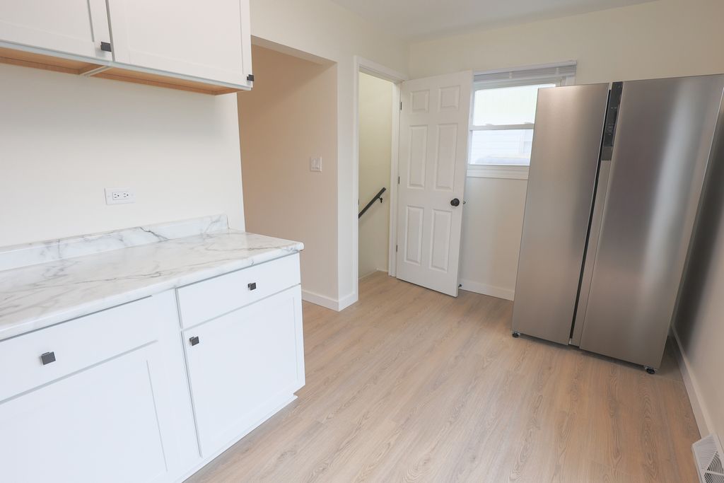 Welcome home to this fully renovated 3-bedroom, 1-bath ranch that blends modern updates with everyday comfort. The completely redesigned kitchen includes new cabinetry, stainless steel refrigerator, range, and microwave, along with new countertops, sink, and faucet. The main level features brand-new LVP flooring throughout and two spacious bedrooms, each with large closets. The bathroom has been fully updated with a new vanity and toilet, plus a shower-over-tub finished with new ceramic tile and a new ceramic tile floor. The lower level offers additional living space with a rec room featuring new carpet, plus a third bedroom also finished with new carpet. A new water heater adds peace of mind. Outside, enjoy a fenced-in backyard with a deck, perfect for relaxing or entertaining. The detached garage adds convenience, while sidewalks, easy access to shopping, and close proximity to the interstate make this home as practical as it is stylish.