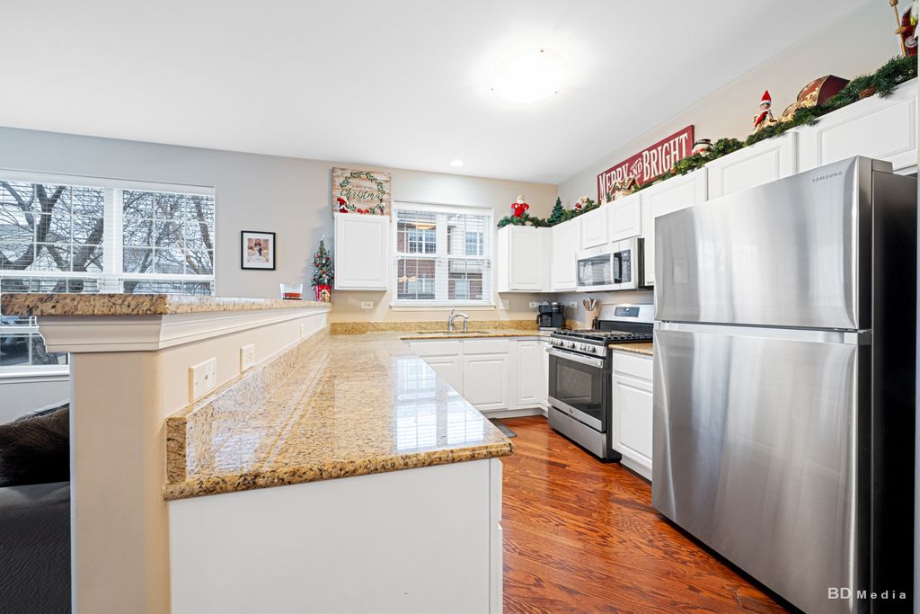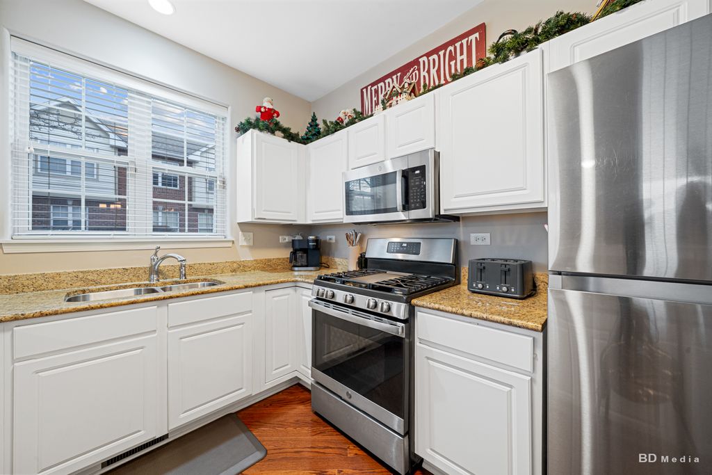 Beautiful & spacious 3 bedroom plus loft townhouse boasts a stunning kitchen with white cabinets & granite counters; Sun-filled formal living room & dining room; Gleaming hardwood flooring throughout main level; Nicely remodeled powder room; Spacious master suite with private bath with granite vanity, double walk-in closets, linen closet & custom tv nook; Spacious loft/office; bath #2 with granite vanity and ceramic tile flooring; 2nd floor laundry; 2 car garage with epoxy flooring & plenty of built-in cabinets. Many appliances stay. Pride of Ownership.