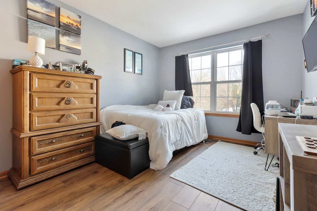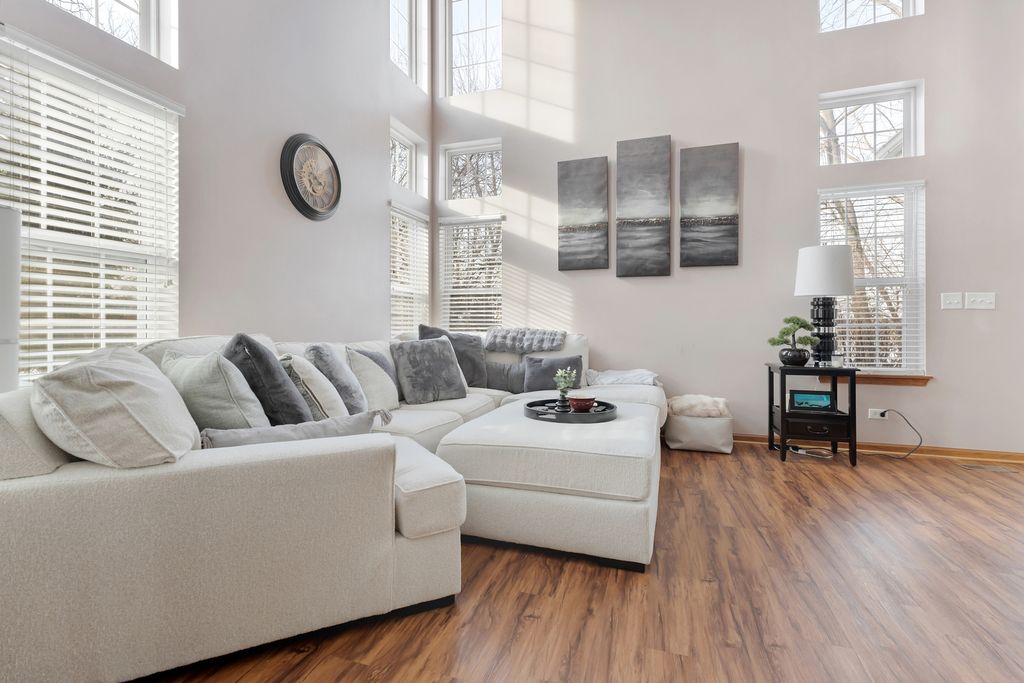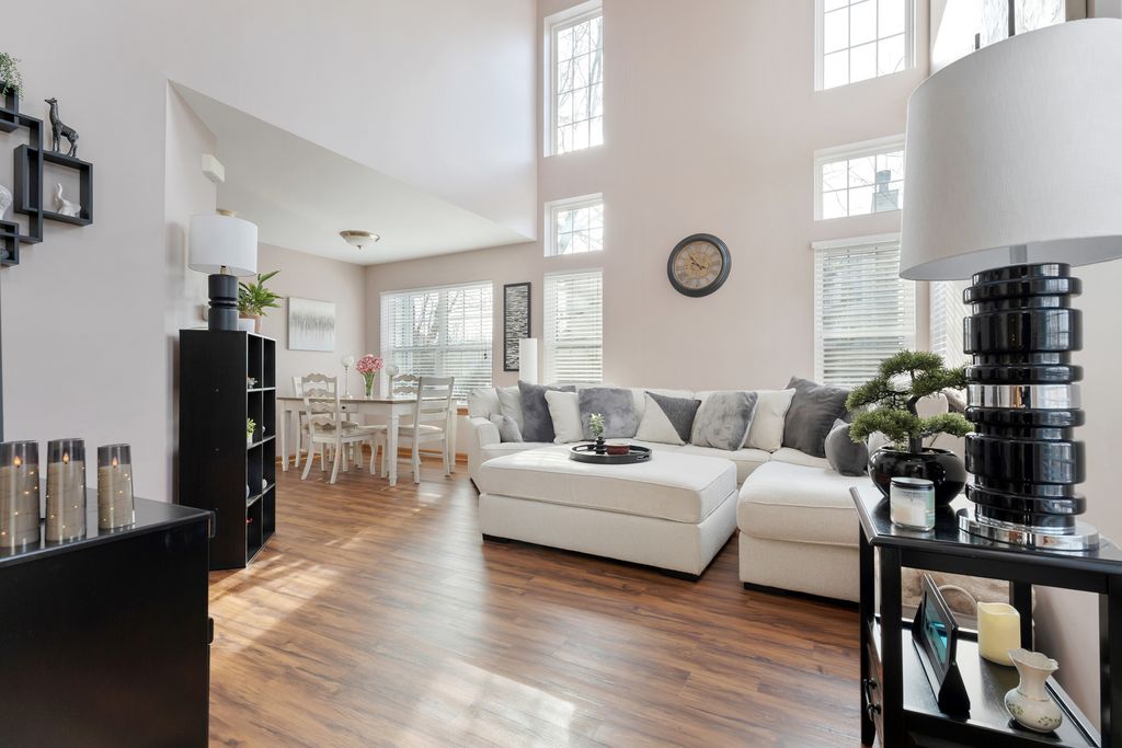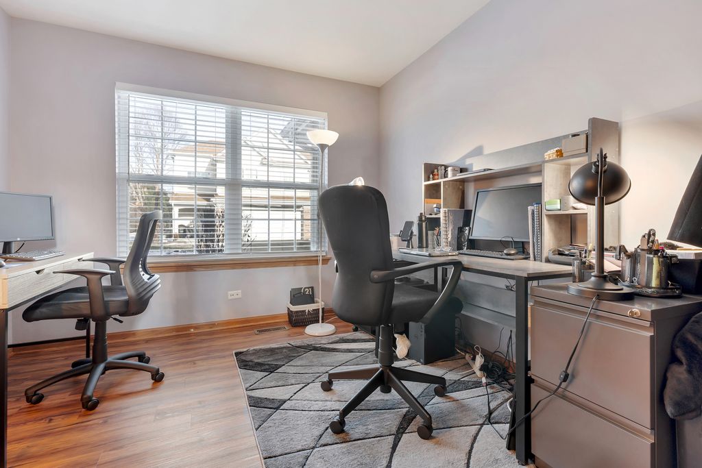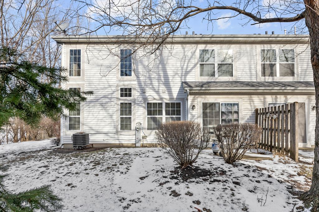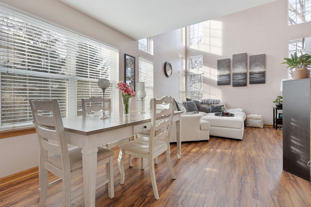 Premium Location for this 3 Bedroom End Unit Townhome with Main Floor Office/Den! Features Include; Wood Laminate Flooring throughout Both Levels ~ Upgraded Carpet on Stairs ~ 2 Story Foyer & Living Room offers Lots of Windows ~ Kitchen with White Cabinets and Black/Stainless Appliances ~ Eat In Kitchen and Dining Room ~ Office with French Doors ~ Powder Room with Pedestal Sink and Wall Cabinet ~ Master Bedroom with French Doors and Private Bath with Oversized Tub ~ 2nd Bedroom with Walk-In Closet ~ Secondary Full Bath with Custom Vanity ~ Convenient 2nd Floor Laundry ~ NEW Furnace (2024) ~ NEW Water Heater (2020) ~ 2 Car Garage with Metal Storage Shelves ~ Plus a Concrete Patio with Views of Open Space and Mature Trees!