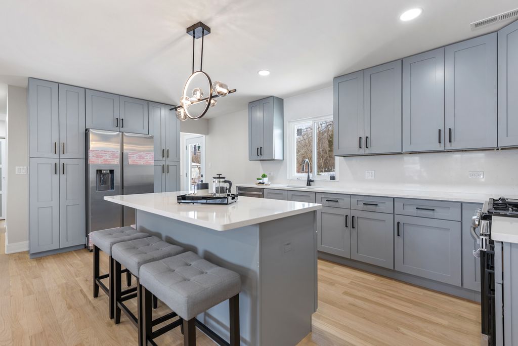 CATALOGUE QUALITY - NEW CONSTRUCTION - SINGLE LEVEL RANCH LIVING - 4 Bedrooms, 2 FULL bathrooms - Luxury on every inch and corner! Stunning, top-to-bottom, FULLY PERMITTED with the village of Hoffman Estates! Everything is up to code and brand new! This meticulously redesigned 4-bedroom, 2-bathroom residence offers a seamless layout featuring solid real hardwood oak floors, elegant glass panel doors, and a designer kitchen equipped with quartz countertops, custom backsplash, and premium stainless steel appliances. Upgraded baseboards and trims throughout the house. This is NOT a typical renovation. Home was stripped to the bones to include all-new copper piping, a new electrical service and panel, new Furnace + AC + boiler, new insulation, brand new windows, brand new duct work and so much more. 2023 roof with newer siding and gutters for absolute peace of mind. The exterior is equally impressive, boasting a long, extended BRAND NEW concrete driveway leading to a two-car garage and a private yard with a newly laid patio. NO HOA fees. Perfectly situated in the prime Schaumburg corridor with immediate access to I-90, IL-53, and the South Barrington/Route 59 commercial hub, this home offers an unbeatable combination of sophisticated modern finishes and a central, high-demand location.