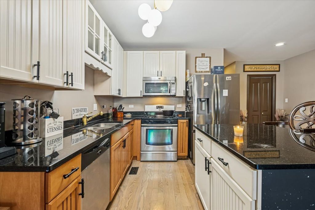 Welcome to spacious and beautifully updated 5-bedroom, 3-bath duplex-down in Hyde Park Township, just minutes from the train and the future Obama Presidential Center. This home combines modern comfort with incredible flexibility - perfect for homeowners and investors alike. Main level features refinished hardwood floors (2024), fresh paint throughout, and a bright, open concept living space. A sun-filled living room with fireplace and Juliet balcony flows into the updated kitchen, featuring granite countertops, custom cabinetry, breakfast bar, and newer stainless-steel appliances (fridge & dishwasher 2024). Three spacious bedrooms are on the main level, including a primary suite with spa-like bath complete with dual vanity, jacuzzi tub, and separate shower. From here, step out to a quiet private terrace and enjoy the convenience of your own assigned parking space. The lower level expands the possibilities. Fully tiled, it offers a huge recreation room with wet bar, two additional bedrooms, and a full bath with dual sinks, soaker tub, and separate shower. Best of all, this level includes a second kitchen (cooktop & fridge 2024), washer/dryer, and a private entrance - making it ideal for extended family, a guest suite, or as a turn-key rental/Airbnb opportunity.