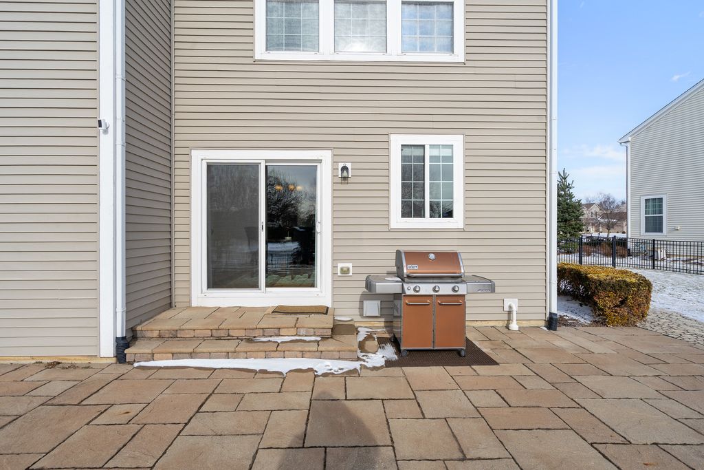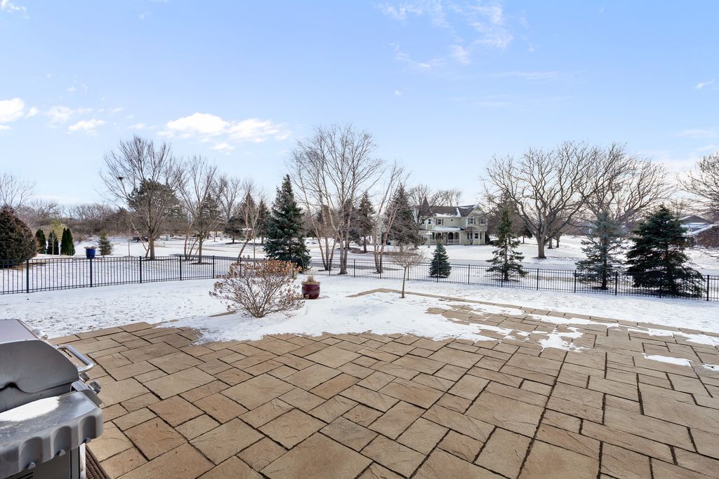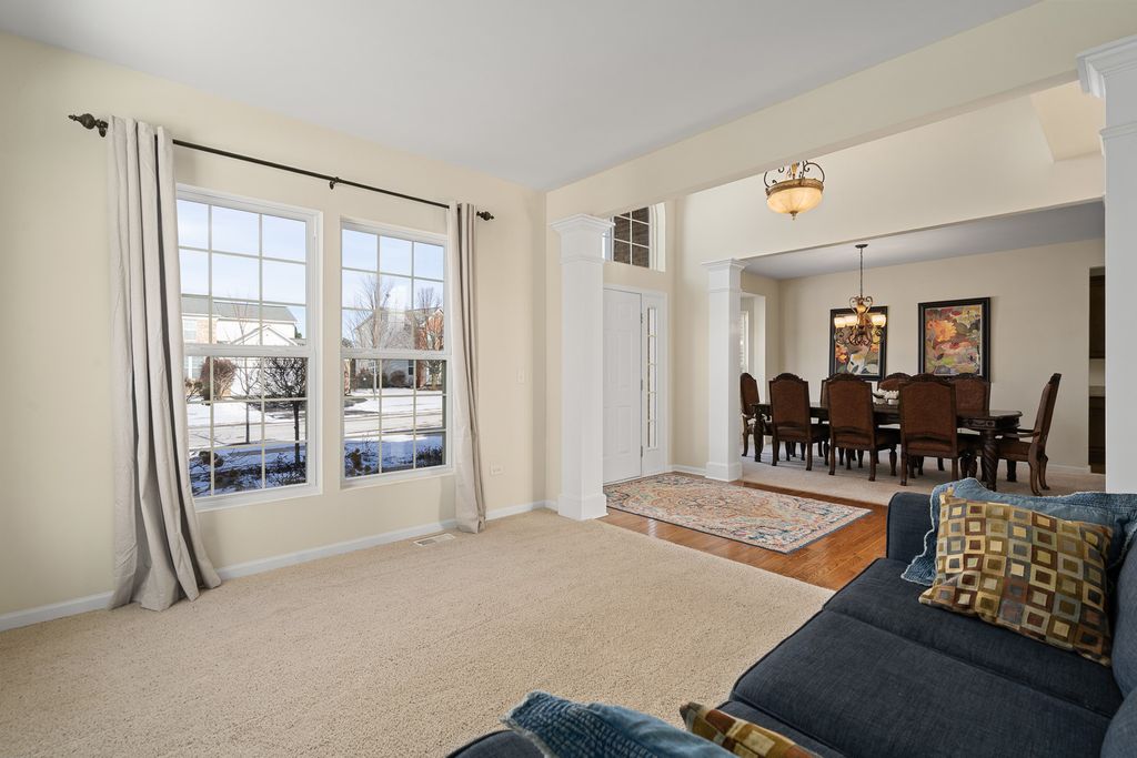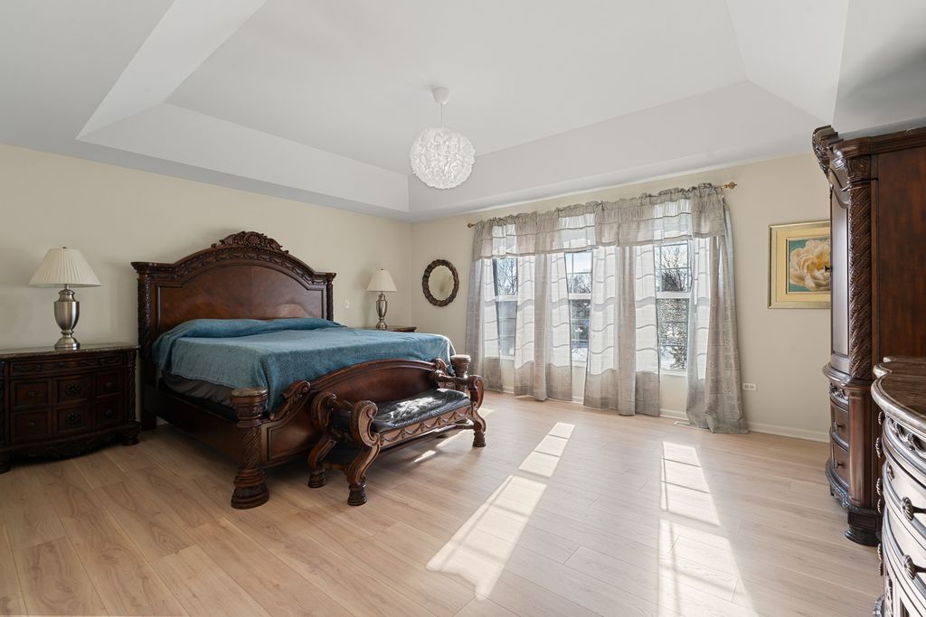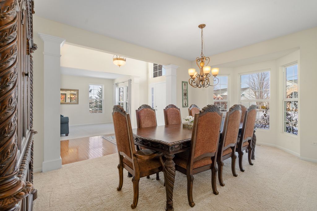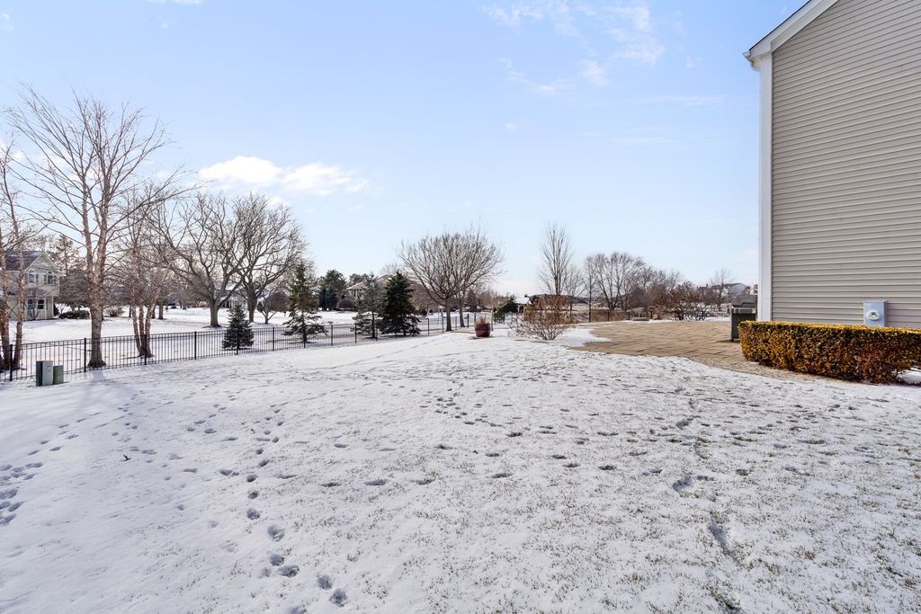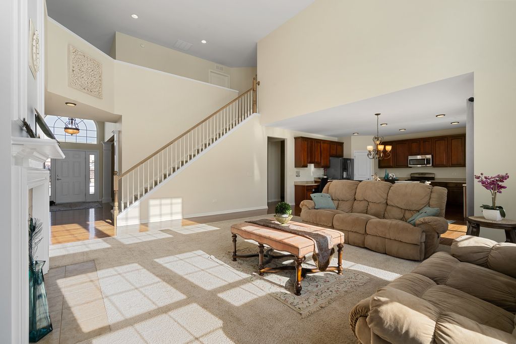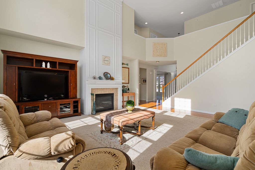 MULTIPLE OFFERS RECEIVED. HIGHEST & BEST REQUESTED. Prepare to be impressed by this stunning and spacious true two-story Birmingham model, gracefully nestled on an exceptional lot overlooking a scenic pond with direct access to winding walking paths. From the moment you arrive, this home captivates with its commanding presence, lush landscaping, and serene water views that create a resort-like atmosphere. Step inside to a grand foyer accented by gleaming hardwood floors, setting the tone for the refined elegance found throughout. The sun-filled living room and formal dining room are beautifully defined by decorative pillars, offering the perfect backdrop for entertaining and special gatherings. A desirable main-level bedroom with a full bath provides ideal accommodations for related living or guests. The heart of the home is the dramatic two-story family room, highlighted by a soaring floor-to-ceiling gas fireplace and walls of windows that frame breathtaking yard views. The expansive chef's kitchen is both stunning and functional, featuring rich 42-inch cabinetry, gleaming hardwood floors, corian countertops, a center island, pantry, planning desk, water filtration system, and stainless steel appliances. The adjoining breakfast area opens to the backyard oasis. Outdoor living is taken to the next level with an approximately 1,000 sq ft custom paver patio, complete with a waterfall water feature, ambient illumination, and a fully fenced yard-perfect for relaxing evenings or entertaining under the stars, all while enjoying peaceful pond views and direct access to the walking path. Additional main-level highlights include an elegant butler's pantry, a well-appointed laundry room with sink, and a three-car attached garage featuring RaceDeck flooring. Upstairs, retreat to the expansive master suite showcasing new luxury vinyl plank flooring and a double-door entry into a spa-inspired bath with double raised vanities, separate shower, whirlpool tub, private water closet, and an impressively large walk-in closet. Bedroom two offers its own walk-in closet, while additional bedrooms provide generous space and comfort. The full unfinished basement boasts 9-foot ceilings and roughed-in plumbing, offering endless potential for future living space. Select rooms are wired with Cat-5, adding modern convenience. Offering five bedrooms, three full baths, exceptional indoor-outdoor living, and a premium pond-side setting, this extraordinary home delivers luxury, comfort, and lifestyle in one remarkable package. Community Highlights: Located in Cedar Ridge with desirable 33C school district, enjoy access to a lovely park with playgrounds, serene ponds, and winding walking trails-perfect for outdoor adventures and family outings. Plus, you'll love the convenience of being close to expressway I-355, shops, and restaurants, train Metra, Silver Cross Hospital and more making your daily commutes and errands a breeze!