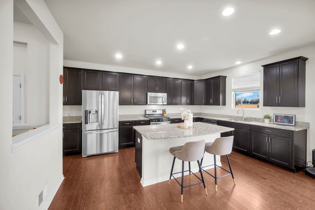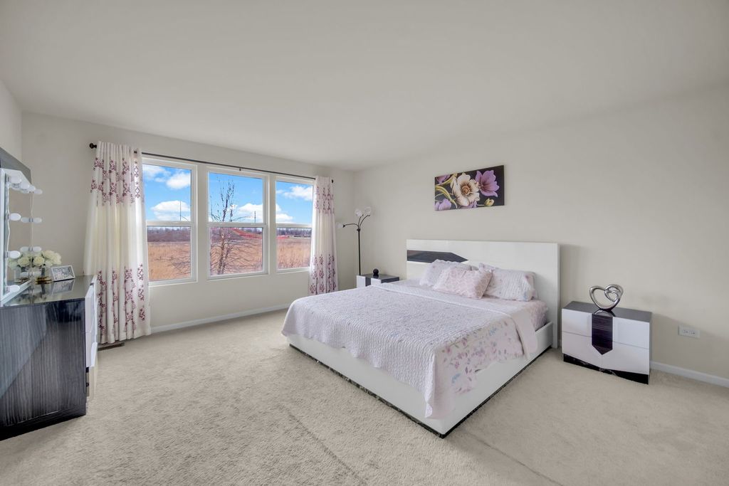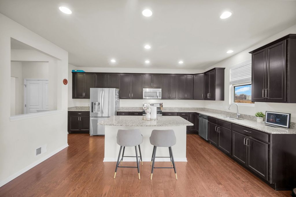 Light, bright, open, and airy perfectly describe this exceptional 4-bedroom, 2.5-bath semi-custom home, thoughtfully designed with both elegance and functionality in mind. From the moment you enter, you are welcomed by a spacious open-concept floor plan that effortlessly blends modern style with everyday comfort. The heart of the home is the expansive gourmet kitchen, featuring an oversized island ideal for gathering and entertaining, tall white cabinetry, and sleek modern flooring that flows seamlessly through the kitchen, dining area, dining room, and family room. This open layout creates the perfect setting for hosting large gatherings or enjoying relaxed everyday living. Step outside onto the custom-built deck, where you can unwind while enjoying peaceful views of the adjacent walking path and protected natural open space. With no rear neighbors, this private outdoor retreat offers a rare sense of tranquility and an unbeatable backdrop for morning coffee, evening sunsets, or weekend entertaining. The second level is flooded with natural light and offers four generously sized bedrooms, each providing comfort and flexibility. A full guest bathroom serves the secondary bedrooms, while the primary suite is a true sanctuary. The primary bath features abundant counter space and storage, a separate walk-in shower, and a private water closet, delivering both luxury and convenience. Ideally located near major interstates and shopping, and within walking distance to Wolf Crossing Park, this home offers the perfect balance of privacy, accessibility, and lifestyle convenience. This is the one you've been waiting for-schedule your private showing today and make it yours.