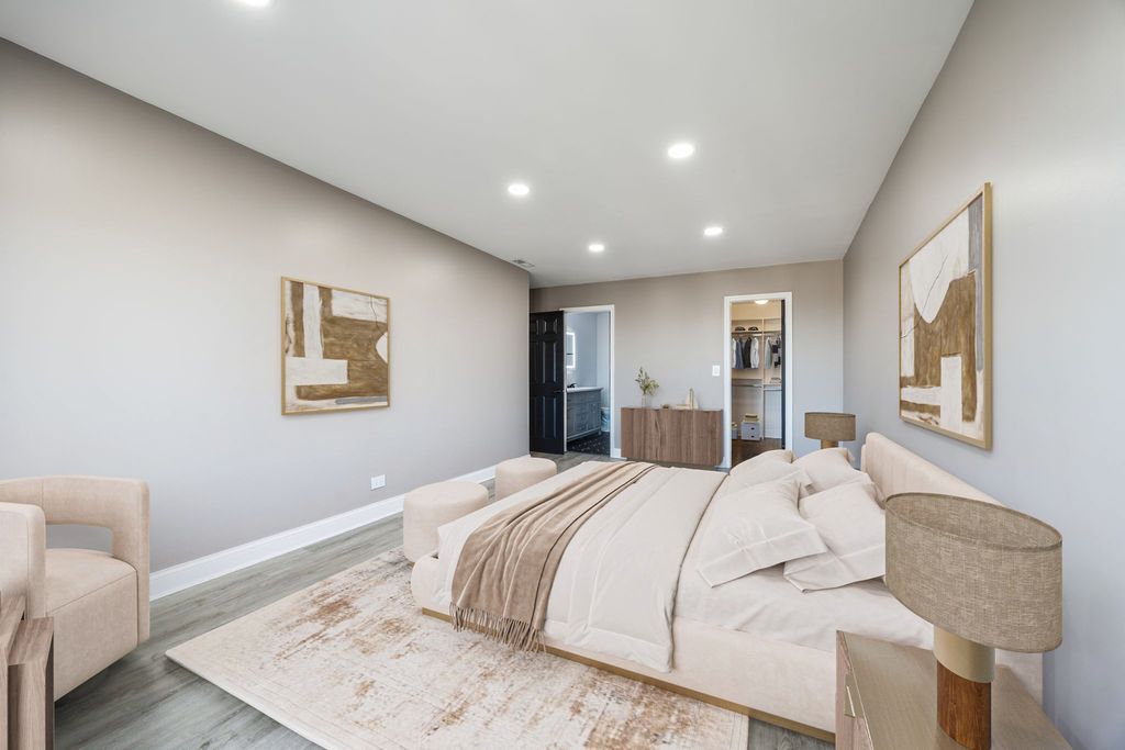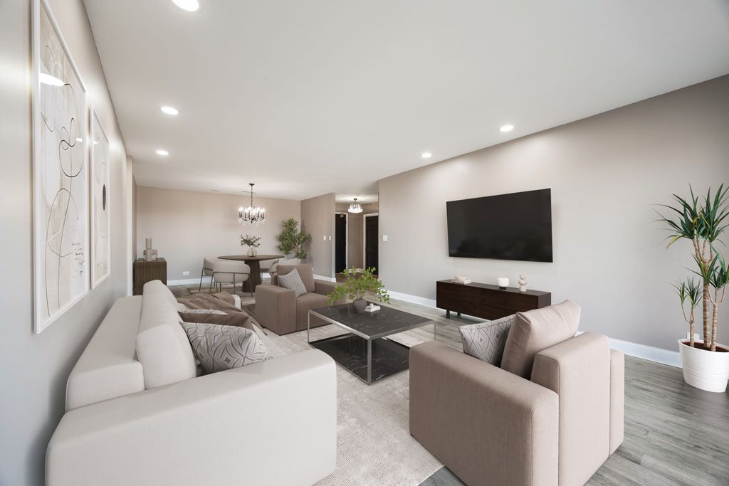 Welcome to one of the largest residences in Twin Manors West, an elevator building offering comfort and convenience. This spacious 3 bedroom, 2 bath condo features an extra large foyer with coat closet and an updated galley kitchen with soft close cabinetry, quartz countertops, vinyl flooring, recessed lighting, and a full appliance package. The expansive living and dining area opens to a north facing balcony accessible from both the living room and kitchen. Both bathrooms have been updated, and the primary suite offers a walk in closet. A walk in linen closet with custom organizers provides excellent storage. Enjoy a dedicated in unit laundry room with full size washer and dryer under warranty, plus a new HVAC system under warranty. Newer windows and fresh paint throughout make this home move in ready. Includes two heated garage spaces (#12 and #13), a same floor storage locker, ample guest parking in the rear, and a garbage chute on every floor. Residents also enjoy a main level party room. Conveniently located near Edens Expressway, I 294, Notre Dame College Prep, shopping, and dining.