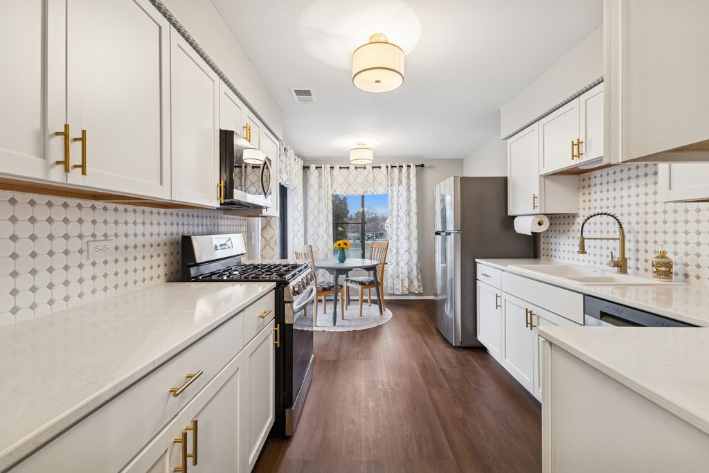 Beautifully renovated second floor condo featuring 2 bedrooms and 1.5 baths. As you open the door, the dining area to your right has new lighting and luxury vinyl plank flooring. When you enter the kitchen, you will see brand new shaker-style cabinets with brushed gold handles, a brand new quartz countertop with a porcelain sink and brushed gold faucet. The brand new backsplash and gold paper towel holder complete the look. All of the appliances are brand new, including refrigerator, dishwasher, microwave and oven/stove with five burners. Brand new lighting too. There is a coffee bar and eat-in area where you can enjoy a cup of coffee and look out your balcony through the sliding glass door. The oversized living room is perfect for entertaining, with a sliding glass door to your balcony where you can enjoy grilling in the summer. The convenient in-unit laundry room has a brand new washer and dryer, along with new lighting and tiling on the floor. The hall bathroom has a brand new granite vanity, faucet and lighting. The second bedroom has plenty of room for either a bedroom or an office. The master bedroom can fit a king-sized bed and sitting area. The attached master bathroom includes a brand new quartz vanity with faucet, brushed gold handles, a new toilet and new rainfall showerhead. And don't miss the walk-in closet in the master bedroom. The entire condo, which includes vinyl wood flooring throughout, has also been freshly painted. The water heater is new in October, 2025. The attached one-car garage is great and convenient. The HOA dues include water, a private pool and tennis/basketball courts. Close to Orland Mall and restaurants. Also, a one year home warranty is included.
