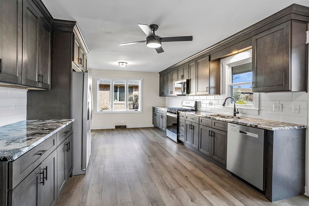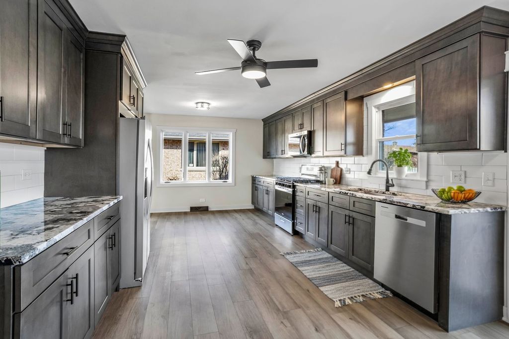 Welcome to 16027 91st Street - a beautifully UPDATED, truly move-in ready 4-bedroom, 2-bath split-level with a 2.5-car garage and great outside space! Inside, you'll love all the NEW modern finishes throughout including gorgeous wood-look, luxury vinyl plank flooring, fresh paint, white panel doors, updated trim and new fixtures. The stunning eat-in kitchen offers NEW cabinetry, stainless steel appliances, granite countertop, a stylish tile backsplash and SO MUCH SPACE! You'll love the primary bedroom featuring double closets and it's own private sink/vanity area that leads to an updated shared bathroom. For relaxing and entertaining, there is a light- filled, formal living room off the kitchen on the main level and a sprawling family room on the lower level with a stone fireplace and walk-out access to the backyard. The fully fenced backyard features a wooden deck, concrete patio, and also a storage shed - perfect for outdoor living. In addition to all the cosmetic updating, this home also features a NEW Roof (2025), NEW Fridge (2025), NEW Stove (2025), NEW Dishwasher (2025), NEW Microwave (2025), NEWER Furnace & A/C (2023), Ejector Pump (2022) and many NEWER Windows (2021) for added peace of mind! Conveniently located near LaGrange Road, shopping, dining, and within district 230 and 135 schools this home should check all your boxes!