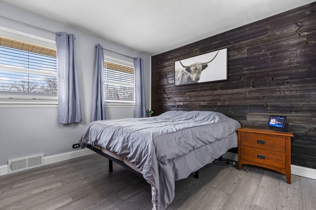 Well-kept 2-bedroom 1.5 full bath Ranch nestled in a quiet neighborhood in the heart of Loves Park. 1,600 sq ft of living space. Bright and airy living room with floor to ceiling windows. Spacious eat-in kitchen with freshly painted white cabinetry, new hardware, plank flooring, SS appliances & island with seating. French doors lead to family room with wood-burning fireplace & Pella patio doors. Partially finished basement adds valuable additional living space including rec room, office and large 1/2 bath. Huge, fenced yard with deck great for entertaining & garden shed for extra storage. Attached 1 car garage with lots of shelving for storage. Some newer windows, roof 2012, hardwoods under carpet.
