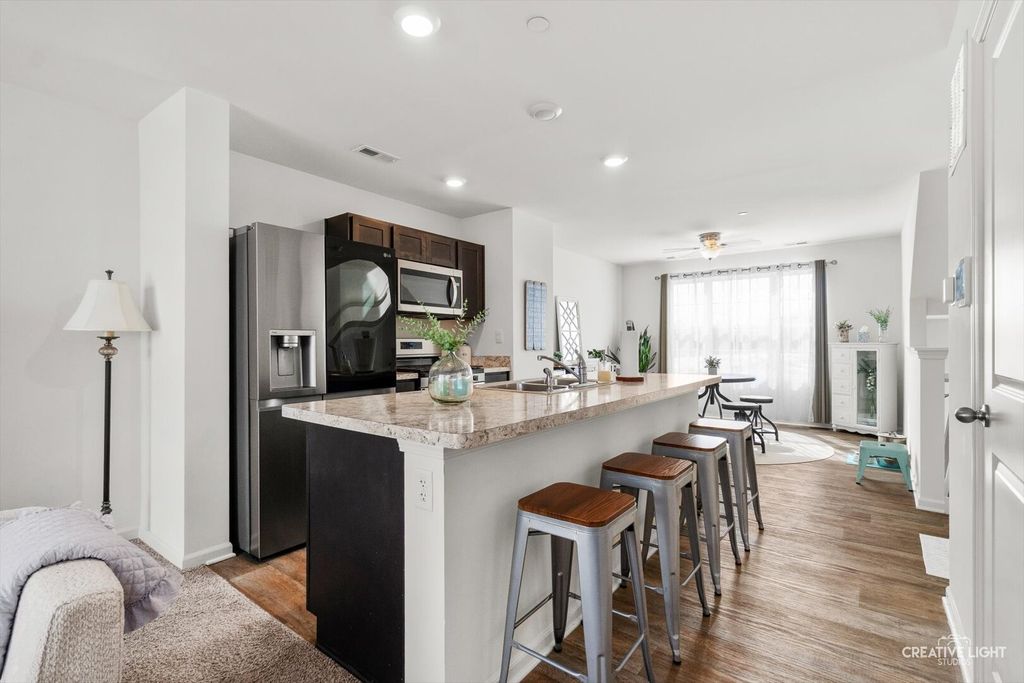 Welcome to this beautifully maintained, nearly new townhome in the sought-after Grande Reserve community of Yorkville! Thoughtfully designed living space, this stunning McKinley model features 2 spacious bedrooms, a versatile loft, 2.5 bathrooms, a finished bonus room, and a 2-car garage. The heart of the home is the stylish, upgraded kitchen-complete with designer cabinetry, stainless steel appliances, and a large island perfect for casual dining and entertaining. The open-concept layout flows seamlessly into the dining and great rooms, creating an inviting space for everyday living. Upstairs, you'll find a convenient laundry room and a generously sized primary bedroom with a walk-in closet. The additional loft and finished bonus room provide flexible options for a home office, playroom, or additional living space. Even better than new construction, this home comes fully equipped with upgrades typically not included-refrigerator, washer, dryer, and ceiling fans are all already in place. Enjoy a professionally landscaped, low-maintenance homesite and the added benefit of no additional SSA tax. Ideally located near an elementary school, parks, shopping, dining, and entertainment, this home offers both comfort and convenience. ** Currently leased through June 30th, it presents a fantastic opportunity for investors or future homeowners alike.