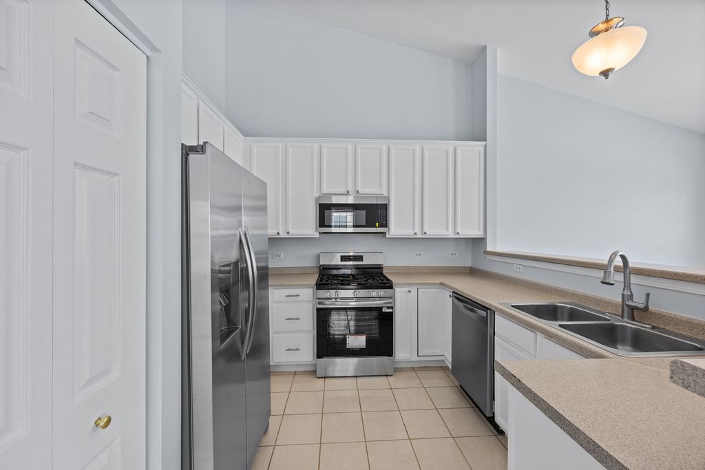 Move-in ready 3 bedroom/3 bathroom townhome in Hanover Park. This home offers new vinyl flooring throughout and new carpet in all bedrooms. The updated kitchen includes brand-new stainless-steel appliances and opens to a combined dining and living area with vaulted ceilings, creating a bright and open feel. Sliding doors off the living room lead to a balcony. The spacious primary suite includes an attached full bathroom and a walk-in closet. Additional highlights include a new in-unit washer and dryer, attached 2-car garage, and two additional exterior parking spaces in the driveway.