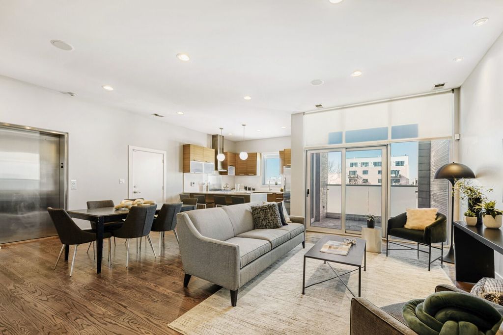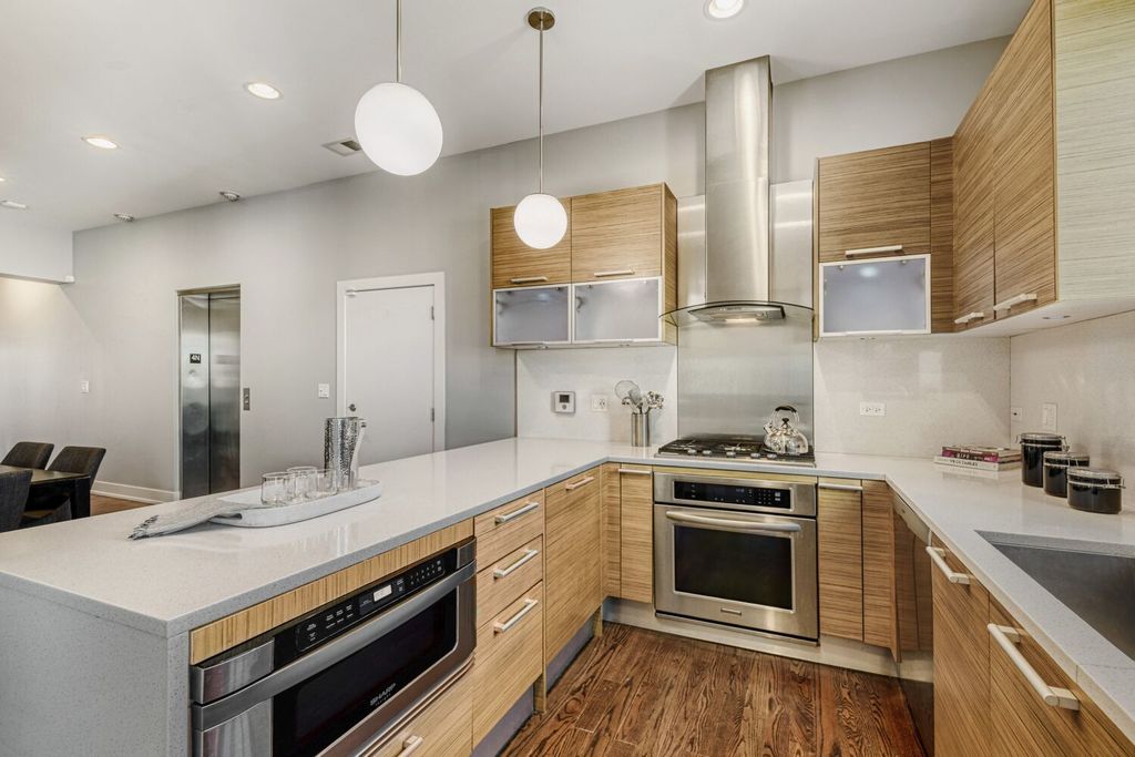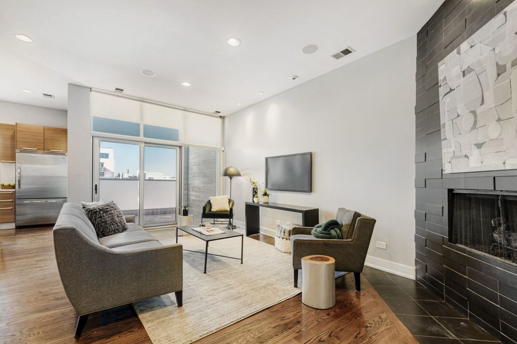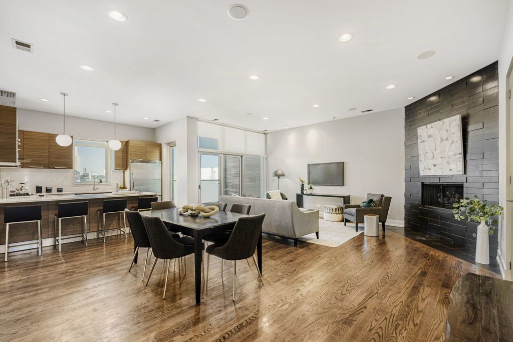 From the moment the elevator opens directly into your home, you're welcomed into a sun-drenched, expansive living space designed for both refined entertaining and comfortable everyday living. Situated in one of Chicago's most vibrant neighborhoods, you're moments from acclaimed dining, boutique shopping, parks, and convenient access to downtown. This sophisticated residence offers three spacious bedrooms and two full bathrooms, thoughtfully designed to combine comfort and modern elegance. Wide-plank hardwood floors run throughout the home, creating a warm and cohesive feel. A statement gas fireplace anchors the living room, while large windows flood the space with abundant natural light. Two attached private balconies provide seamless indoor-outdoor living, perfect for morning coffee or evening relaxation. Professionally designed custom closets maximize both style and storage, and the convenience of an in-unit washer and dryer adds ease to everyday living. Secure garage parking ensures both comfort and peace of mind. At the heart of the home is a stunning chef-caliber kitchen that serves as its true centerpiece. Outfitted with premium stainless steel appliances, the space is designed for both beauty and performance. With ample prep space and abundant storage, this kitchen is perfectly suited for hosting intimate dinners or large gatherings alike. Crowning this exceptional penthouse is a private rooftop oasis designed for unforgettable entertaining. The fully built-in outdoor kitchen makes al fresco dining effortless, complemented by dedicated dining and lounge areas that create an inviting atmosphere. Sweeping skyline views provide a breathtaking backdrop, making it the ideal setting for summer evenings, sunset cocktails, and memorable celebrations under the stars. Welcome Home.