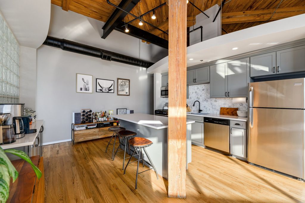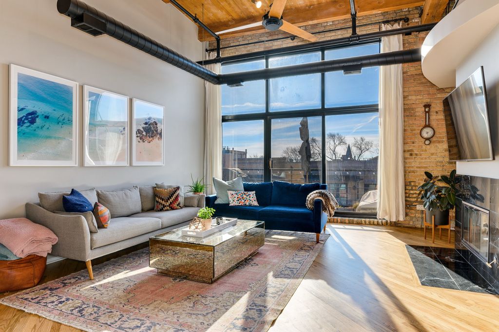 The moment you enter into this stunning brick and timber penthouse loft, you'll fall in love. Dramatic 15-foot ceilings and a striking wall of windows flood the space with incredible natural light. The elegant white, open-concept kitchen offers the perfect layout for entertaining. Unwind by the cozy wood-burning fireplace in the spacious living room, with direct access to your private balcony. The primary suite features a full wall of closets and an attached, beautifully updated white bath. The second bedroom boasts a dramatic wall of windows and a large walk-in closet outfitted with Container Store built-ins. A second full bath showcases an artful design sure to impress. Attached heated garage parking completes the home. Ideal location! Walk to the El, restaurants, boutiques, yoga studios, 606 and more. This one is not to be missed! Experience the perfect blend of modern luxury and convenience in a prime location.