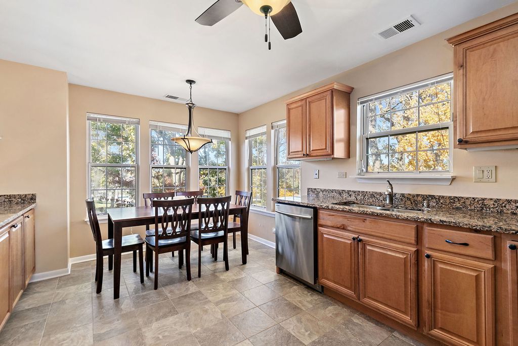 Sharp (2nd floor) end unit condo / townhome with a private entrance and one car attached garage (extra parking on asphalt driveway). Step into a massive Living room / Dining room space with vaulted ceiling & custom gas fireplace and door to oversized balcony space overlooking the pristine green space. 3rd Bedroom is currently used as a Den / Home office and perfect for those who work from home or need the 3rd bedroom space. Updated warm and inviting kitchen space with stainless steel appliances, granite counters, and plenty of room for the entire family or entertaining. Master bedroom with vaulted ceiling, two closets and private bathroom with soaker tub, & separate shower. Laundry in-unit (Washer and Dryer are included). Enjoy the subdivision clubhouse and pool. Highly desirable school districts 54 & 211.