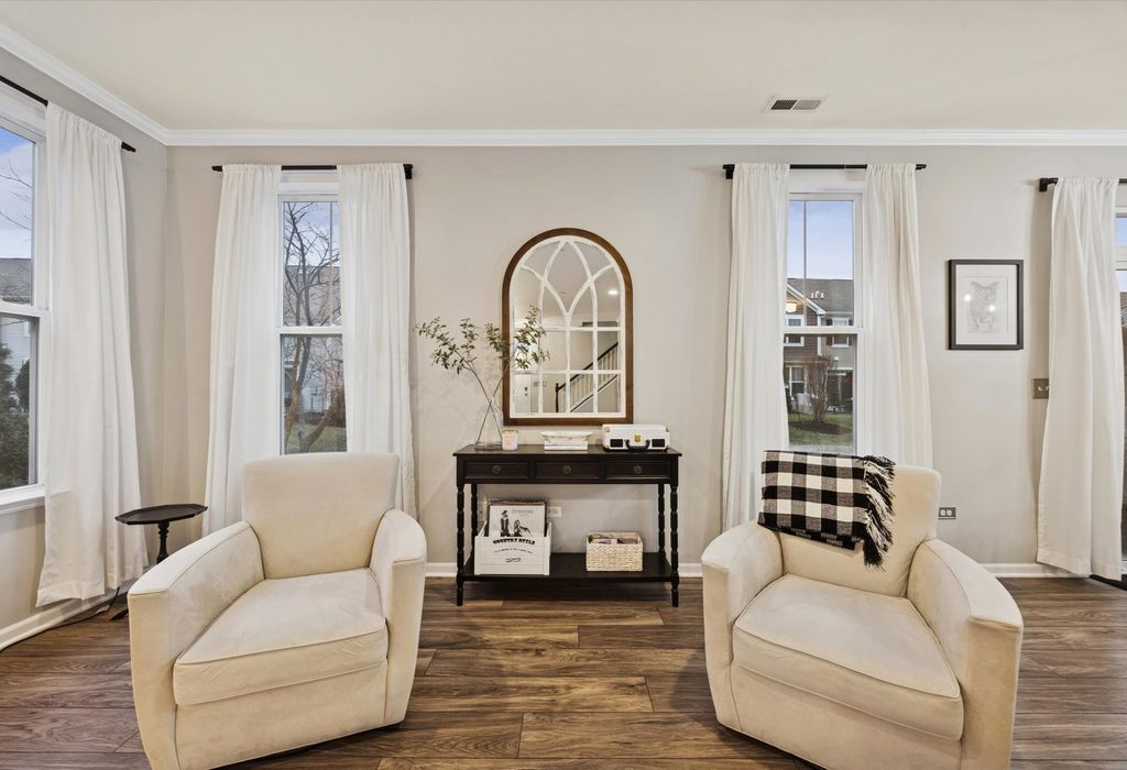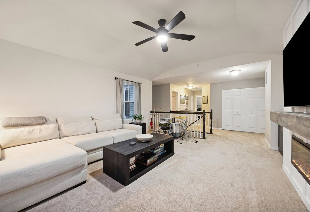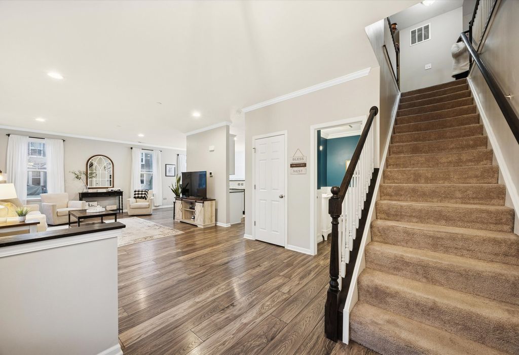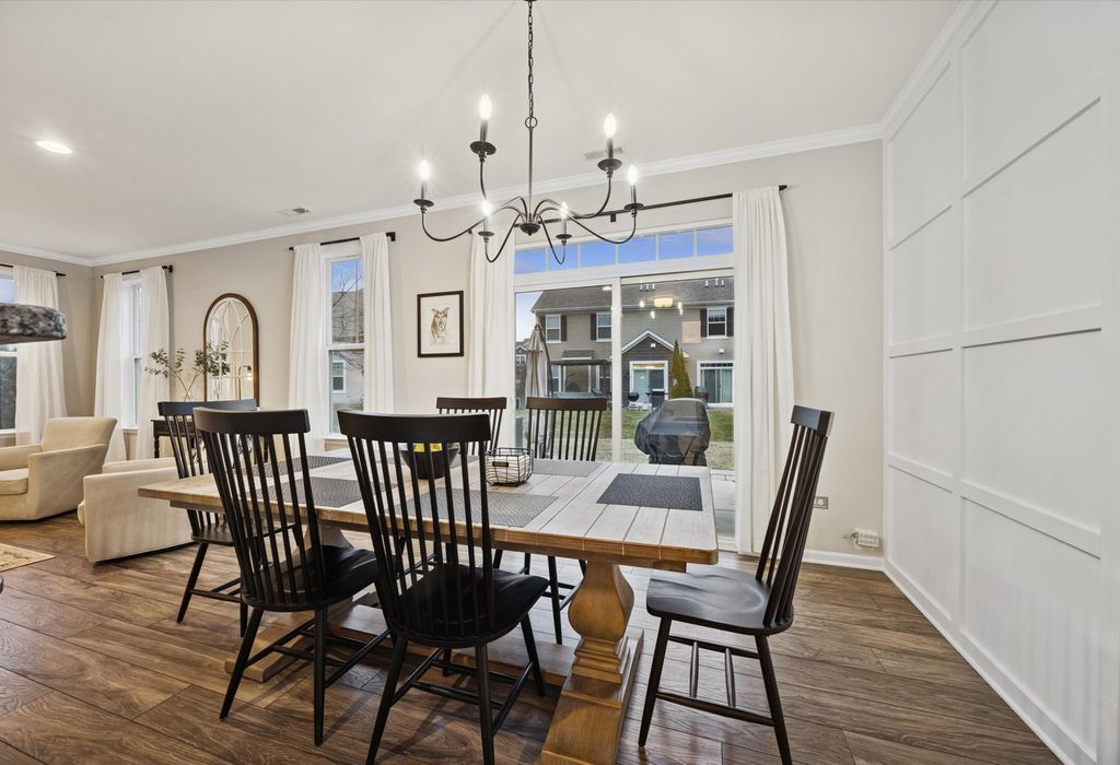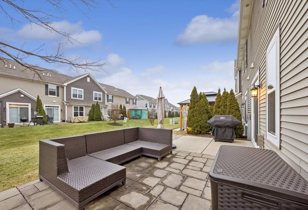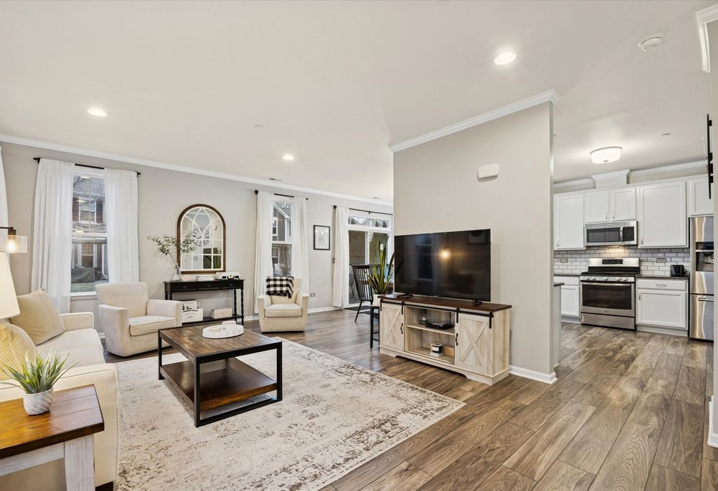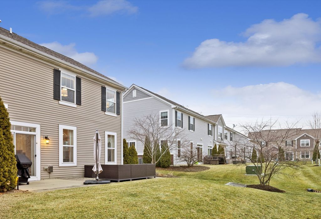 This fully upgraded, showstopping end-unit townhome is bursting with modern decor & finishes throughout! Step up to the covered front porch & you are welcomed into a spacious living room adorned with elegant details such as crown molding, hand-scraped plank flooring, & recessed lighting. Featuring a designer kitchen with abundant 42" white shaker cabinetry; gleaming granite countertops; stainless steel appliances; subway tile backsplash; & spacious dining area with newer black chandelier & decorative accent wall. Perfect for gatherings, the kitchen connects seamlessly to the living & dining rooms. The dining room features sliding glass doors leading to the expanded paver patio - the perfect place to enjoy downtime outdoors. The main floor also features soaring 9 ft. ceilings, updated light fixtures throughout (2022), 6-panel white doors, a chic, remodeled powder room (2023), mud room with custom built-in hall tree bench with hooks, PLUS there's still plenty of storage space & easy access to mechanicals. Upstairs, you'll find the spacious primary suite with walk-in closet & full bath with oversized walk-in shower. The large loft remodeled in 2022 features an electric fireplace built into an accent wall flanked with added built-ins on either side, a tray ceiling with new ceiling fan, & convenient second floor laundry closet featuring high efficiency washer / dryer. Also upstairs is the second bedroom & additional full bath. The spacious two-car garage has epoxy flooring & features tons of storage options. Hardwired exterior lighting was added in 2024 to the front, back, & walkways - adding elegance in the evening that really makes this home stand out! With well-maintained mechanicals new in 2016, there truly is nothing to do but move into this beautiful home! Close to world renowned golf courses & abundant shopping; dining; & transportation options - all within 35 miles of Chicago. Do not let this one get away!