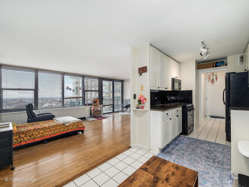 East Lakeview at its best! This sun-filled 1-bedroom, 1-bath high-rise home offers a 22' living room, oversized windows, and beautiful views from a generous 12' x 5' private balcony-perfect for sunset evenings. Ideal layout for entertaining with a separate dining area that also works perfectly as a home office. The welcoming foyer features a coat closet, pantry closet, and a rare double-wide closet. Updated kitchen includes granite counters, gas range, and excellent storage. Updated bath, fresh neutral paint, and hardwood floors throughout. Spacious bedroom easily fits a king-size bed. Full-amenity building with 24-hour door staff and on-site management. Walk to the lakefront trail, Belmont Harbor, Lincoln Park, restaurants, shopping, express bus, and Wrigley Field. Investor-friendly with valet parking available.