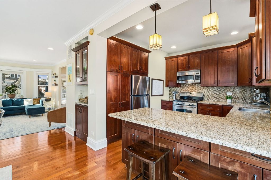 Refined, design-forward living on a quiet tree-lined street. This impeccably maintained 3-bedroom, 2.5-bath residence offers 1,740 sq ft of thoughtfully curated living space, complemented by a fully finished basement and an exceptional list of high-quality improvements. The sun-drenched, south-facing kitchen serves as the heart of the home, flooding the main living areas with natural light. Recently refreshed with designer-inspired paint throughout the kitchen, family room, trim, walls, and ceilings (2025), the interiors feel both timeless and elevated. Outdoor living is equally refined, featuring low-maintenance Trex front and back porches with integrated storage access (2020), a beautifully crafted brick patio (2015), and professionally designed native landscaping in the front yard and parkway (2021). A cedar privacy fence frames the space, creating a serene and private outdoor oasis. Craftsmanship and longevity shine through with Hardie board siding on both the home and garage, enhanced by newer garage windows (2013). Additional upgrades include all new concrete walkways (2018), stained glass exterior windows (2022), an upstairs bathroom window (2022), plush basement carpeting (2022), and a fully organized utility/mudroom with custom shelving. Mechanical and appliance updates provide peace of mind, including a water heater (2018), washer (2021), refrigerator (2021), and dishwasher (2023). Thoughtful restoration of antique door hardware adds a subtle layer of historic elegance. Set on a 35 x 125 lot in one of Oak Park's most peaceful enclaves, this home offers a rare combination of architectural charm, modern luxury, and tranquil living-moments from parks, schools, and village amenities.