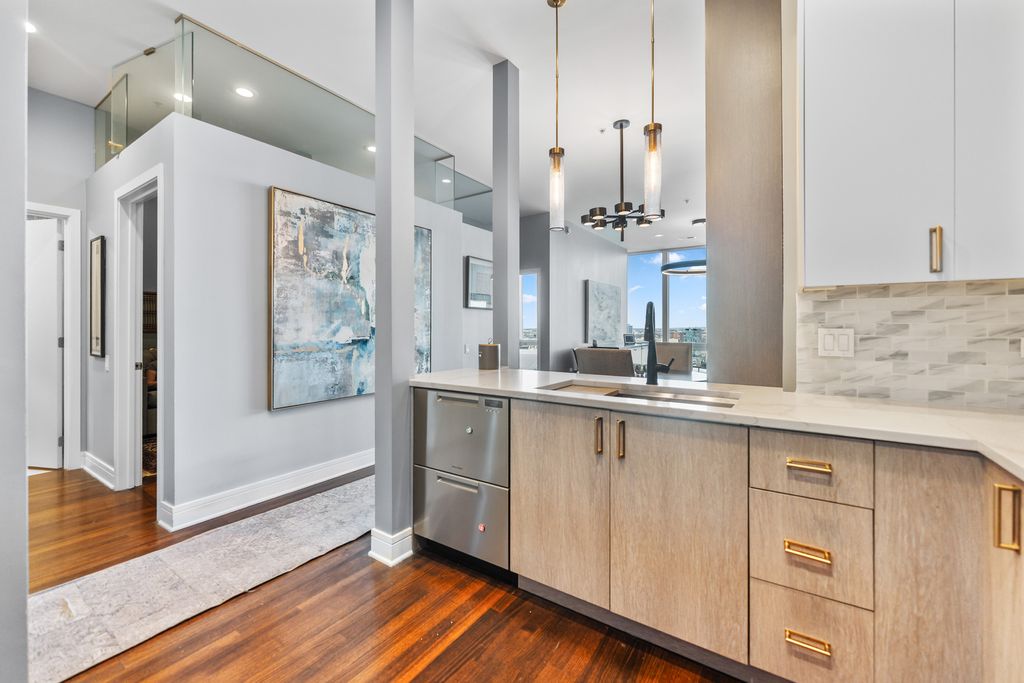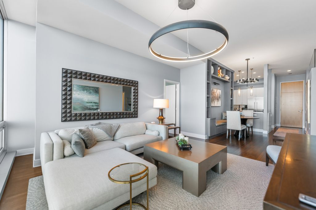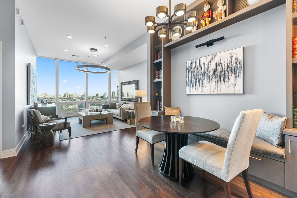 This exquisite 3-bedroom, 2.1-bath residence at The Montgomery offers refined modern luxury with expansive north-facing city views and glimpses of Lake Michigan beyond. Exceptionally high ceilings, floor-to-ceiling windows, and solid concrete construction create a remarkably quiet, light-filled living environment. Since 2017, the seller has made significant improvements throughout the home. The fully renovated kitchen features all-new custom cabinetry, appliances, and fixtures, the removal of a hallway wall to enhance flow, and a dramatic waterfall countertop. Built-in dining cabinetry with integrated lighting adds both function and architectural interest. Additional updates include refinished and re-stained hardwood floors, wood flooring added to all three bedrooms, glass transom to 3rd bedroom, new designer lighting throughout and extensive custom storage. The spacious primary suite is a true retreat with amazing North views, offering generous custom closets by Closet Works and a spa-like renovated bath with a fully tiled walk-in shower. The second bedroom, with floor-to-ceiling windows, is well-sized and privately situated. The fully enclosed third bedroom-currently styled as a den- maintains natural light while providing privacy, along with a very large closet and excellent storage. The second full bath has been fully updated including flooring, along with the updated powder room and in-unit laundry to complete the unit. The Montgomery is one of River North's most distinguished full-service luxury buildings, known for its architectural pedigree, high service level, and exceptional management with long-term door and maintenance staff. Amenities include 24-hour door staff, on-site management and maintenance, fitness center, party room, bike room, additional storage, and beautifully maintained common areas, including a landscaped "north lawn" with seating areas, grills, and fire pits. The building is pet-friendly, including large dogs, and features a private, secure dog run-one of the largest in the city. Ideally located to the Loop, Chicago Riverwalk, Michigan Avenue, Montgomery Park, and neighborhood favorites including East Bank Club, BIAN private club, Target, Mariano's, Whole Foods, AMC and premier dining-this is modernist luxury living at its finest. Attached garage parking available for $35,000.