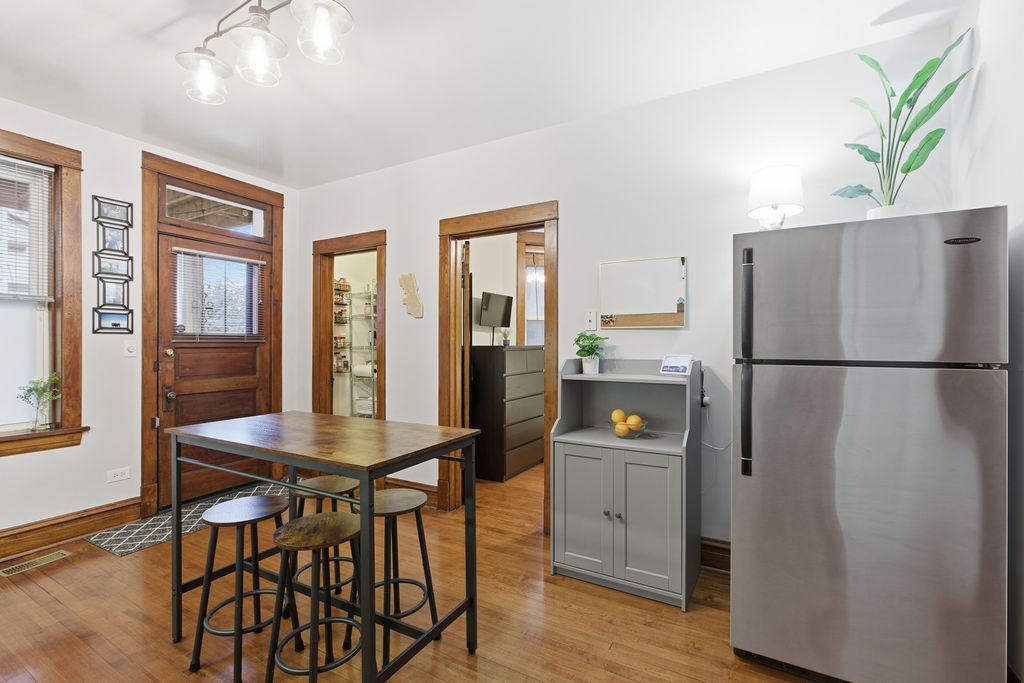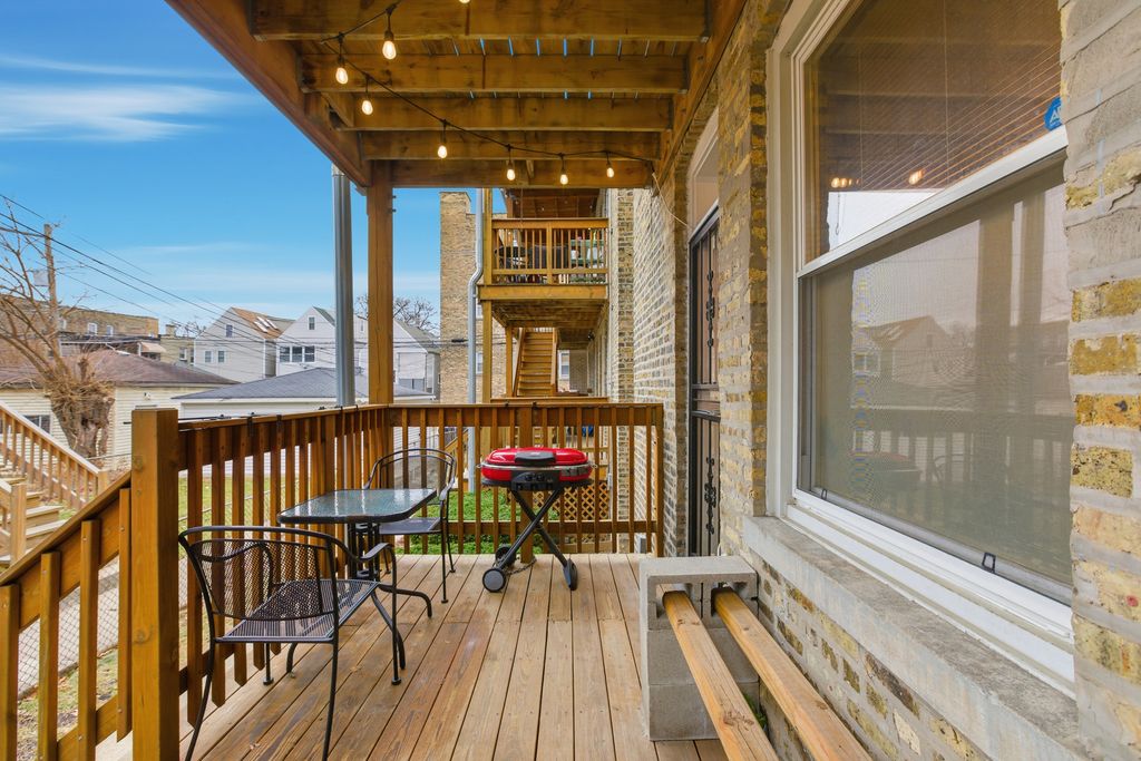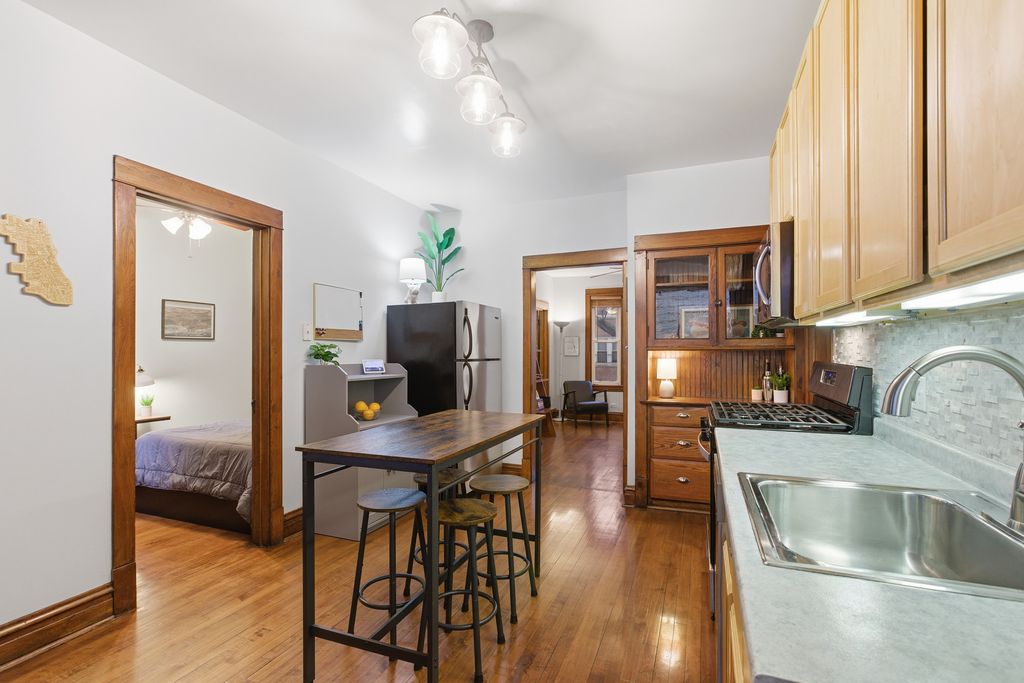 This elevated first floor, 2-bedroom, 1 bathroom condo is nestled on a quiet, treelined street in the heart of Avondale. This inviting home blends classic Chicago character with thoughtful updates and bay windows, allowing natural light to pour in. The condo features hardwood floors, original woodwork, and a spacious kitchen with 42" maple cabinets, stainless steel appliances, walk in pantry, and a beautiful original built-in hutch. Enjoy a private rear deck, in-unit laundry room, and an enormous storage room. Recent updates include a new stove, microwave, dishwasher, and washer/dryer in 2023. Located just steps from the Addison Blue Line, Athletic Field Park, and I-90/94, this home offers unbeatable access to transit, neighborhood amenities, and an easy commute in any direction. Enjoy the best of Avondale which was recently ranked one of the coolest neighborhoods in the world for 2025 by Time Out! The nearby cafes, restaurants, and local favorites make this community so beloved.