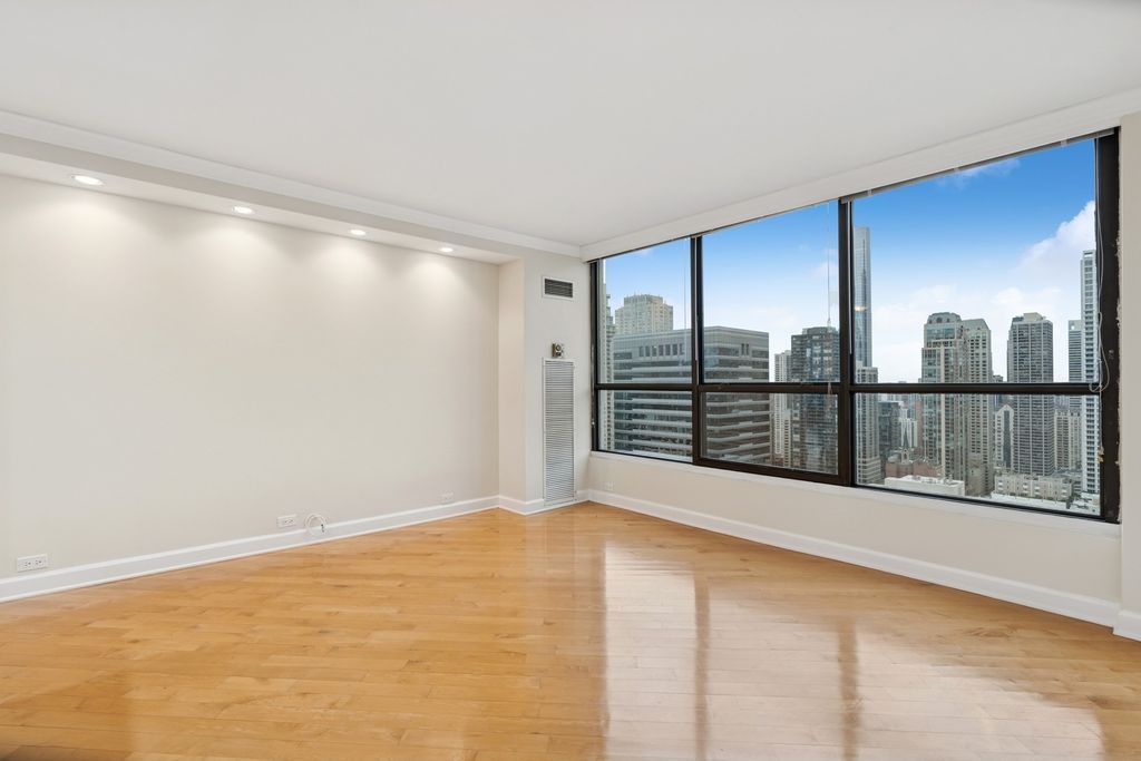 Spectacular high-floor 1-bedroom with a beautifully remodeled kitchen in the full-amenity River Plaza, ideally located along the Chicago River in the heart of River North. Bright and airy with stunning city views, this residence features hardwood flooring throughout and a thoughtfully designed layout. The updated kitchen offers stainless steel appliances, shaker-style cabinetry, granite countertops, breakfast bar, and subway tile backsplash. Spacious living and dining area with excellent natural light. Generous bedroom with ample closet space including a large walk-in entry closet plus additional storage. Well-appointed bath with marble vanity, natural stone tile, and multi-jet shower system. Freshly painted in 2025 and move-in ready. Full-service building with 24-hour door staff, indoor pool, hot tub, sundeck, fitness center, hospitality room, business center, package receiving, valet cleaners, and on-site management. HOA includes heat, A/C, cable, and high-speed internet. Strong reserves at 2.9M with no planned special assessments. Owner occupancy 62/100. No rental cap. One-year lease minimum. No in-unit laundry permitted. On-site laundry available. Garage parking available for lease or purchase. Prime location steps to the Chicago Riverwalk, Michigan Avenue, dining, shopping, nightlife, and public transportation. Tenant occupied until June 30th.