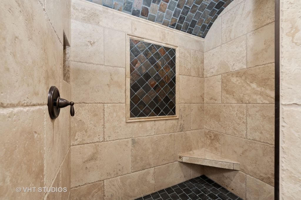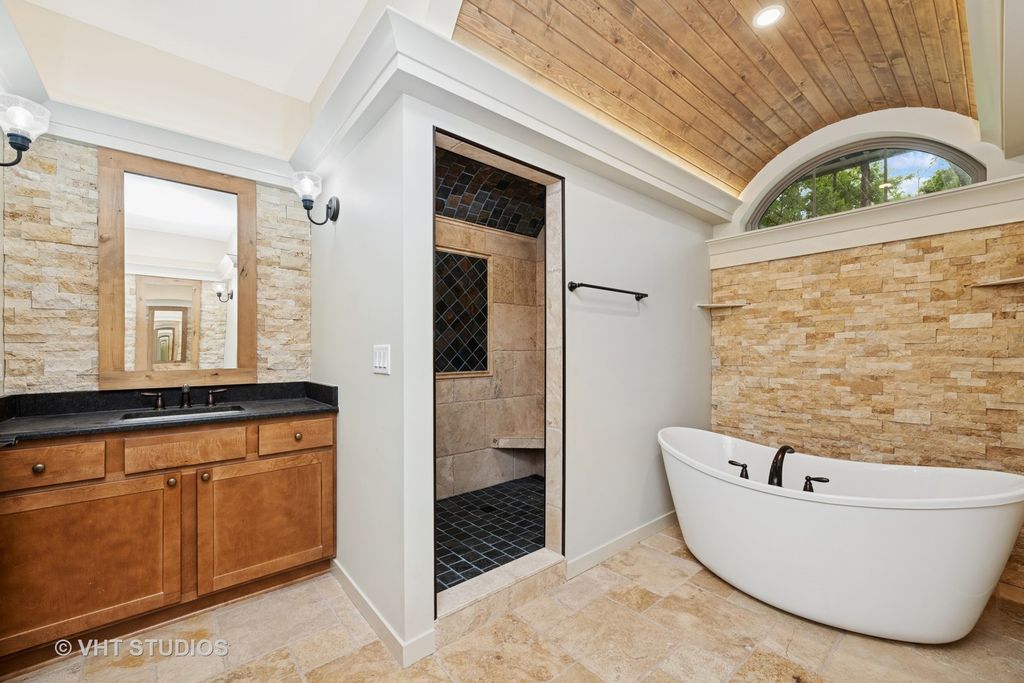 Rustic exposed beams accented with barrel ceilings and custom wall niches introduce this French Country two story home. You'll find an open layout with the living room, three season room and kitchen featuring an expansive island, 42 inch cabinetry with stone backsplash, stainless steel appliances including high-end Viking stove, and stunning leathered granite countertops with copper sink and pendant lighting. A sought after first floor main suite offers his & her walk-in closets, and stunning lux bath equipped with free standing soaking tub, his & her vanities and large custom shower showcasing tiled barrel ceilings. The home features a formal dining room and laundry room smartly located just off the oversize 2.5 car garage. Upstairs is home to a spacious recreation room, full bath, and two additional bedrooms, and the lower level is ready for your finishing touches with it's roughed in bath. The home rests atop a beautifully wooded .67 acres in Knottingham Woods of Spring Grove and offers a beautiful serene setting to call home.
