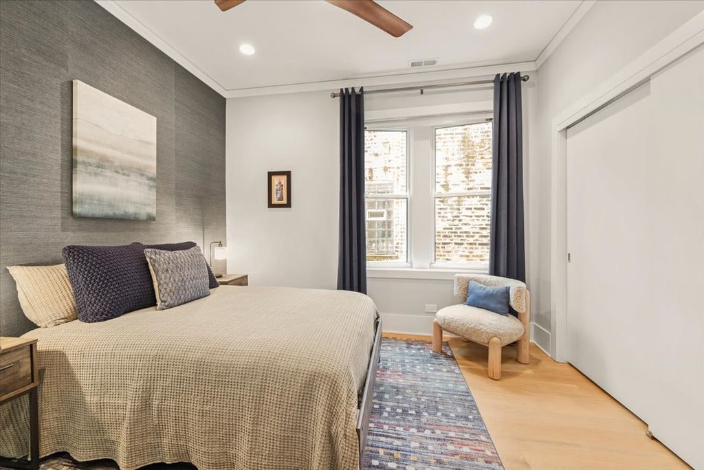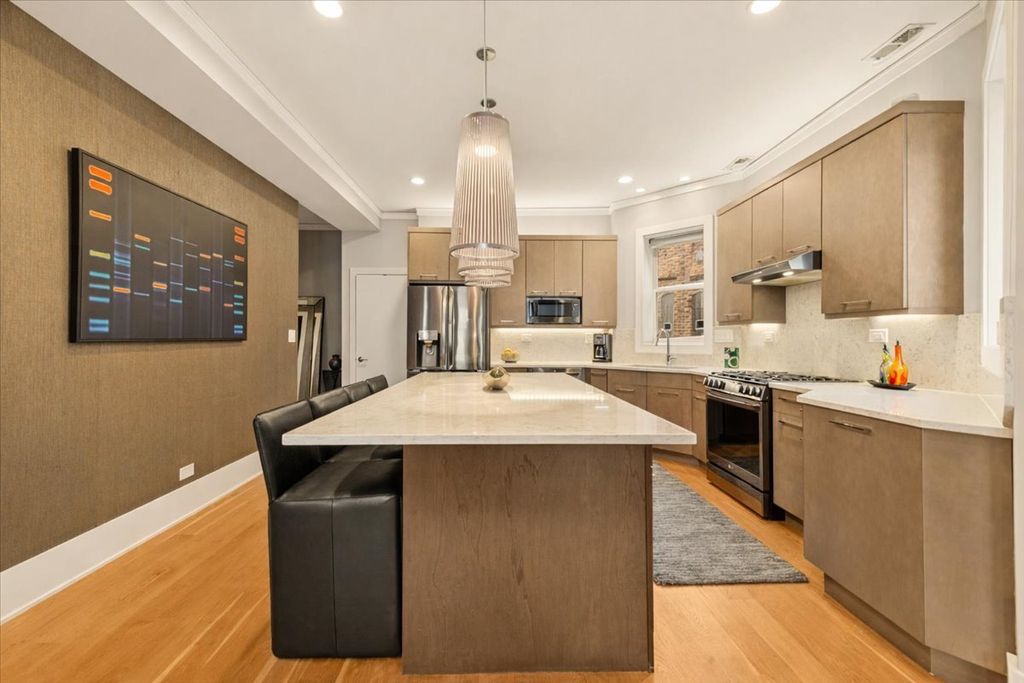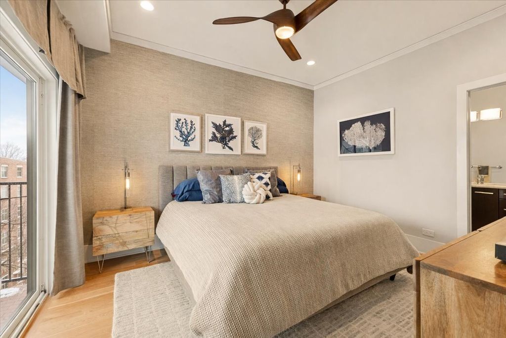 Luxe Living in the Heart of Andersonville. Refined 1400 sq ft 2-bedroom, 2-bath full floor residence located in an intimate 3 unit on a 30x140 lot allowing for larger floorplans & a real back yard in Andersonville. Thoughtfully designed for both everyday comfort and entertaining, this professionally curated home has wide-plank white oak hardwood floors, 8-inch baseboards, and custom designer lighting throughout. The extra wide living area anchored by a gas fireplace creates a relaxing atmosphere. A Chef's kitchen blends form and function with 42-inch cabinetry, quartz countertops, 2023 LG black stainess appliances and a statement custom island with seating and dining for up to eight, plus space for a formal dining table or as my clients use it a TV area. The tranquil primary suite offers a true retreat with a custom walk-in closet and spa-inspired ensuite bath featuring Carrera marble, a dual vanity, and an oversized two-person shower with custom glass enclosure. There is a separate walk in utility room which includes a full-size new LG ThinQ washer & dryer & additional storage. Designed to seamlessly connect indoor and outdoor living, the home features a large sliding glass door off the primary bedroom and direct hallway access to a spacious north-facing private deck complete with gas line and water spigot-perfect for grilling, entertaining, or gardening. The building also offers a beautifully landscaped shared backyard with fire pit, lounge seating, gas grill, gravel dog walk. One garage parking space is included and XL storage downstairs. A+ location steps to Andersonville's acclaimed dining, elevated boutiques, coffee shops, nightlife, lakefront beaches, and everyday conveniences. Easy access to public transportation, including the Bryn Mawr and Berwyn Red Line stations.