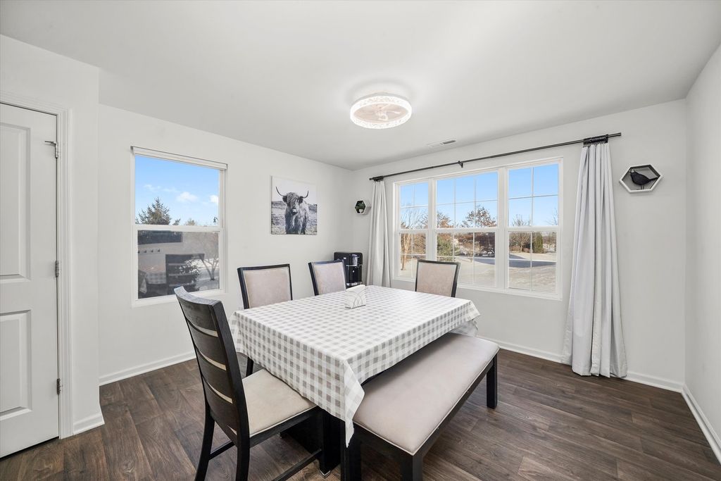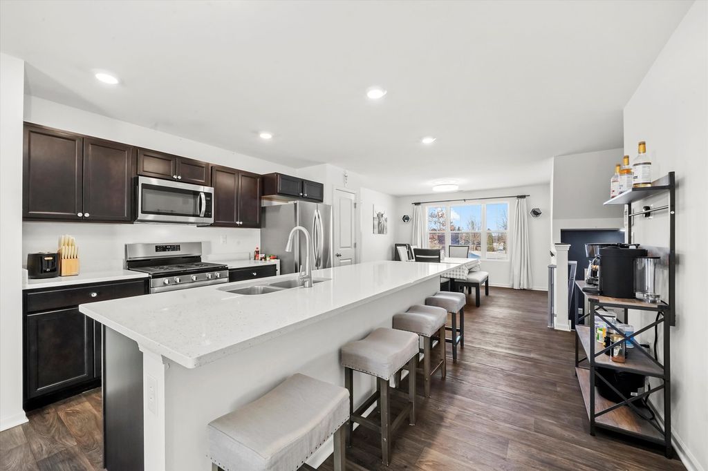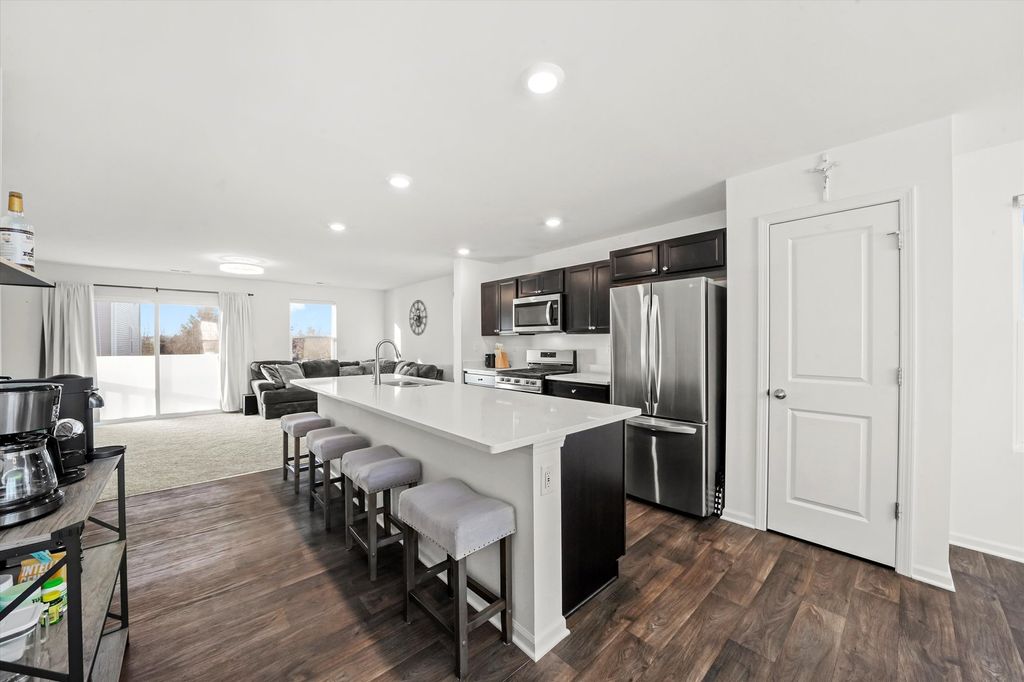 WOW, what a beautiful townhome and the location is absolutely amazing! Features include a desireable end-unit, a bright and open layout ideal for everyday living and entertaining. The kitchen showcases elegant quartz countertops, a convenient breakfast bar, and a dedicated dining space that flows seamlessly into the main living area. The home offers three bedrooms, two and a half baths, plus a finished lower-level family room for added flexibility. The oversized garage provides ample depth. Enjoy peaceful views of well-maintained green space throughout the seasons. Located just steps from Stone Water's amenities, residents have access to scenic walking paths, tranquil ponds, parks, a community center, and a resort-style pool complete with a splash pad. Trust me, you will want to live here year round!