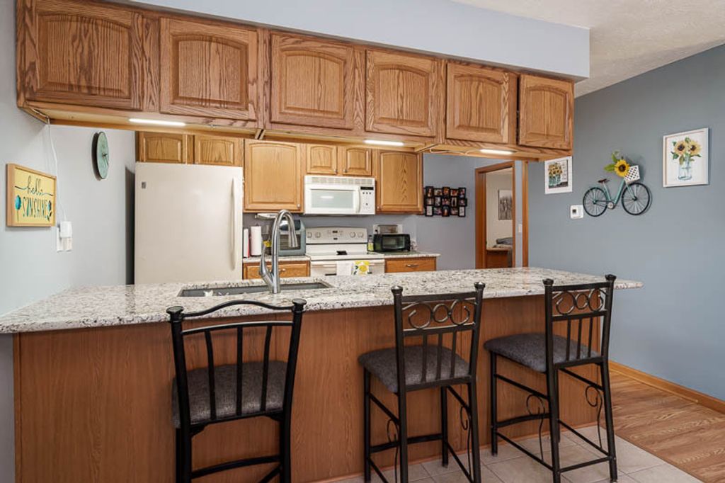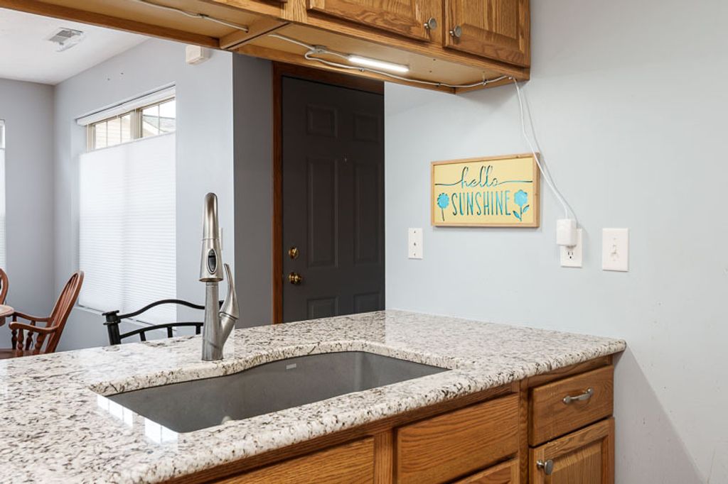 Convenient main-floor condo that has been well cared for and nicely updated. The kitchen features granite countertops, neutral colors, and a new sink. The laundry room includes custom built-in cabinets, and the washer and dryer stay for added ease. The primary bedroom offers a walk-in closet and private ensuite bath. Outside, the patio has a private feel with tree-lined surroundings that make it feel more secluded and enjoyable. Additional highlights include a two-car garage, new water heater, and water softener. A comfortable, practical home with thoughtful touches and low-maintenance living.