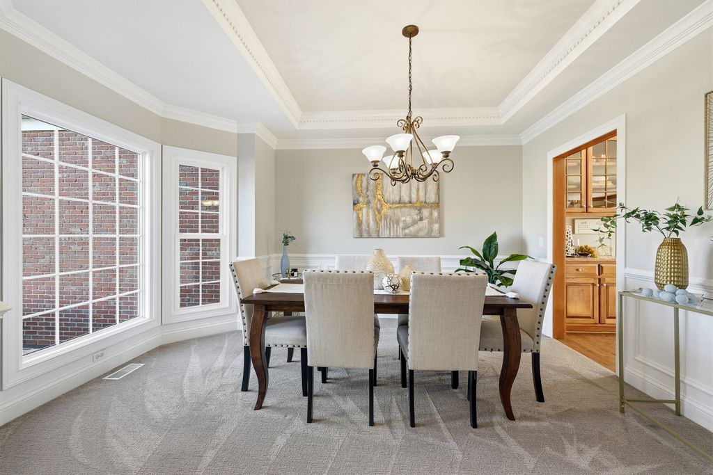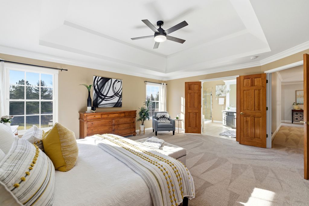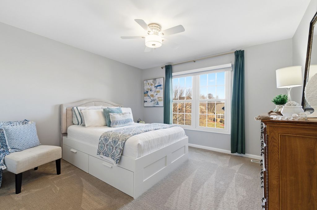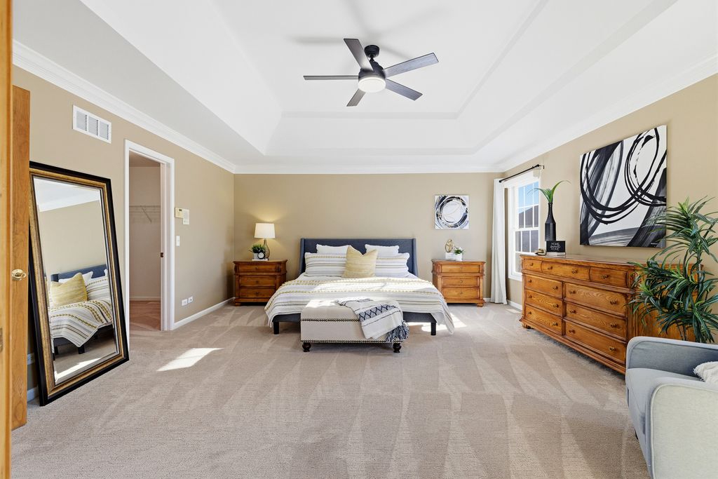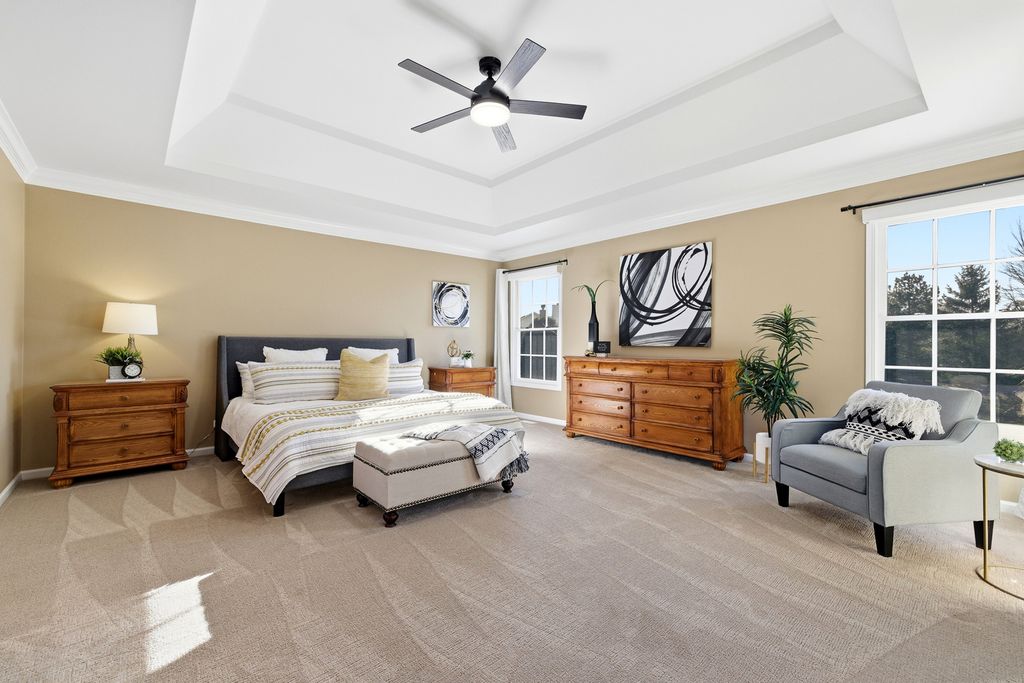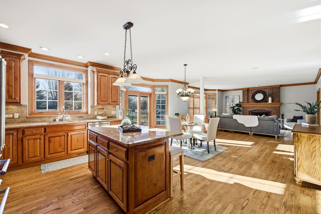 Former Builder's Model with 4,200 Sq Ft of Finished Living Space! This stunning 6-bedroom, 2.5-bath home offers exceptional design, space, and craftsmanship throughout. The striking brick and stone exterior welcomes you into a dramatic two-story foyer accented by crown moulding. The open floor plan features hardwood floors in the foyer, kitchen, and family room, along with 9-foot ceilings and abundant natural light. The family room is anchored by a gas-start, wood-burning fireplace-perfect for cozy evenings. The expansive kitchen is a chef's dream with 42" solid wood cabinetry, under-cabinet lighting, granite countertops, travertine backsplash, recessed lighting, a large island with seating, dry bar area, and KitchenAid stainless steel appliances including a double oven. A generous eating area completes the space. The main level also offers a private den with new carpet, and maple wainscoting and crown moulding. First floor laundry with sink and closet. Many freshly painted rooms throughout the home. Upstairs, the luxurious primary suite impresses with a tray ceiling, an incredible 30' walk-in closet, and a spa-like bath featuring new quartz countertops, a skylight, soaking tub, separate shower, dual vanities, and a private water closet. Three additional well-sized bedrooms-each with walk-in closets-and a hall bath with quartz counters and vaulted ceiling complete the second level. The finished basement expands the living space with new carpet, a massive recreation room, two spacious rooms ideal for bedrooms, fitness, or flex space, and a large storage area. Enjoy outdoor living in the professionally landscaped backyard featuring a brick paver patio, sprinkler system, fenced ornate garden enclosure, and additional open yard space beyond. Backyard goes all the way to the berm. Major updates include furnace and A/C (2019). Ideally located near lakes, walking paths, shopping, and dining-this home truly has it all. (Agent related to seller)