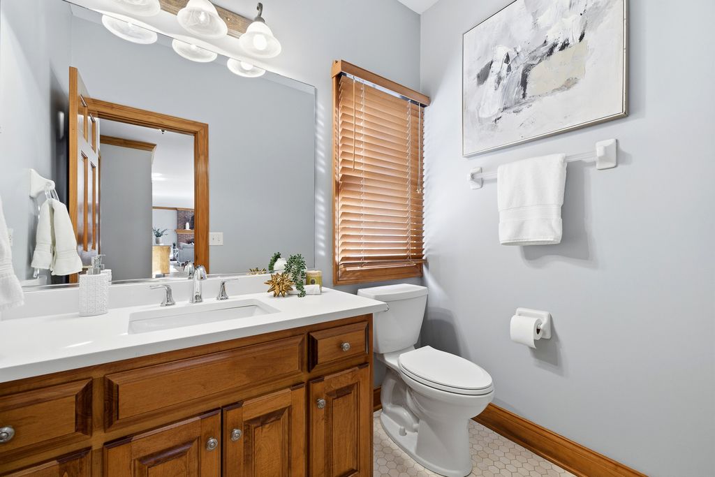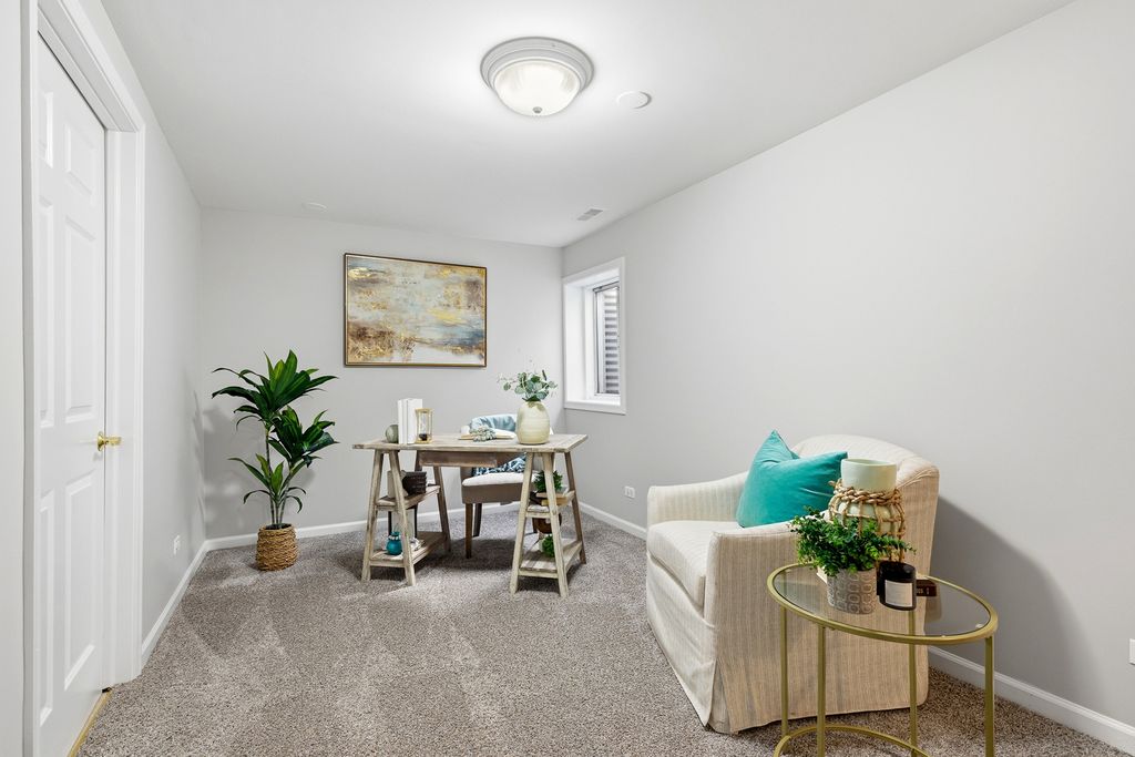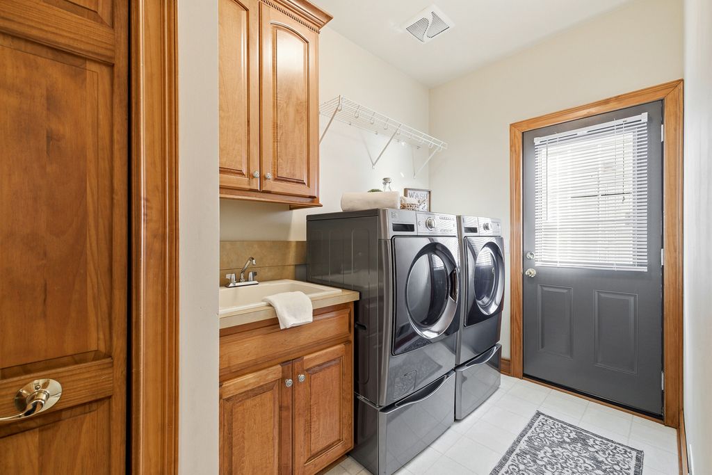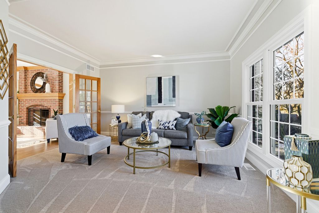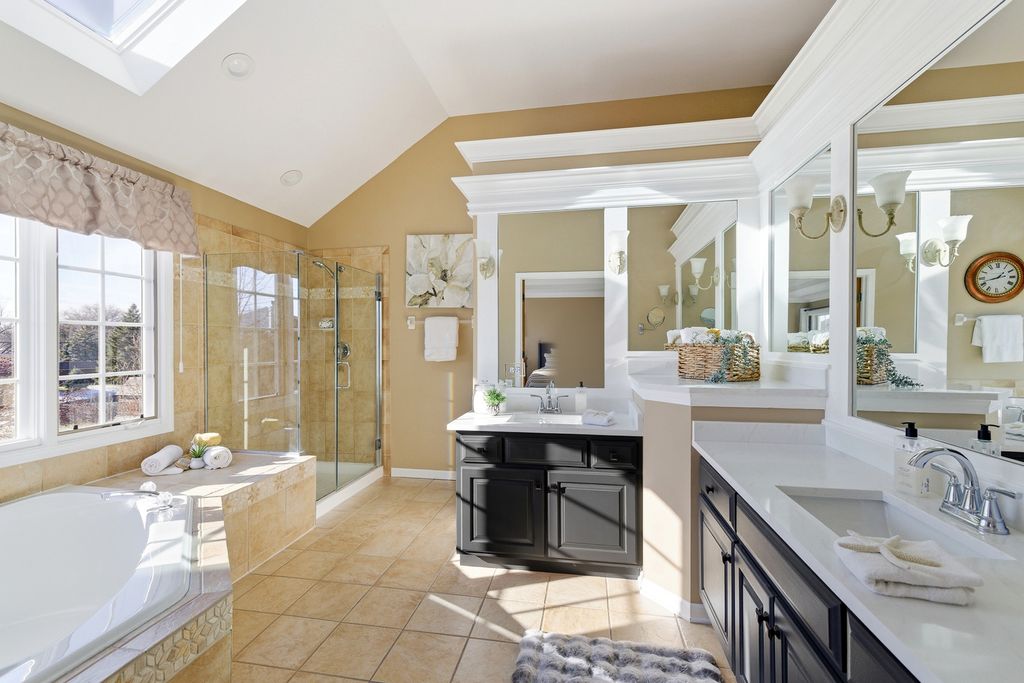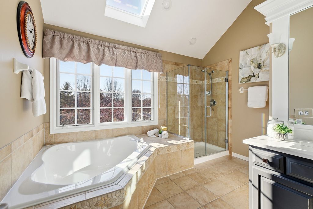 Former Builder's Model with 4,200 Sq Ft of Finished Living Space! This stunning 6-bedroom, 2.5-bath home offers exceptional design, space, and craftsmanship throughout. The striking brick and stone exterior welcomes you into a dramatic two-story foyer accented by crown moulding. The open floor plan features hardwood floors in the foyer, kitchen, and family room, along with 9-foot ceilings and abundant natural light. The family room is anchored by a gas-start, wood-burning fireplace-perfect for cozy evenings. The expansive kitchen is a chef's dream with 42" solid wood cabinetry, under-cabinet lighting, granite countertops, travertine backsplash, recessed lighting, a large island with seating, dry bar area, and KitchenAid stainless steel appliances including a double oven. A generous eating area completes the space. The main level also offers a private den with new carpet, and maple wainscoting and crown moulding. First floor laundry with sink and closet. Many freshly painted rooms throughout the home. Upstairs, the luxurious primary suite impresses with a tray ceiling, an incredible 30' walk-in closet, and a spa-like bath featuring new quartz countertops, a skylight, soaking tub, separate shower, dual vanities, and a private water closet. Three additional well-sized bedrooms-each with walk-in closets-and a hall bath with quartz counters and vaulted ceiling complete the second level. The finished basement expands the living space with new carpet, a massive recreation room, two spacious rooms ideal for bedrooms, fitness, or flex space, and a large storage area. Enjoy outdoor living in the professionally landscaped backyard featuring a brick paver patio, sprinkler system, fenced ornate garden enclosure, and additional open yard space beyond. Backyard goes all the way to the berm. Major updates include furnace and A/C (2019). Ideally located near lakes, walking paths, shopping, and dining-this home truly has it all. (Agent related to seller)