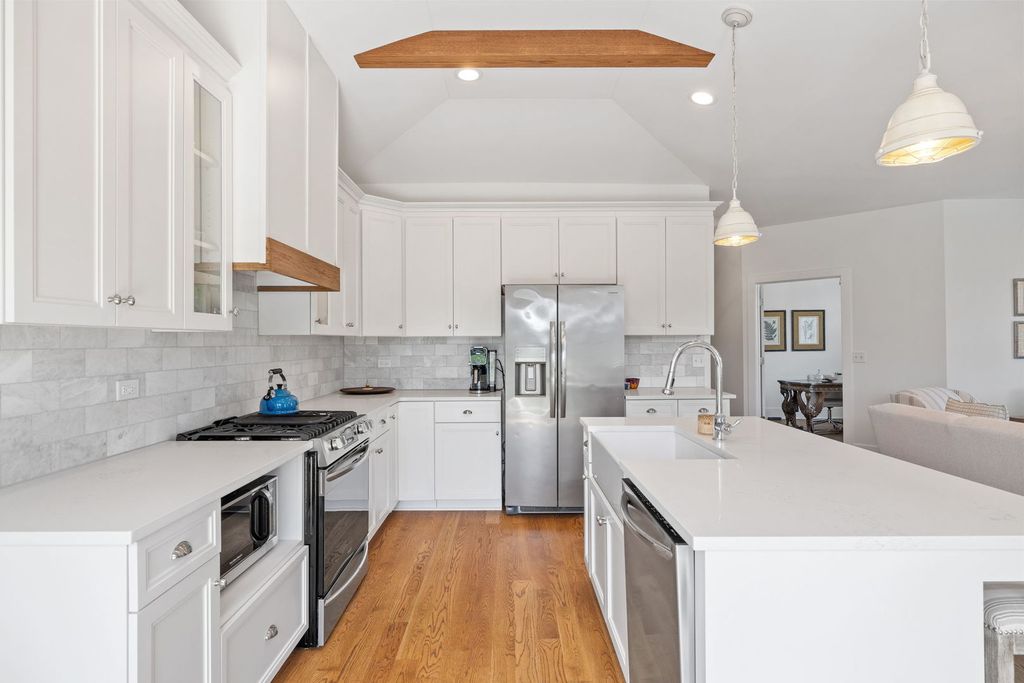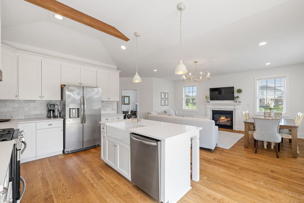 Looking for the perfect place to call home in 2026? Better than new construction, this stunning duplex in the sought-after Sunset Lakes subdivision offers luxury, low-maintenance living at its finest. Built in 2021 and meticulously upgraded throughout, this home is just five years young and shows like a model - but better. Situated on a premium lot at the end of a quiet dead-end street, you'll love the added privacy and expansive green space surrounding the home, unlike any other lot in the neighborhood! Inside, the thoughtfully designed layout offers 3 spacious bedrooms (one currently used as an office), 2 full bathrooms, and an open concept kitchen and living area ideal for both everyday comfort and entertaining. From the moment you walk in, you'll notice the white oak hardwood flooring running throughout the entire main level. The stunning kitchen features custom cabinetry, exposed wood beams, a marble backsplash, quartz countertops, stainless steel appliances, and flows seamlessly into the living and dining area, complete with a cozy gas fireplace. The primary suite is a true retreat, offering his-and-hers closets and a show stopping en-suite bathroom with a glass walk-in shower and a separate soaking tub. The second bedroom is generously sized, while the office/flex room provides versatility as a third bedroom, playroom, or whatever suits your needs. Main level laundry adds to the ease of living, and the full unfinished basement with roughed-in plumbing offers endless potential for future expansion. Enjoy true low-maintenance living with the HOA covering all exterior maintenance. If you're looking for a beautifully updated, move-in-ready home that combines luxury finishes, privacy, and easy living, this is the home for you.
