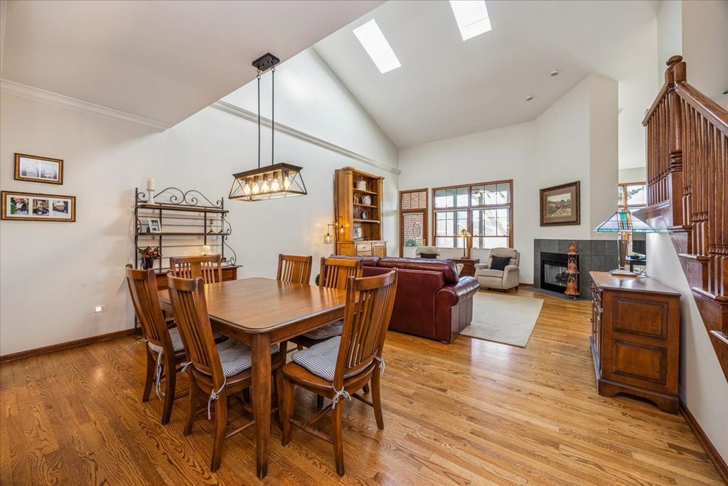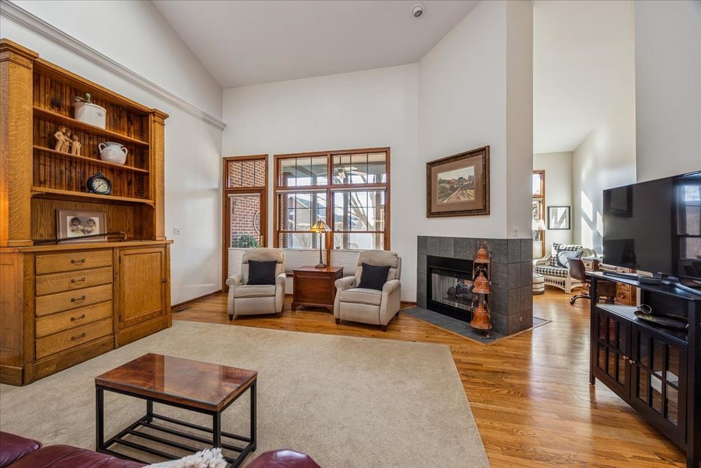 Timeless character defines this exceptionally spacious townhome, ideally located in the picturesque Founders Place community with tree-lined streets, charming gazebos, serene ponds and beautifully maintained homes. Inside, the home is flooded with natural light, gleaming hardwood floors and enhanced by dramatic vaulted and 9-foot ceilings on the main level. The impressive living room features soaring ceilings with skylights, a cozy multi-sided gas fireplace and a wet bar, perfect for both everyday living and entertaining. The open dining room flows seamlessly into the living space, while the inviting eat-in kitchen offers abundant cabinetry, quartz countertops, stainless steel appliances and a peninsula with seating. The expansive FIRST FLOOR primary suite serves as a private retreat, complete with a large walk-in closet and spa-like bath featuring a double vanity with makeup area, tub and separate shower. An adjacent sitting room/den with its own fireplace adds warmth and flexibility. Upstairs, a spacious open loft provides versatile living space, complemented by two large bedrooms with generous closets, an oversized full bathroom with double vanity. The nicely finished basement adds valuable living and recreational space, complete with a kitchenette and full bathroom. Relax year round in the charming three-season room or step outside to the new brick paver patio, surrounded by mature trees and lush landscaping that create a tranquil outdoor escape.