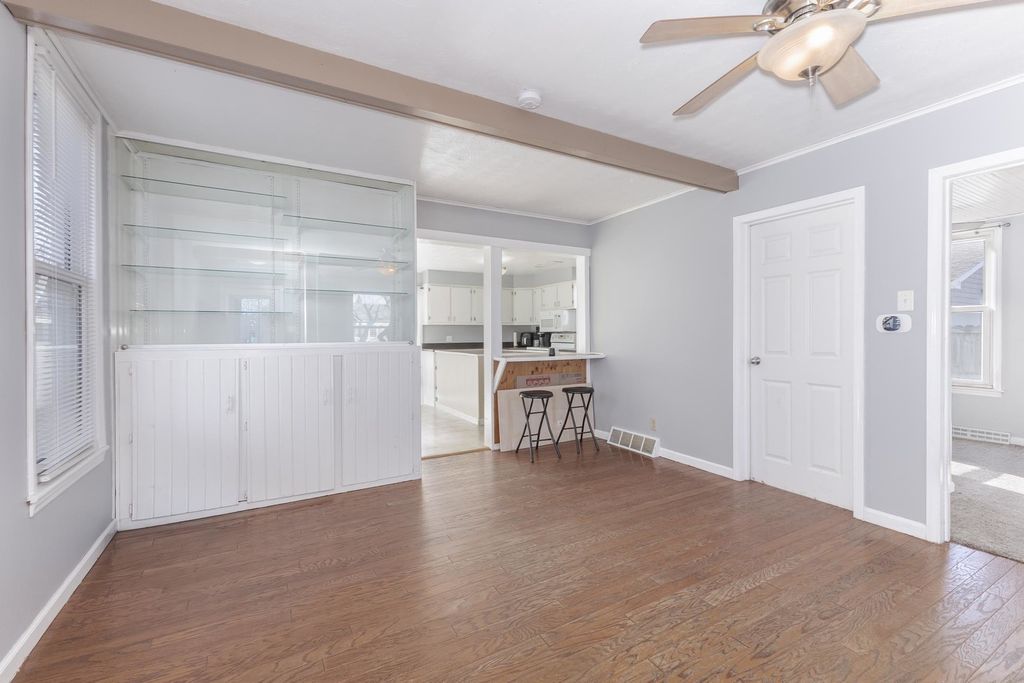 Located on Rt 24, with quick access to the interstate. This 3 bedroom home has an open feel. Dining room space with wall of built-ins to stay organized! White kitchen cabinets with large island, and dishwasher! Breakfast bar built in bedroom kitchen & dining room. Sliding door to patio space. 2 Main floor bedrooms and full bath with tiled shower surround & newer vanity. Upstairs is an additional (3rd) bedroom and attic space for more storage. Full basement with new furnace (2025!) 2-Car detached garage with alley access. Newer concrete patio just completed for your upcoming summer bbq's!