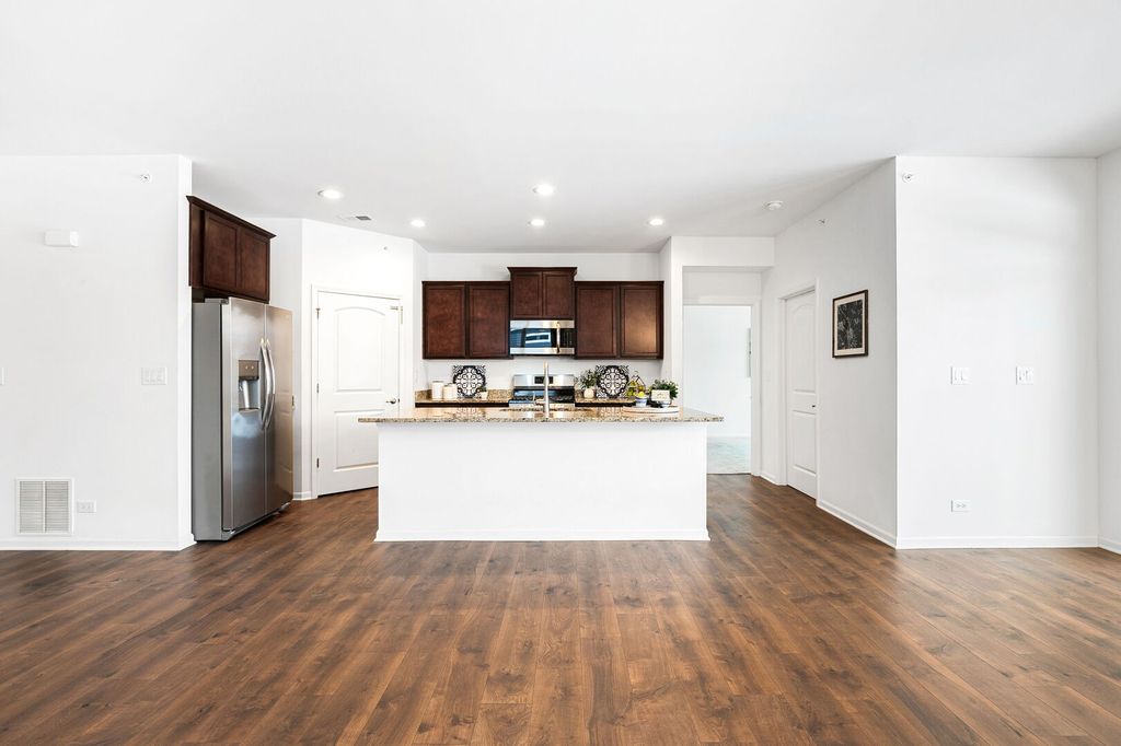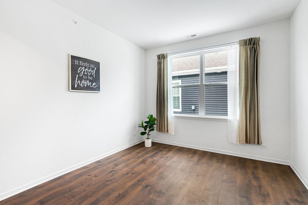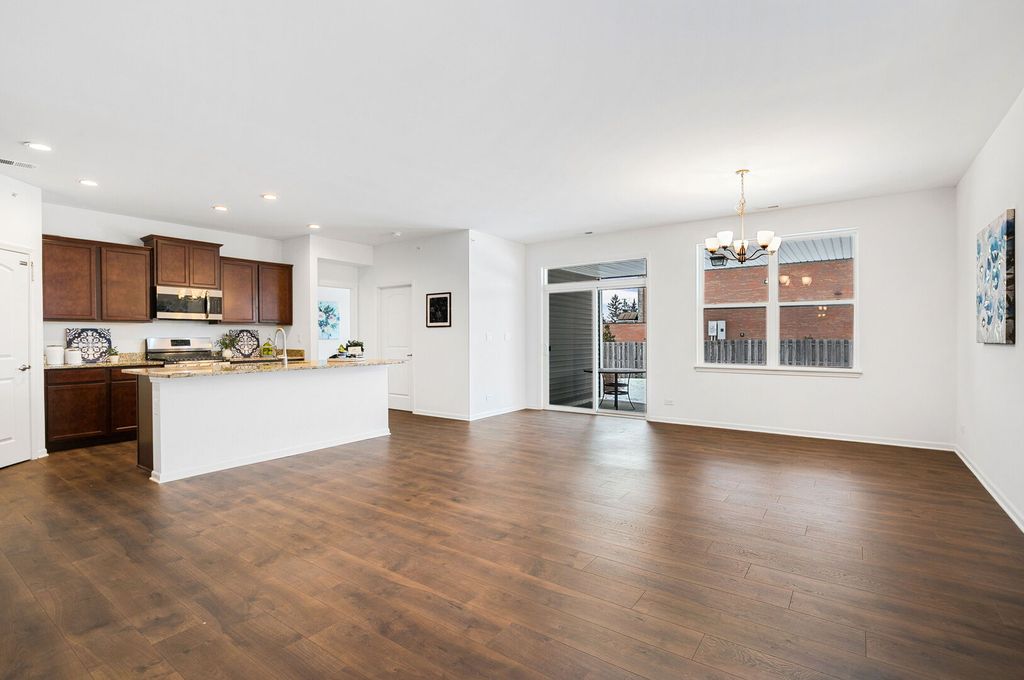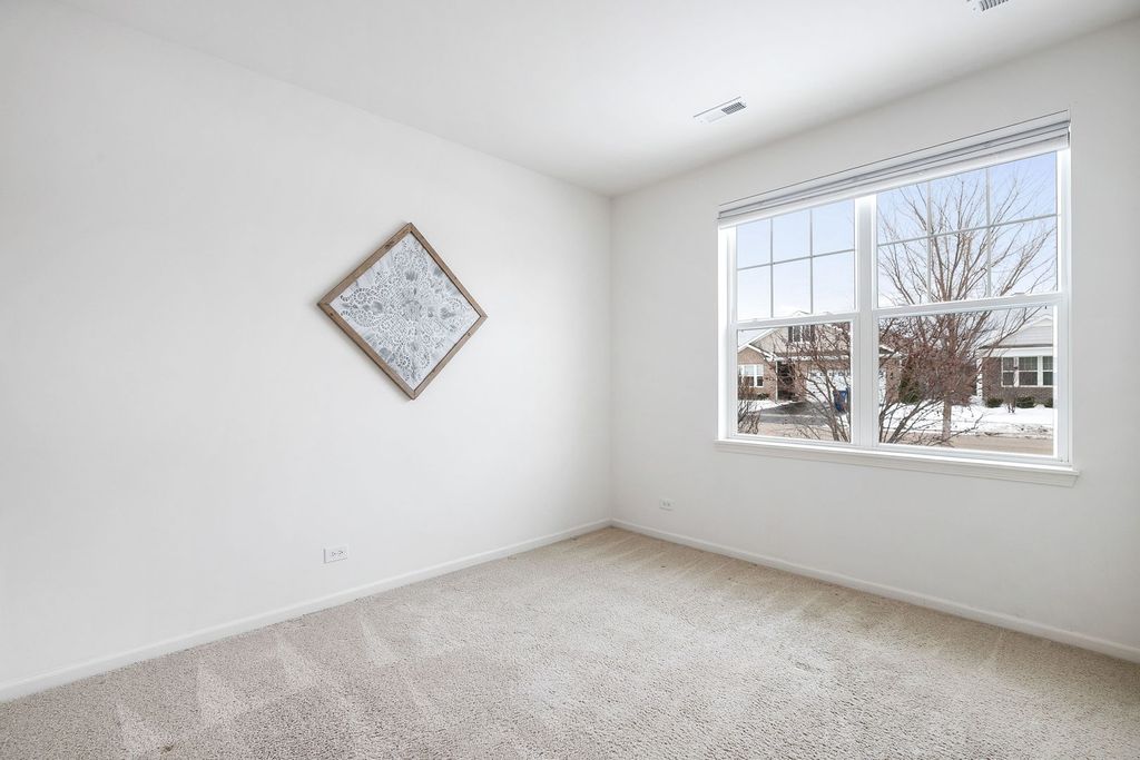 This well-designed ranch offers comfortable single-level living with two generously proportioned bedrooms, two full bathrooms, a two-car garage, a spacious primary suite, a flexible bonus room, and a large, functional kitchen. With an open concept, the bright kitchen provides ample granite workspace, stylish cabinetry accented with crown molding, stainless steel appliances, recessed lighting, and a substantial island that flows seamlessly into the expansive great room-ideal for gatherings and everyday living. Off the kitchen, the primary bedroom has great natural light and the ensuite includes a dual-sink vanity, linen storage, an oversized walk-in closet, ceramic tile finishes, and a glass-enclosed shower. There's a flex room that serves as a great home office plus a second bedroom for guests. Situated in the desirable Wentworth community of Gurnee, this attractive, low-maintenance home enjoys access to a scenic lake, walking trails, and picnic areas. Conveniently located near shopping, dining, Gurnee Mills Mall, Six Flags, Great Wolf Lodge, and many other local attractions.