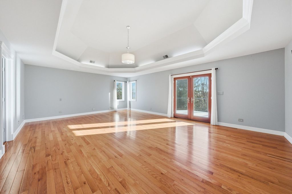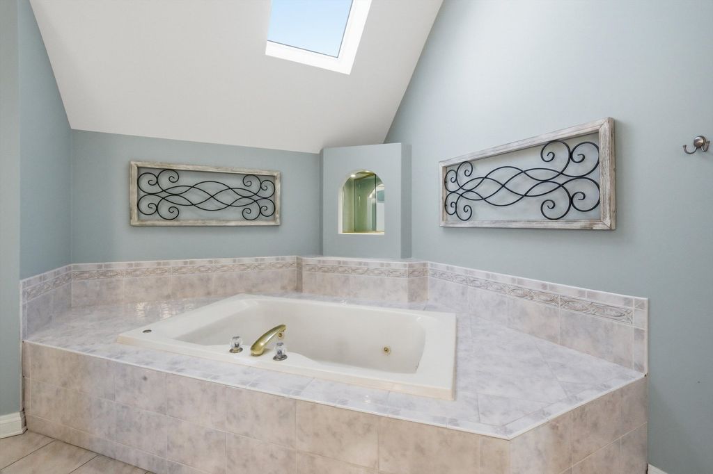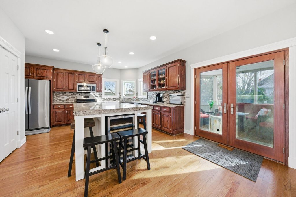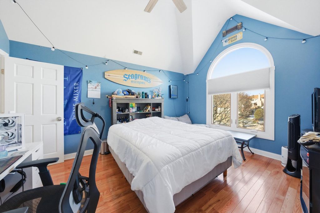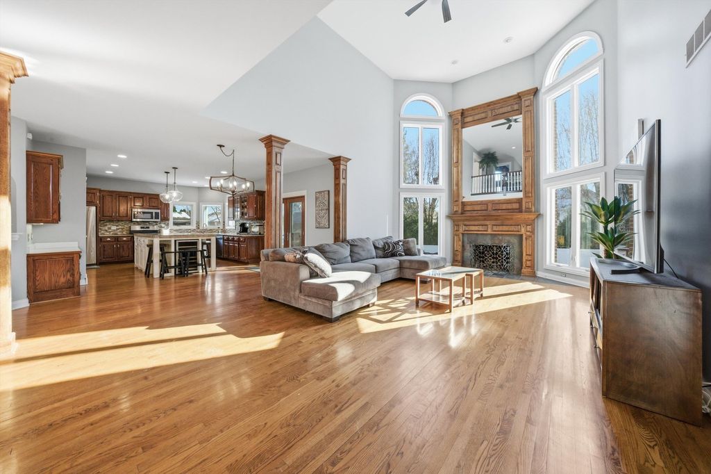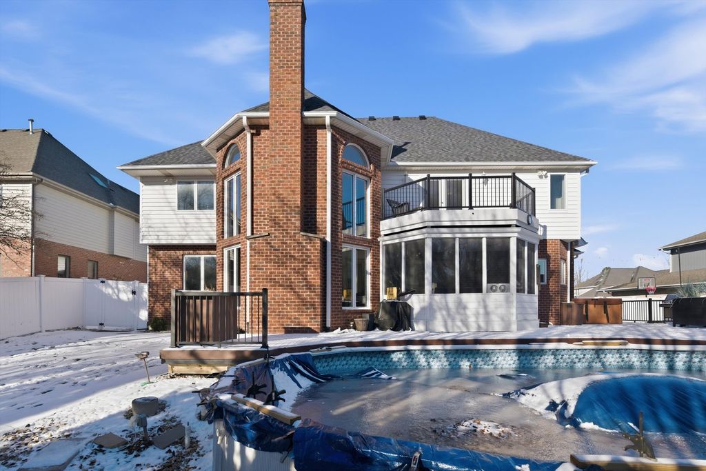 Spacious and elegant, this sun-filled home offers an open floor plan designed for both comfort and style. Hardwood floors extend throughout the home, complemented by classic oak six-panel doors and abundant natural light. Dramatic cathedral ceilings highlight the family room's stunning two-story fireplace and continue into the upper-level bedrooms, creating an airy and grand atmosphere. The modern eat-in kitchen is a chef's delight, featuring granite countertops, oak cabinetry, a double-door pantry, stainless steel appliances, and a fully equipped center island. The luxurious primary suite includes a private deck terrace, a spa-like bath with a skylight above the Jacuzzi tub, and an impressive 14x14 model-style walk-in closet. French doors open to a screened sunroom overlooking a composite deck and built-in pool, all set within a fully fenced backyard enhanced with low-maintenance turf-perfect for entertaining or relaxing. Additional highlights include a heated garage with new garage doors, a new roof, newer windows, and a new water heater, offering peace of mind and modern efficiency. This exceptional home features 4 bedrooms, 2.5 baths, and a seamless blend of elegance, functionality, and thoughtful upgrades throughout.