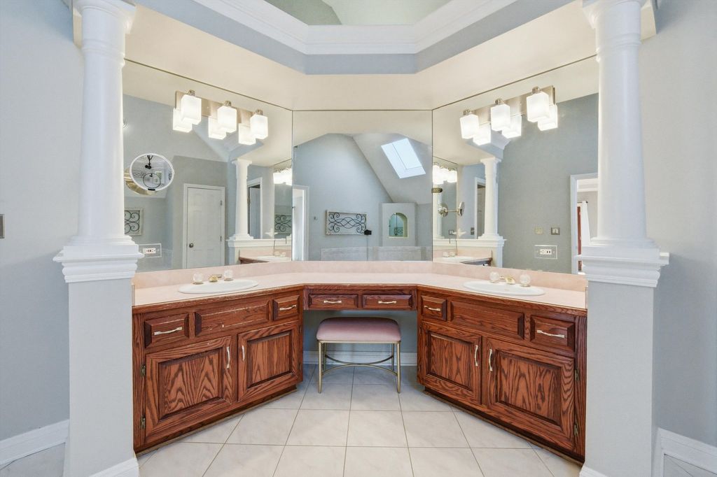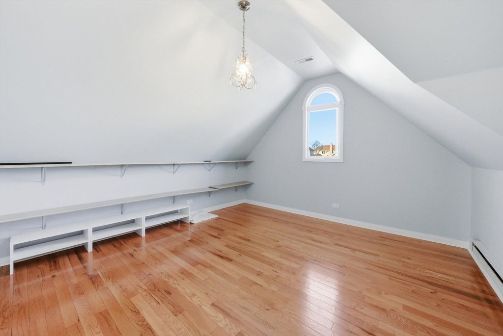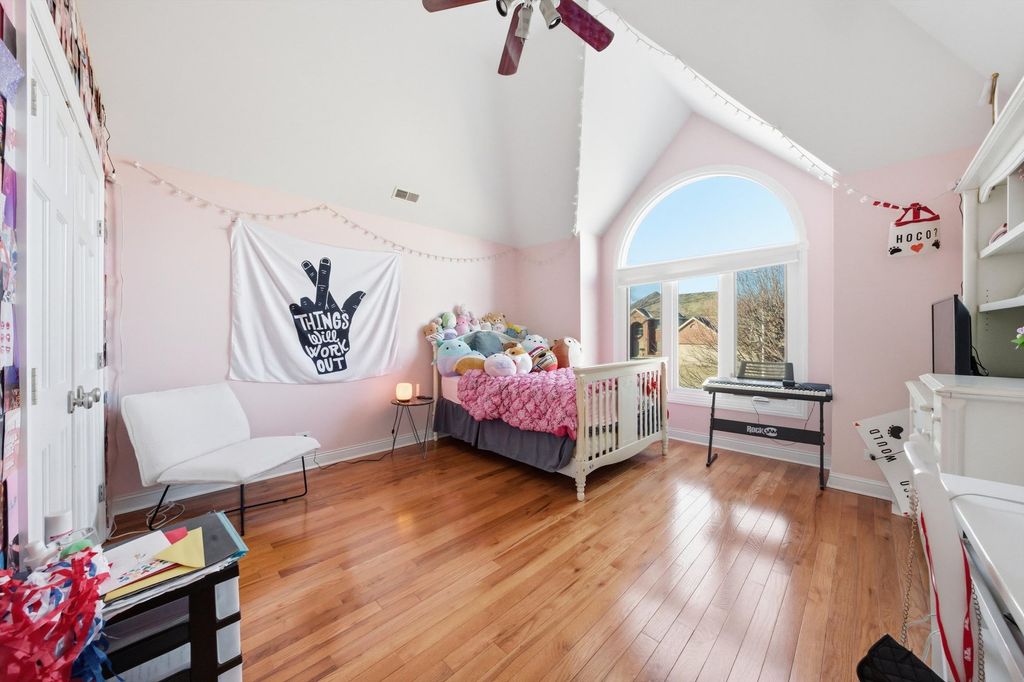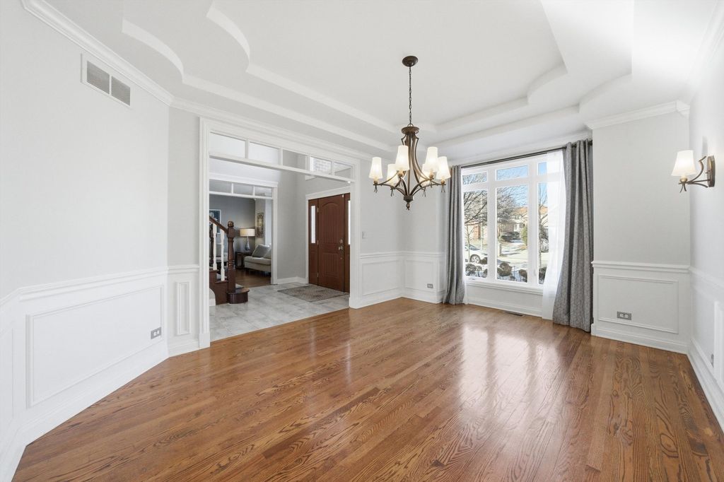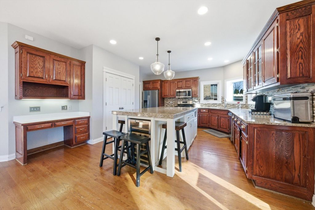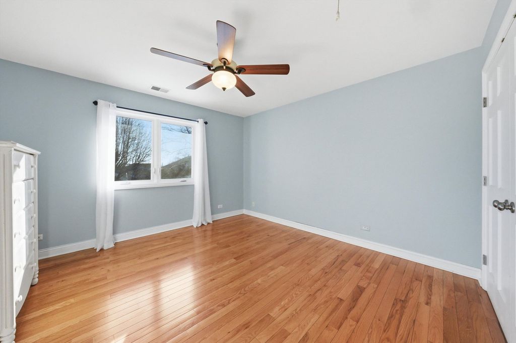 Spacious and elegant, this sun-filled home offers an open floor plan designed for both comfort and style. Hardwood floors extend throughout the home, complemented by classic oak six-panel doors and abundant natural light. Dramatic cathedral ceilings highlight the family room's stunning two-story fireplace and continue into the upper-level bedrooms, creating an airy and grand atmosphere. The modern eat-in kitchen is a chef's delight, featuring granite countertops, oak cabinetry, a double-door pantry, stainless steel appliances, and a fully equipped center island. The luxurious primary suite includes a private deck terrace, a spa-like bath with a skylight above the Jacuzzi tub, and an impressive 14x14 model-style walk-in closet. French doors open to a screened sunroom overlooking a composite deck and built-in pool, all set within a fully fenced backyard enhanced with low-maintenance turf-perfect for entertaining or relaxing. Additional highlights include a heated garage with new garage doors, a new roof, newer windows, and a new water heater, offering peace of mind and modern efficiency. This exceptional home features 4 bedrooms, 2.5 baths, and a seamless blend of elegance, functionality, and thoughtful upgrades throughout.