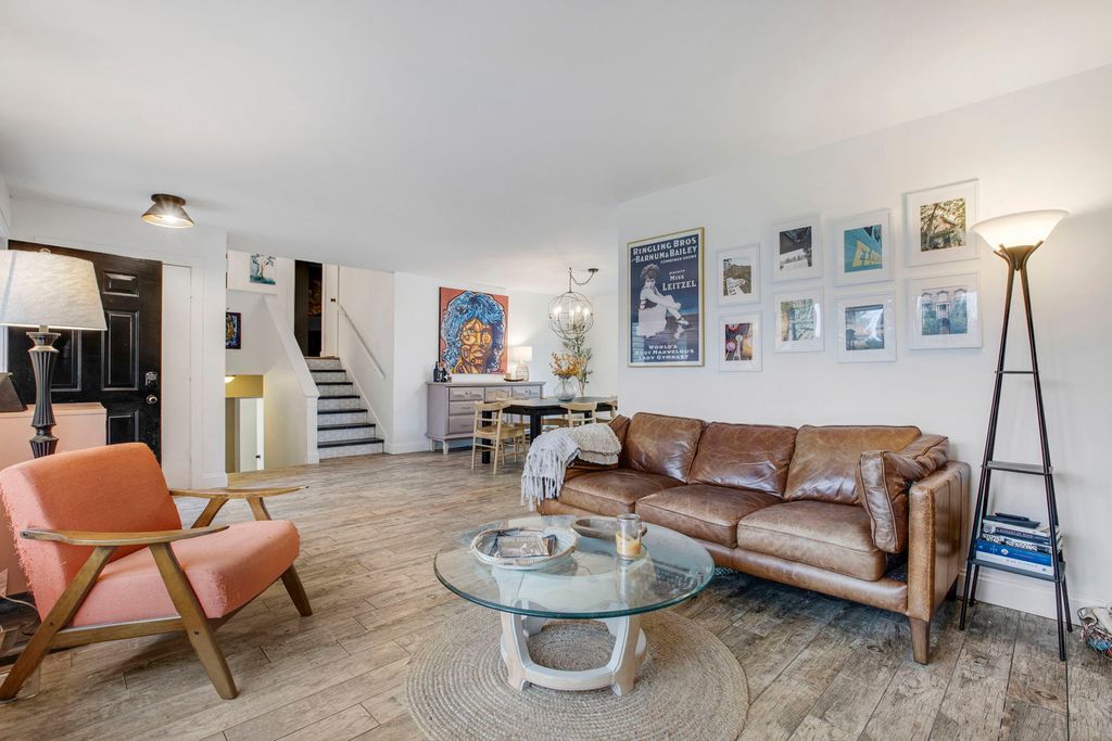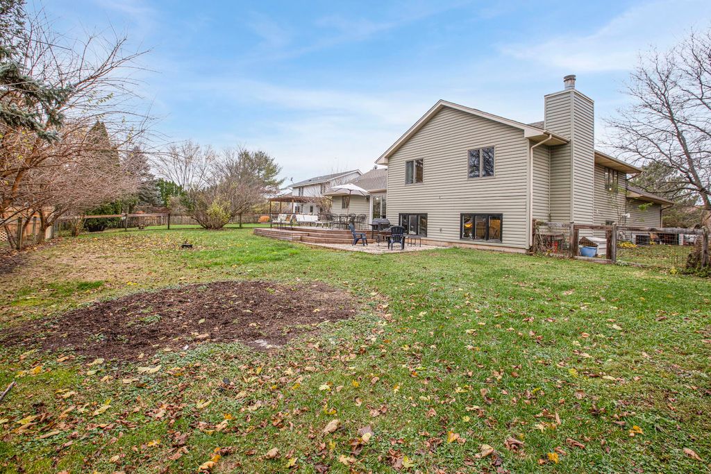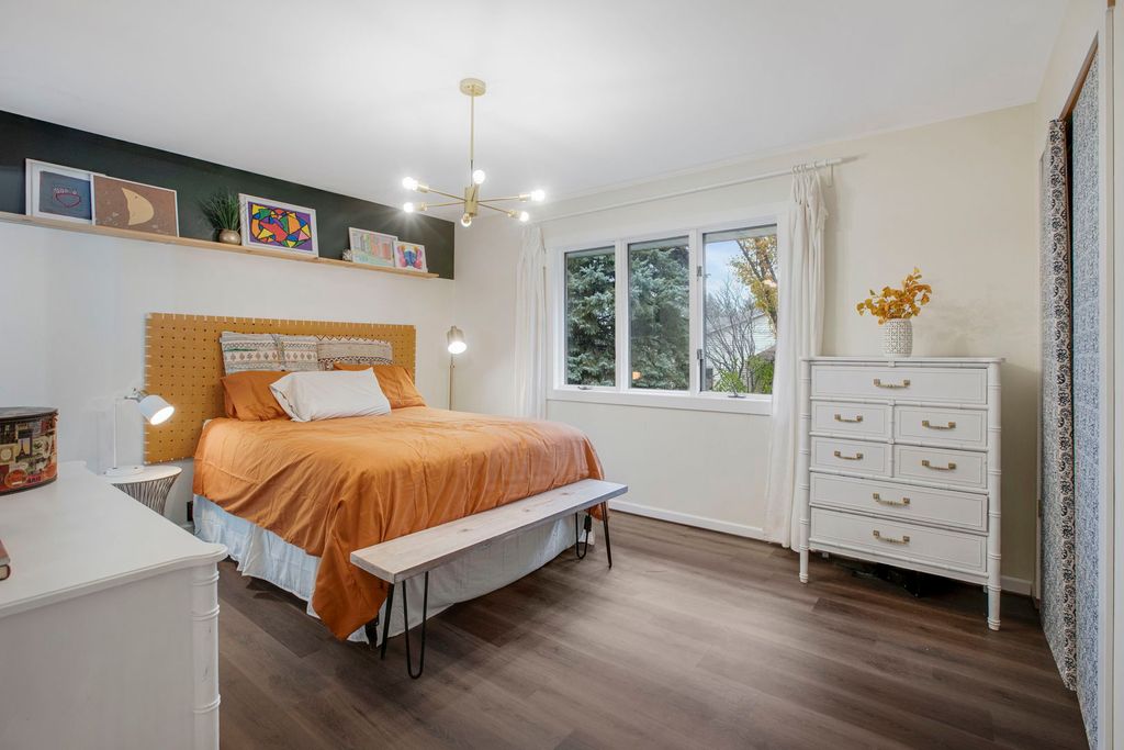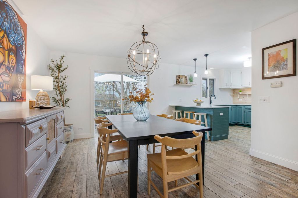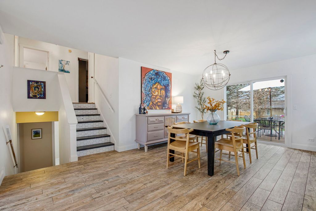Stunning Mid-Century Modern Split-Level! This expertly renovated 4-bedroom, 2.5-bathroom home seamlessly blends classic architecture with contemporary updates. The striking exterior features sophisticated painted brick, contrasting black windows, and custom wood trim. Step inside to discover an open-concept main level showcasing ceramic wood tile throughout. The inviting living room boasts a statement bay window, modern electric fireplace, and custom built-in shelving. The newly remodeled eat-in kitchen features attractive quartz countertops, custom backsplash, stainless steel appliances, and a breakfast bar with seating for two. Adjacent to the kitchen, find a spacious dining room illuminated by mid-century lighting and accessed through an oversized sliding door. Step outside to your private oasis-a fully fenced third-acre lot featuring a generous deck perfect for entertaining, plus a cozy mid-mod paver patio with fire pit area. Storage shed included! The upper level, finished in brand new luxury vinyl plank flooring, features two spacious additional bedrooms with ample closets and a shared hall bath. The primary suite on this level impresses with a double closet and private ensuite bathroom. The lower level, also showcasing new luxury vinyl plank floors, continues to deliver with an expansive family room/office space, fourth bedroom, half bathroom, direct access to the 2.5 car garage with a shop, and laundry area with new water heater. Don't miss this masterfully crafted mid-century retreat-schedule your showing today!